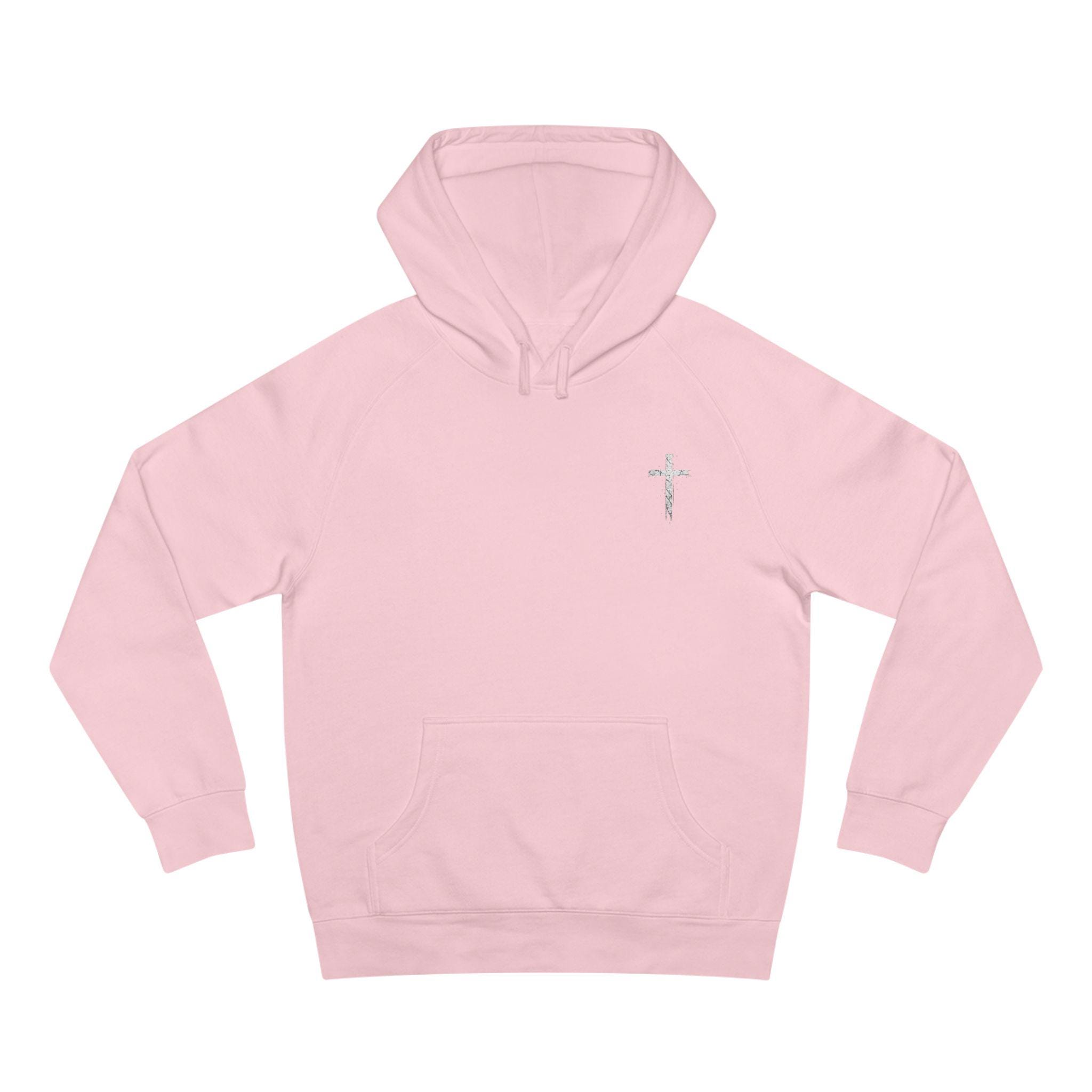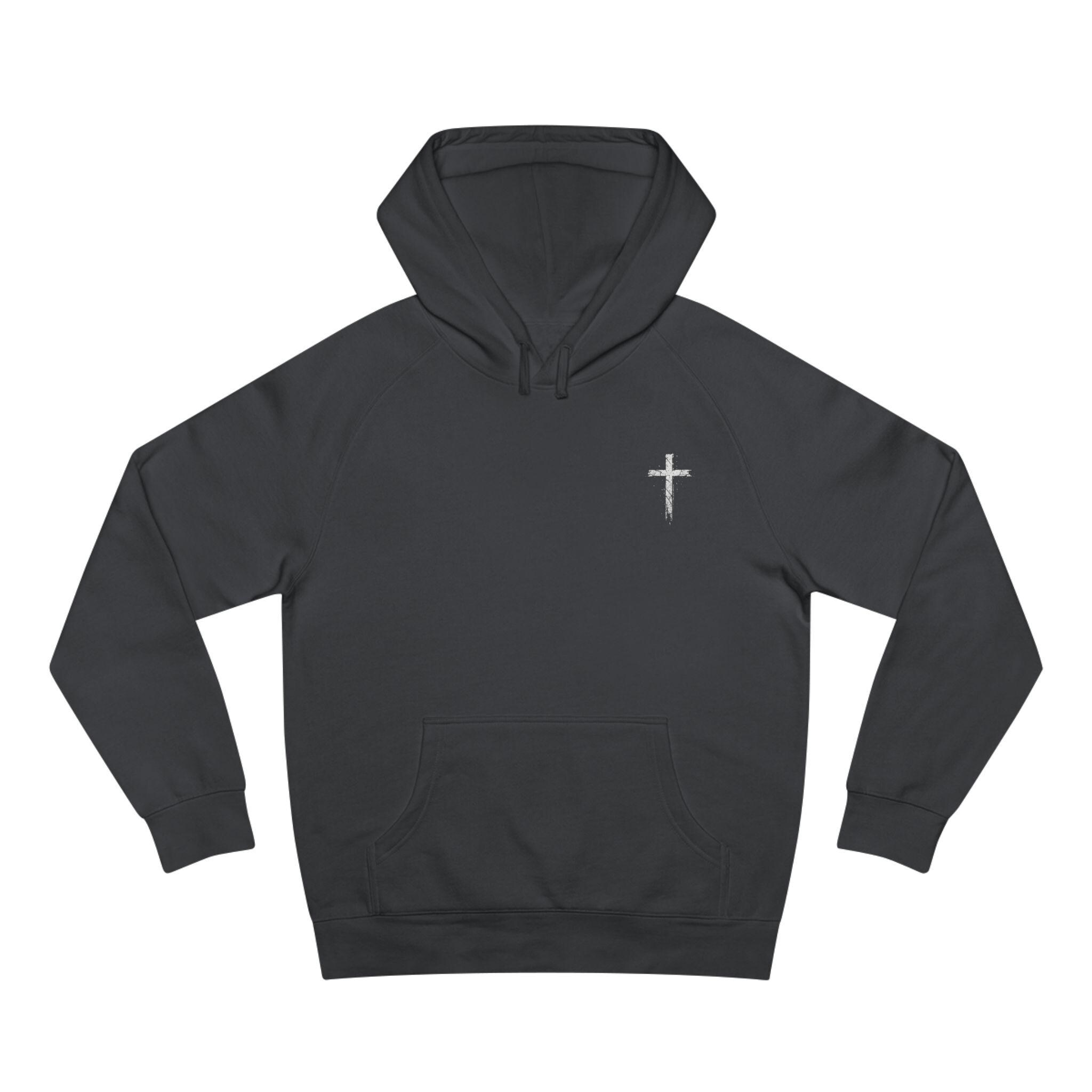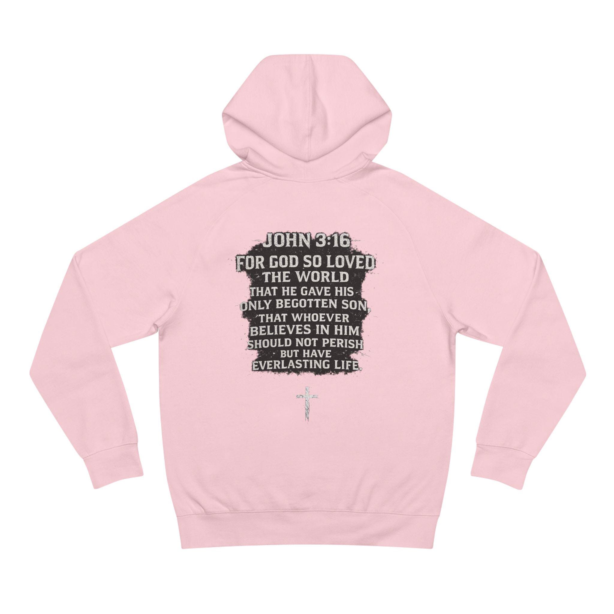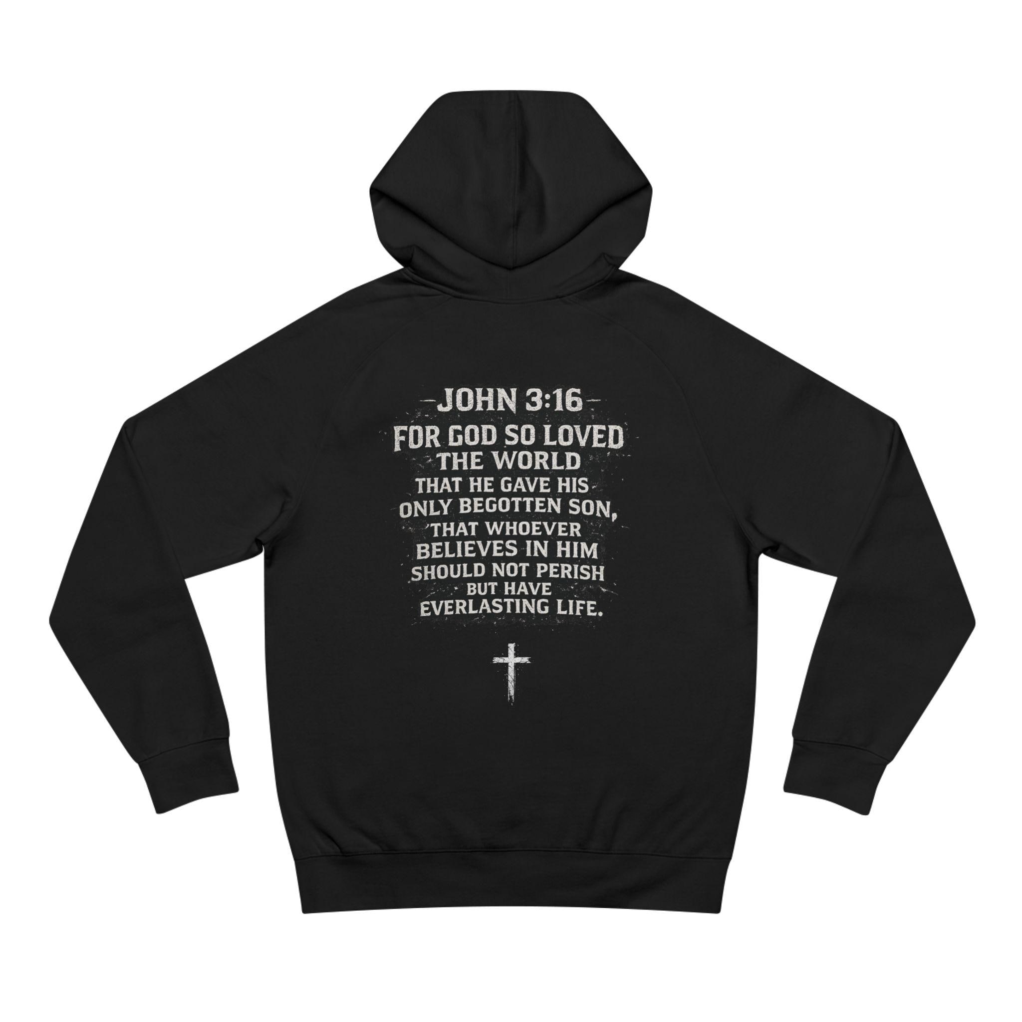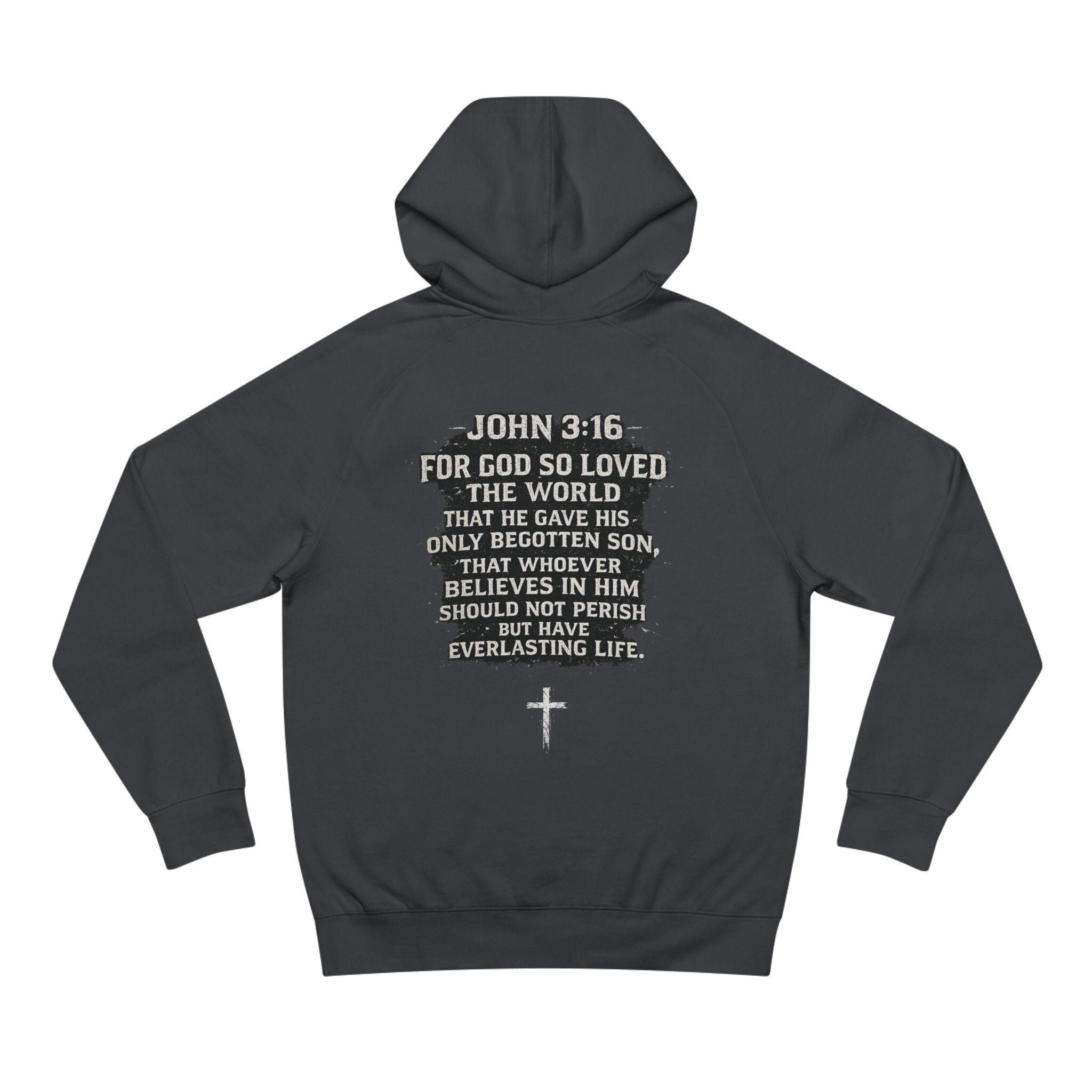A comfortably weighted hoodie that carries a quiet, reverent presence. Built from a smooth cotton-poly blend, it feels soft against the skin while holding its shape through repeated wear. The front bears a subtle chest cross, minimal and contemplative. On the back, a bold typographic treatment of John 3:16 sits within a textured silhouette, turning a familiar verse into wearable devotion. The roomy kangaroo pocket and adjustable drawstring hood make it easy to layer on cool mornings or drape over shoulders after evening services. It settles into daily routines — church nights, volunteer shifts, and slow coffee mornings — as a calm, steady reminder of faith.