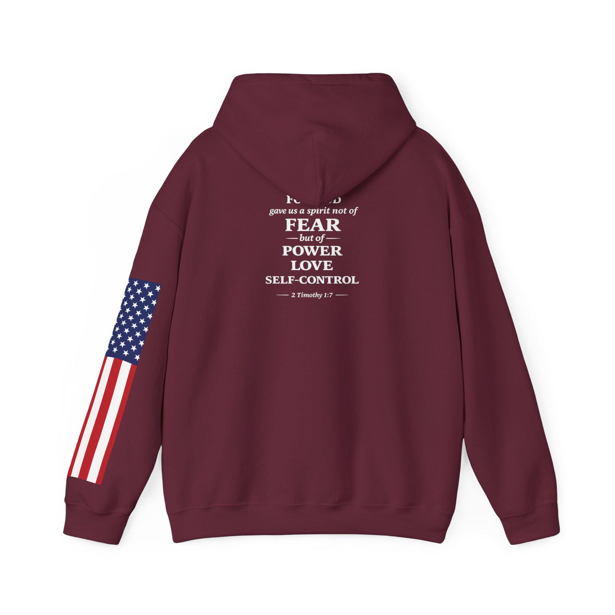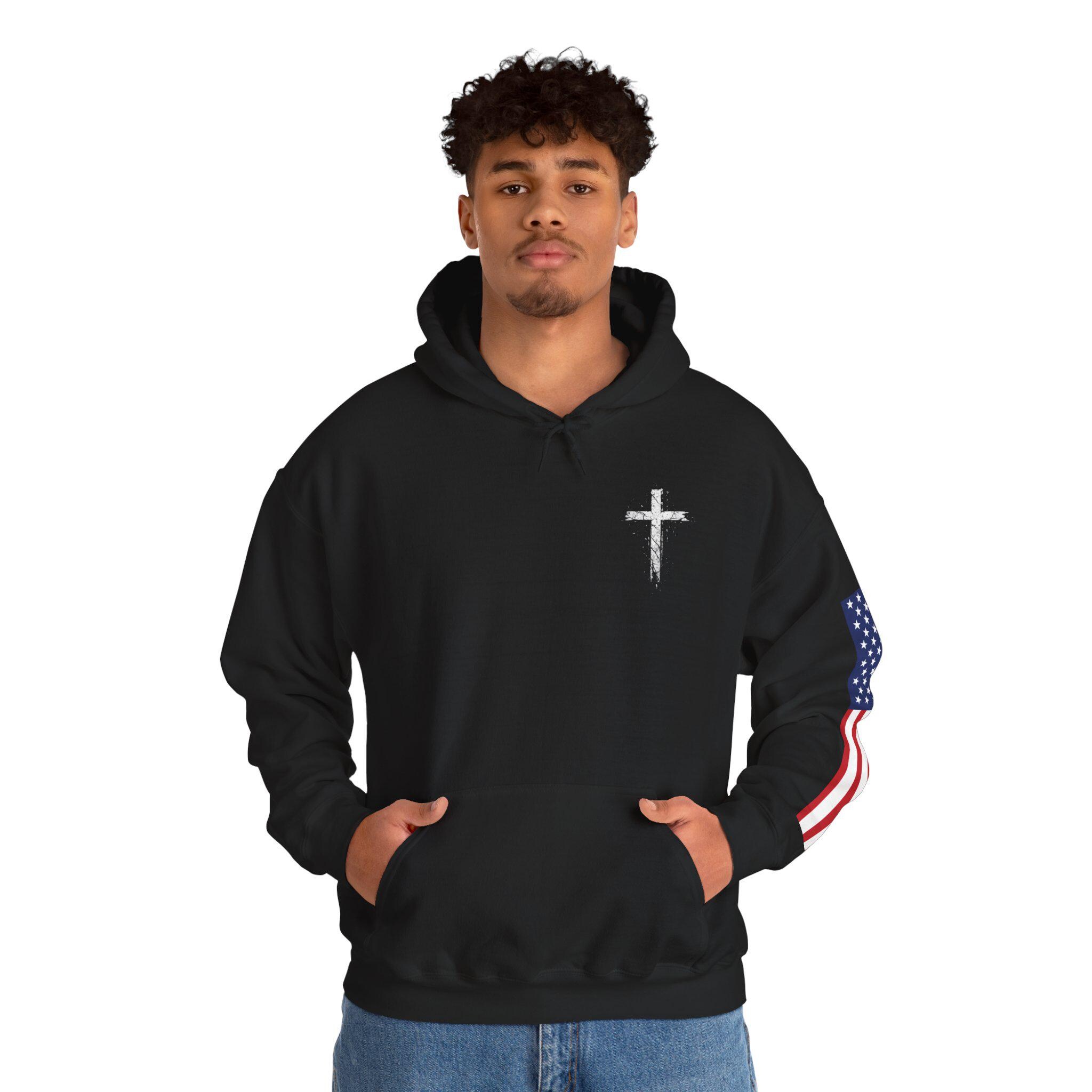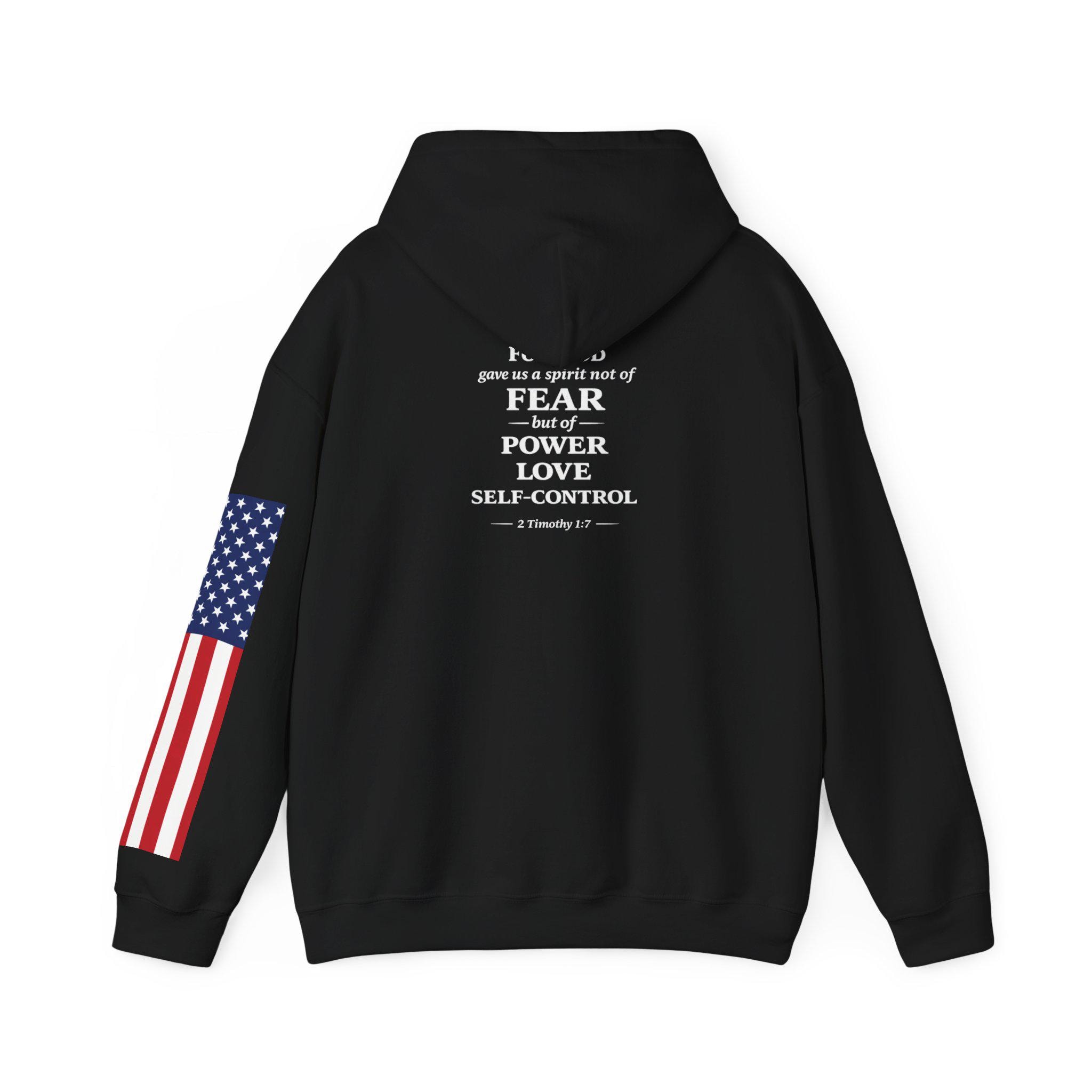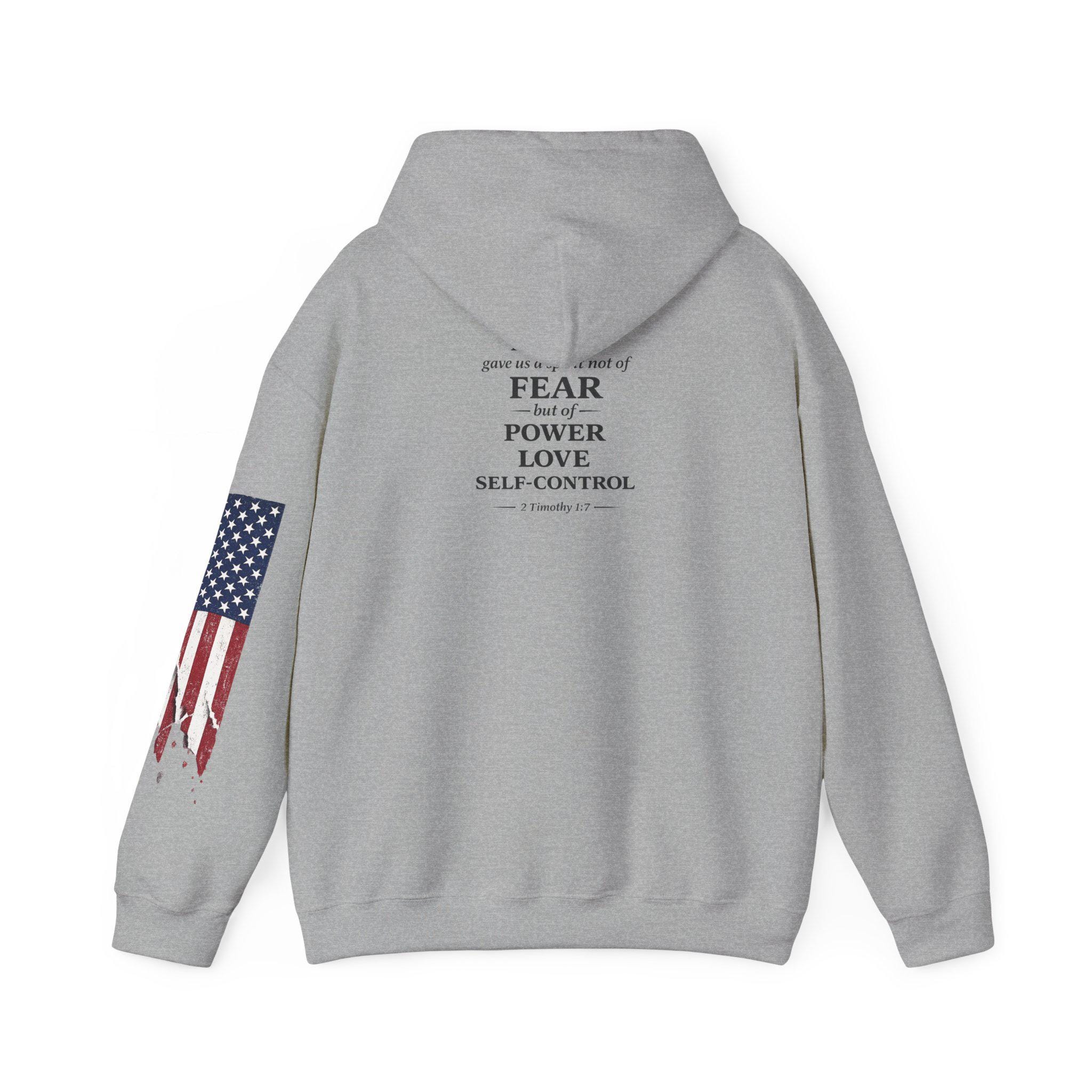 Soft, warm, and quietly bold — this hoodie wraps faith and country into one lived-in piece. The small cross over the heart reads like a private promise; the distressed American flag on the sleeve brings a rugged, honest edge. On the back, the layered text (faith, power, love, self-control) 2 Timothy 1:7. you can carry through errands, early mornings, or late-night drives. It settles into your routine: over a tee for church volunteer days, under a coat at community events, or just for coffee with friends. Comfortable, sturdy, and subtly expressive — it’s made to be lived in and to speak without shouting.