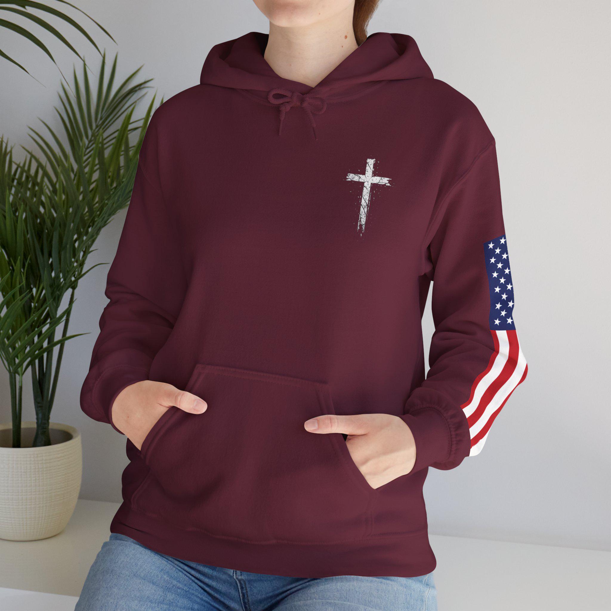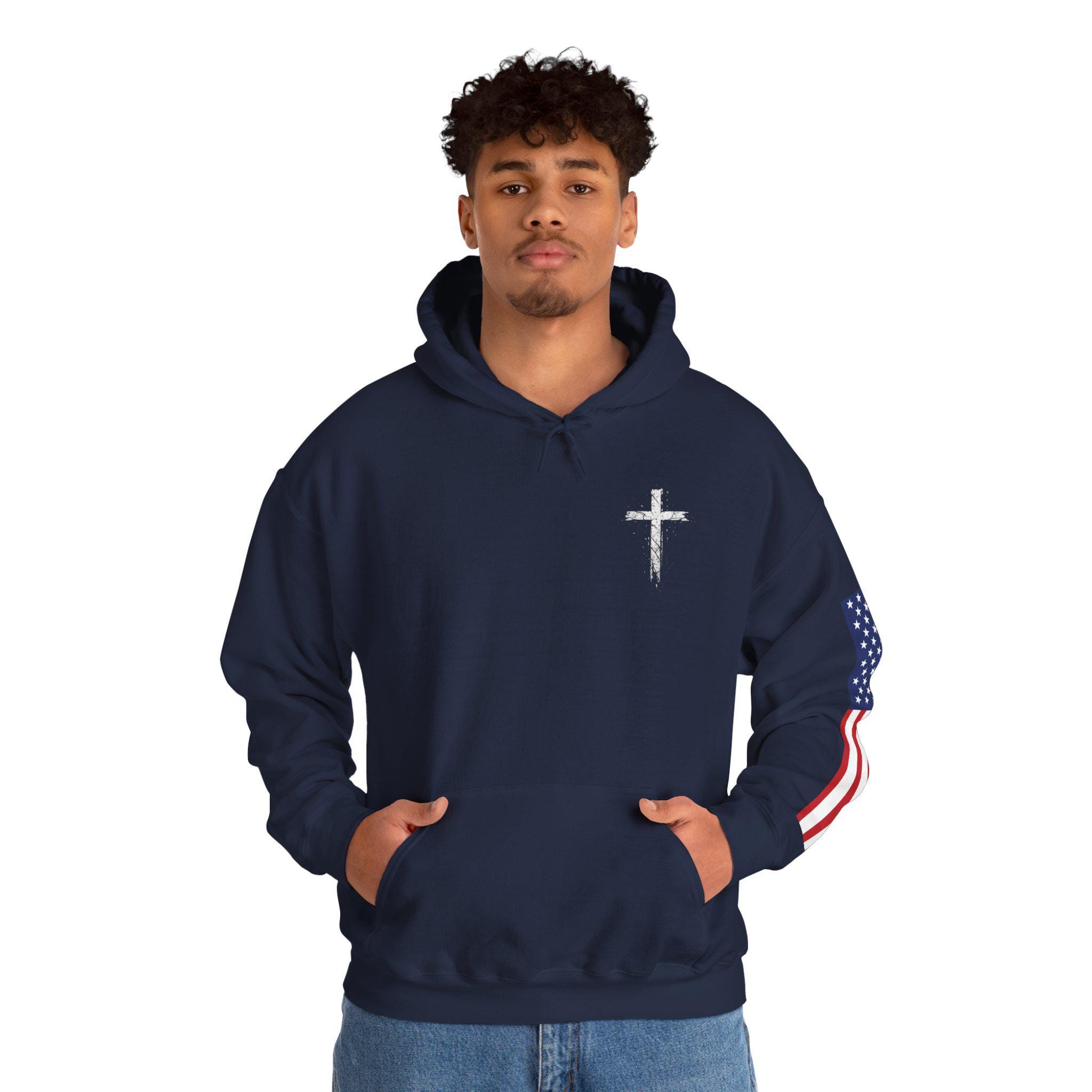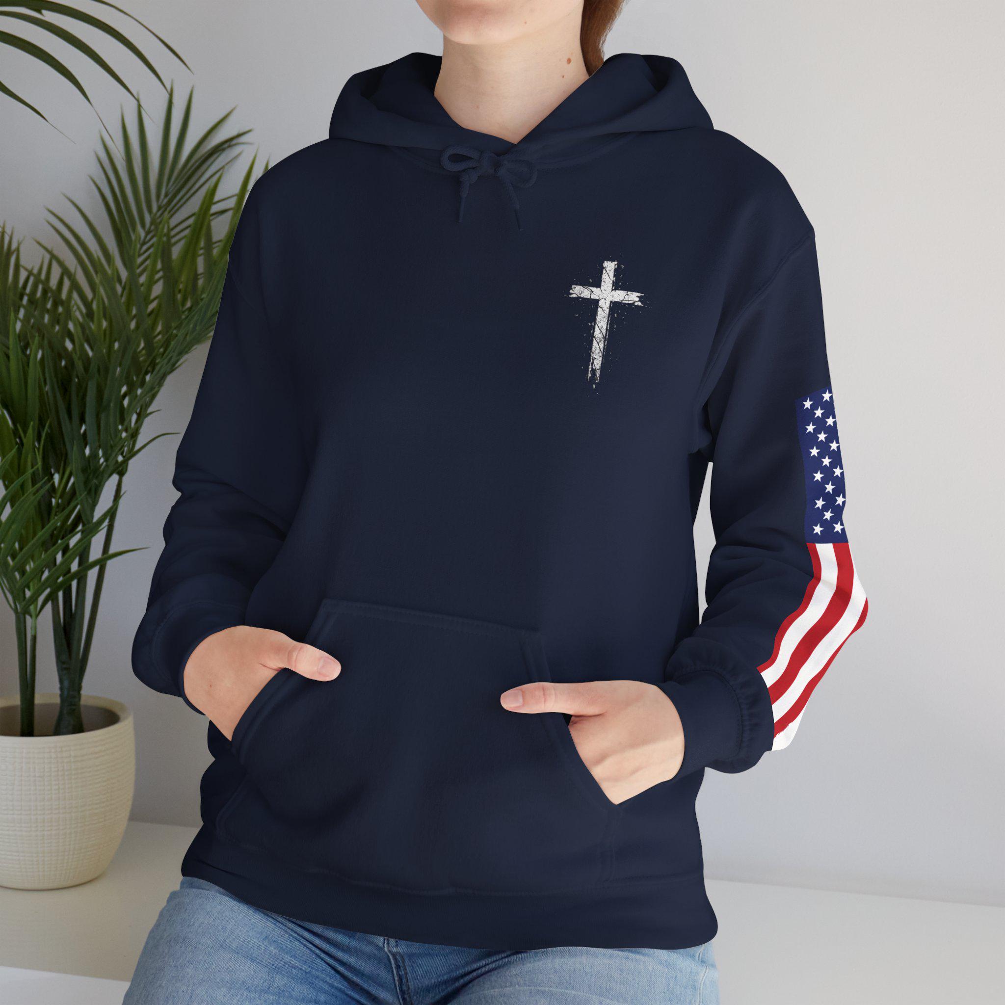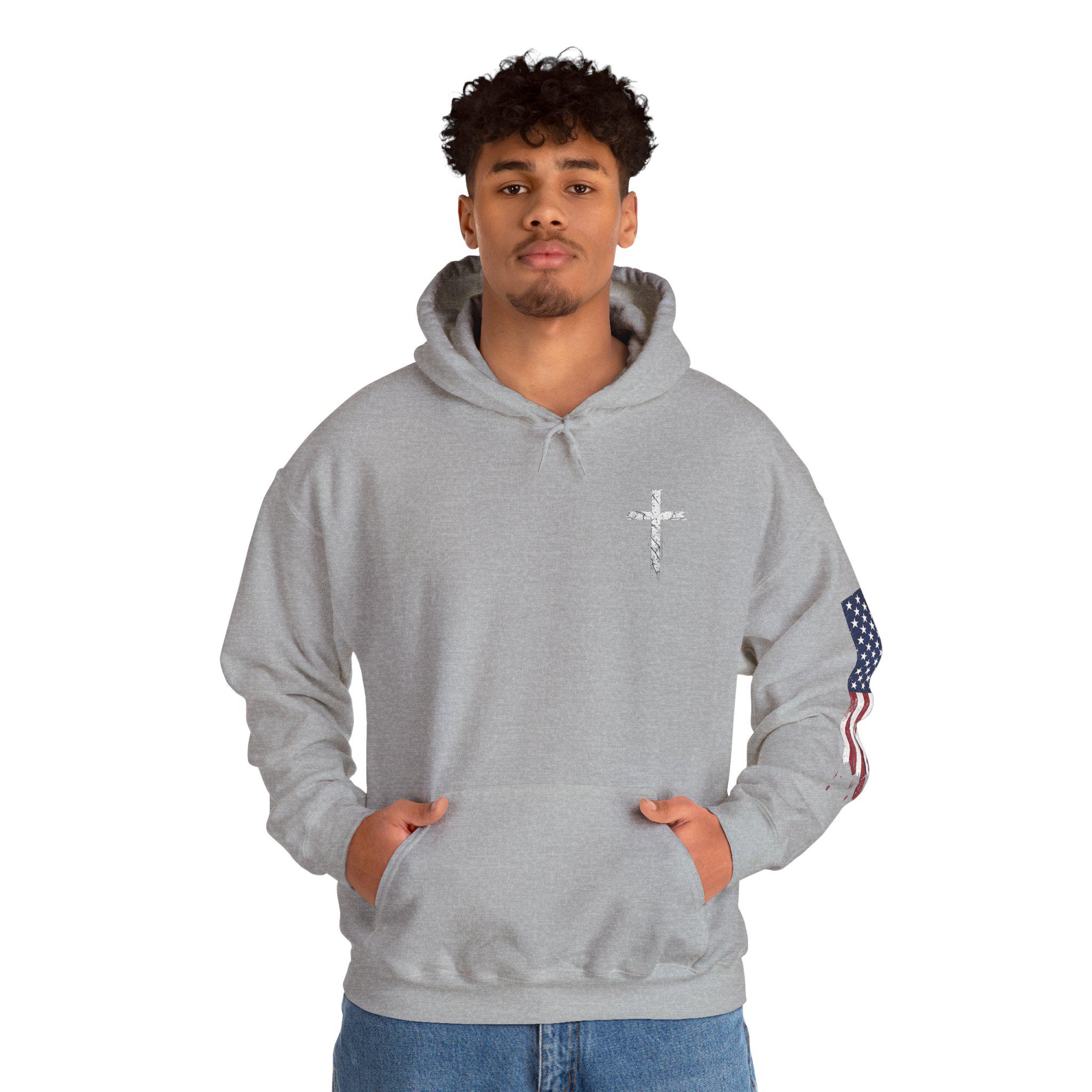 Soft, warm, and quietly bold — this hoodie wraps faith and country into one lived-in piece. The small cross over the heart reads like a private promise; the distressed American flag on the sleeve brings a rugged, honest edge. On the back, the layered text (faith, power, love, self-control) 2 Timothy 1:7. you can carry through errands, early mornings, or late-night drives. It settles into your routine: over a tee for church volunteer days, under a coat at community events, or just for coffee with friends. Comfortable, sturdy, and subtly expressive — it’s made to be lived in and to speak without shouting.