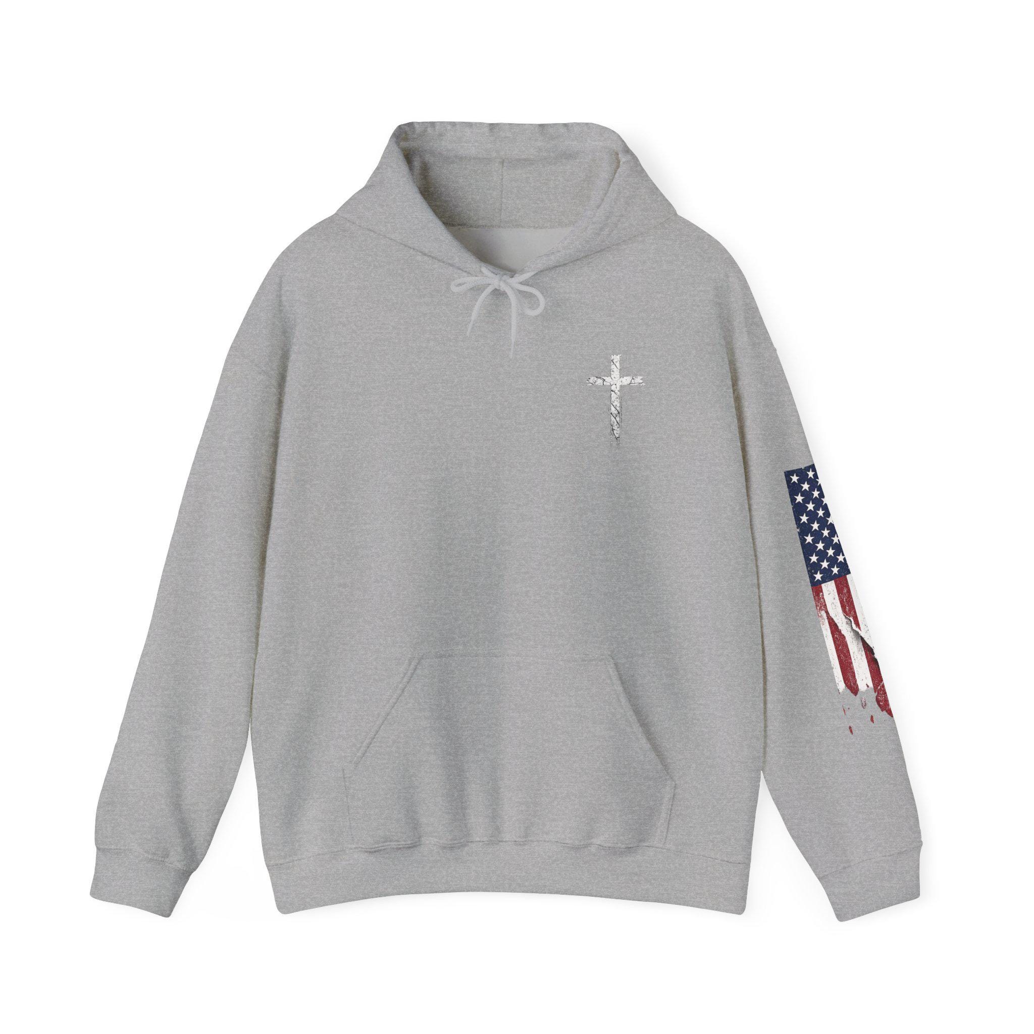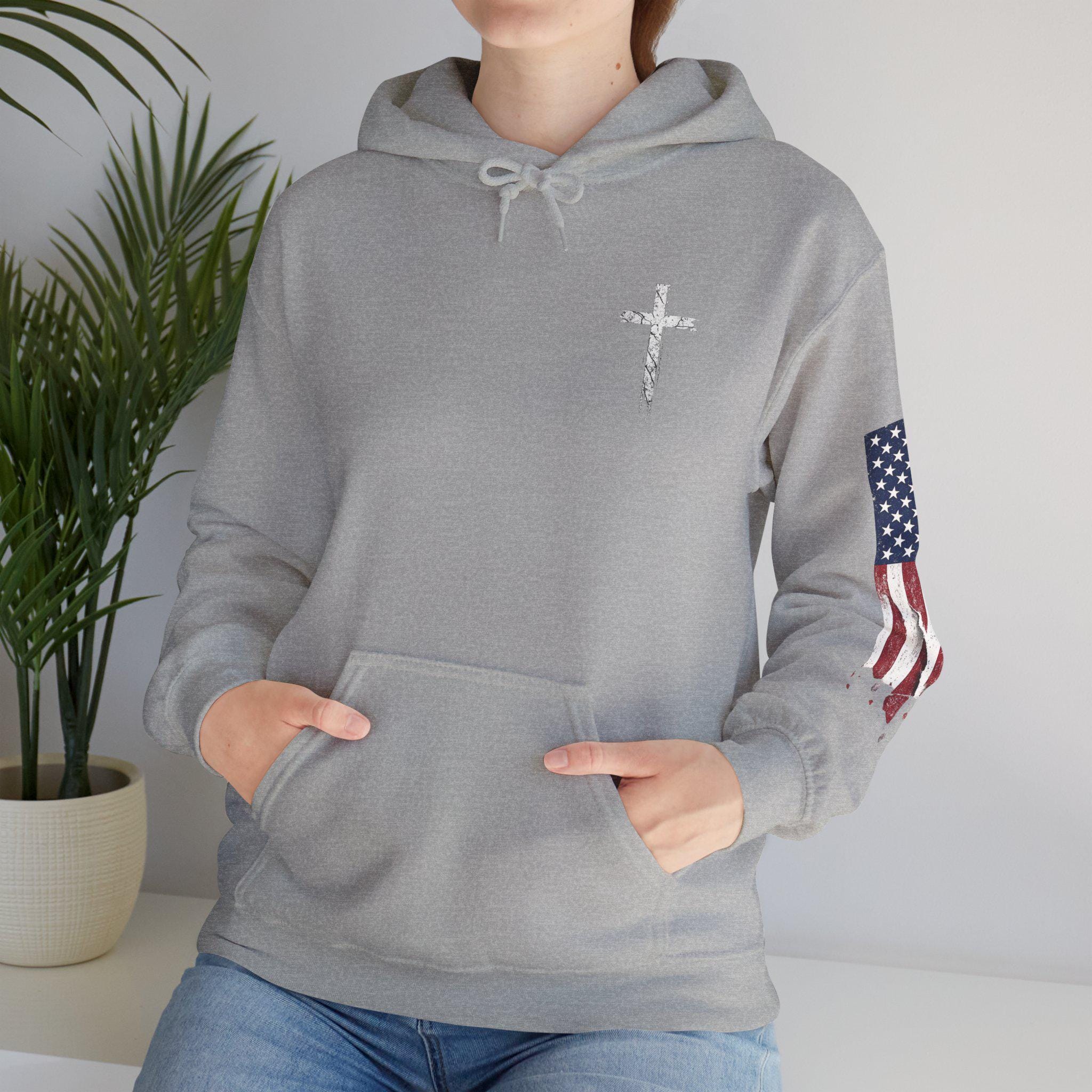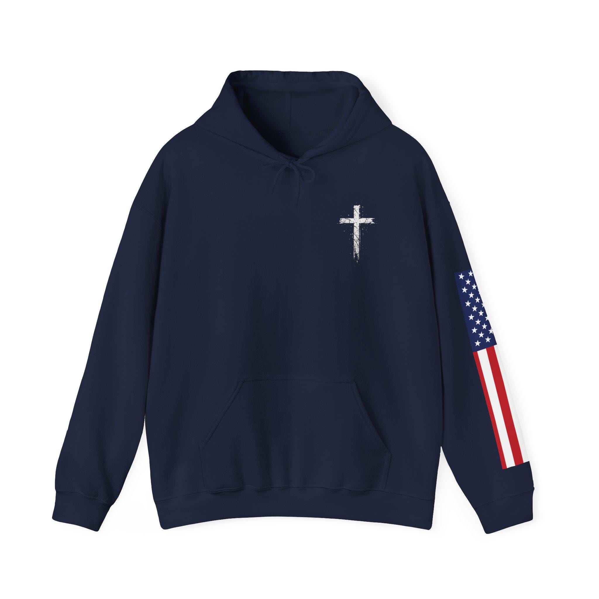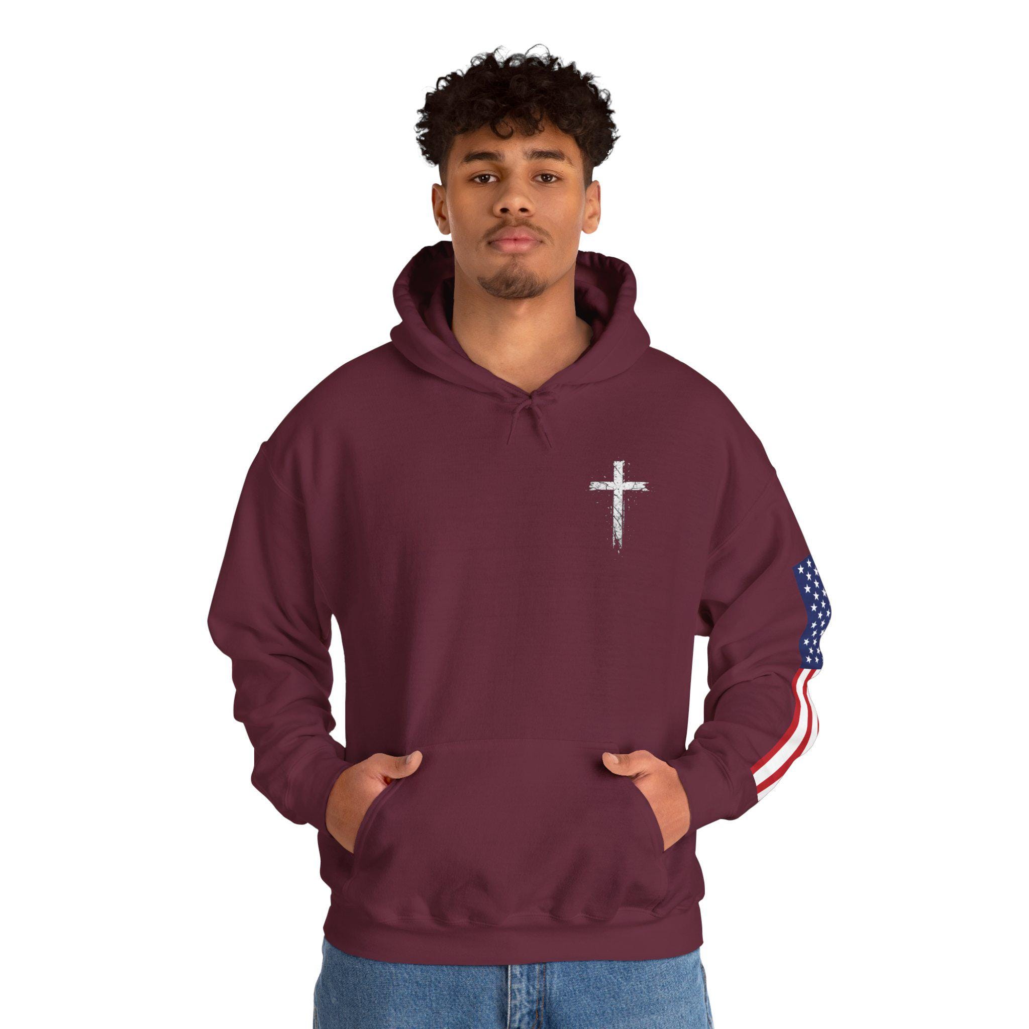 Soft, warm, and quietly bold — this hoodie wraps faith and country into one lived-in piece. The small cross over the heart reads like a private promise; the distressed American flag on the sleeve brings a rugged, honest edge. On the back, the layered text (faith, power, love, self-control) 2 Timothy 1:7. you can carry through errands, early mornings, or late-night drives. It settles into your routine: over a tee for church volunteer days, under a coat at community events, or just for coffee with friends. Comfortable, sturdy, and subtly expressive — it’s made to be lived in and to speak without shouting.