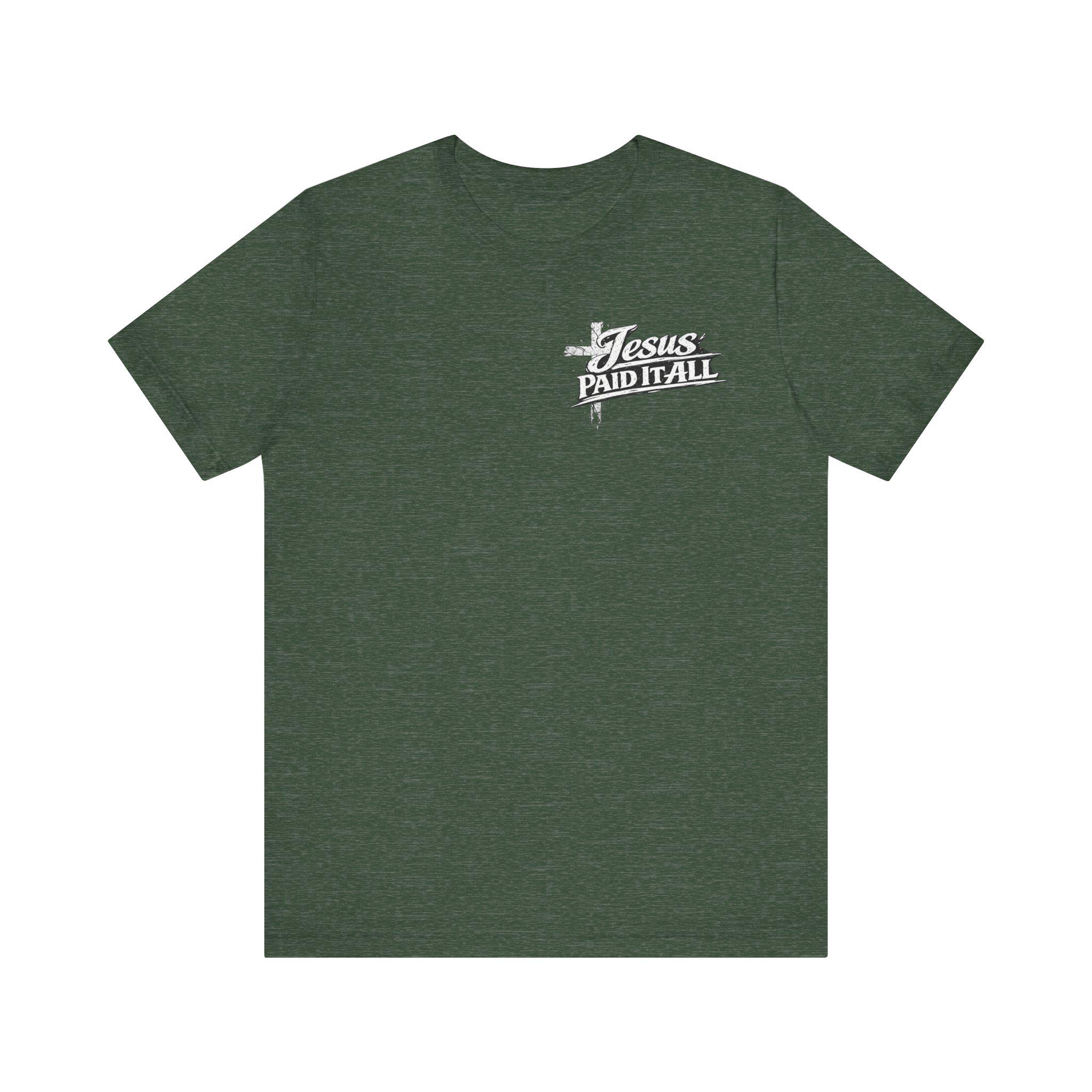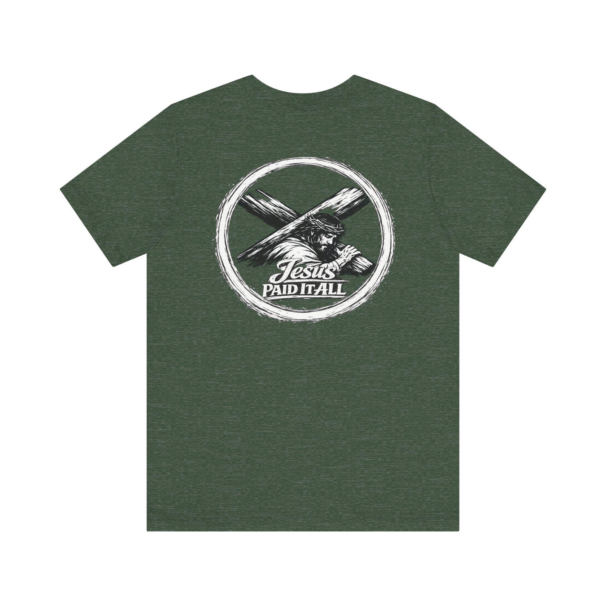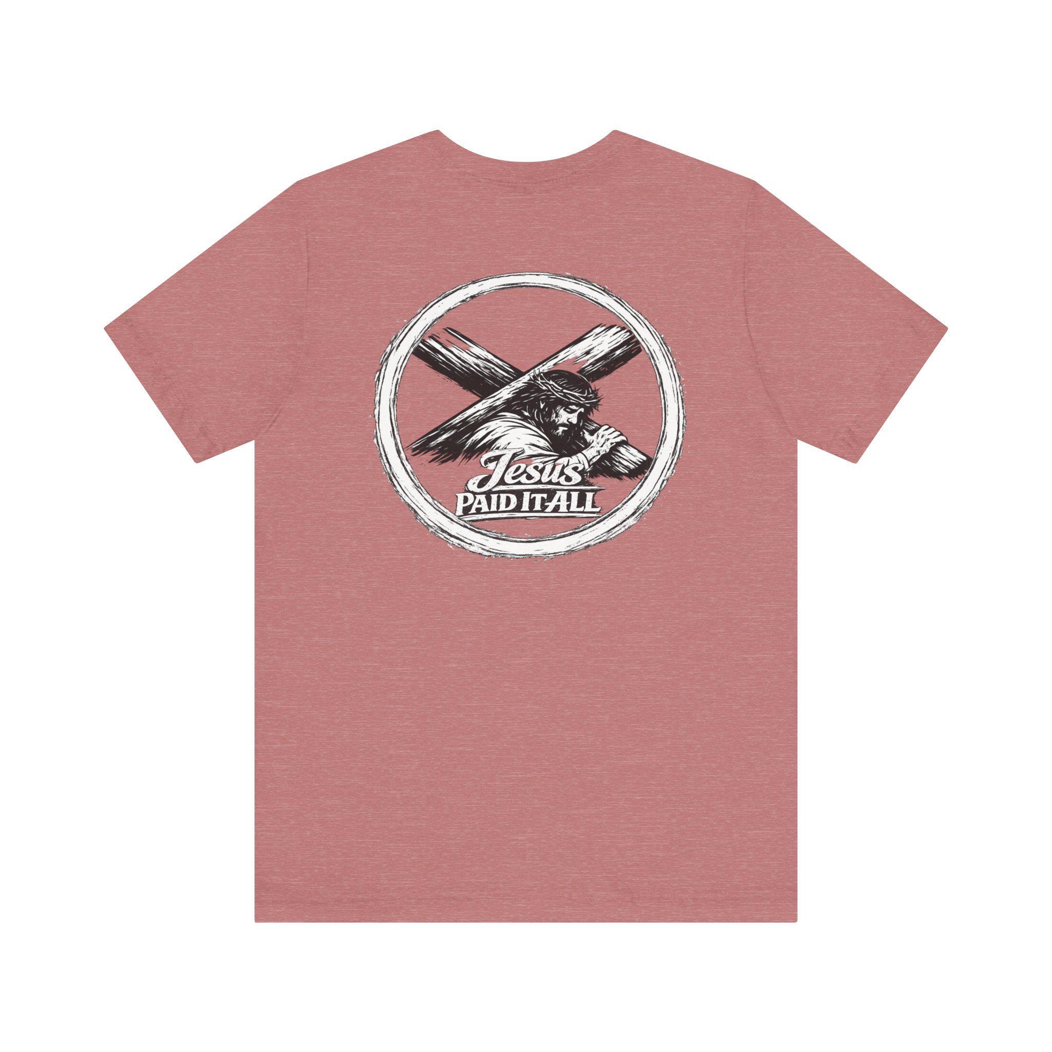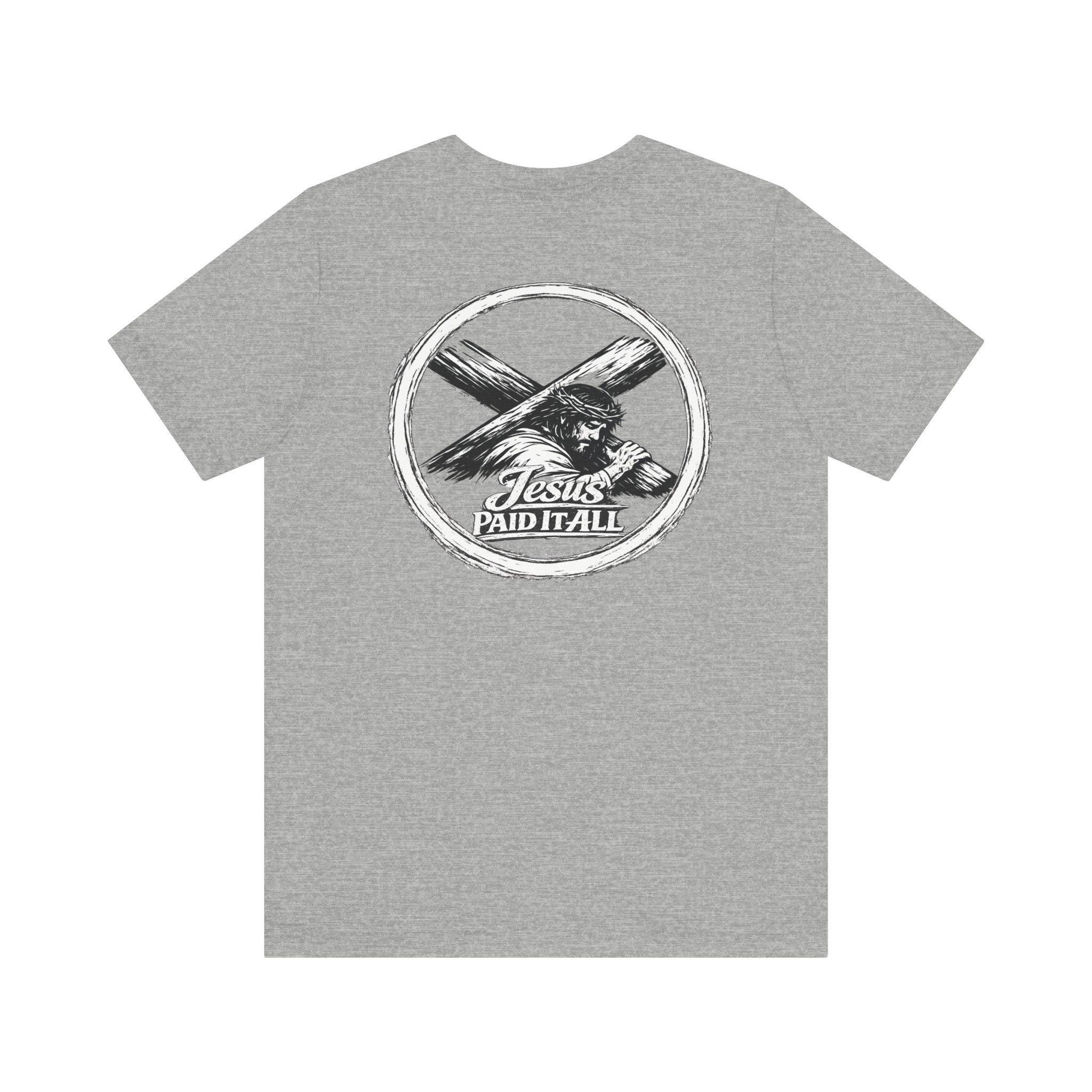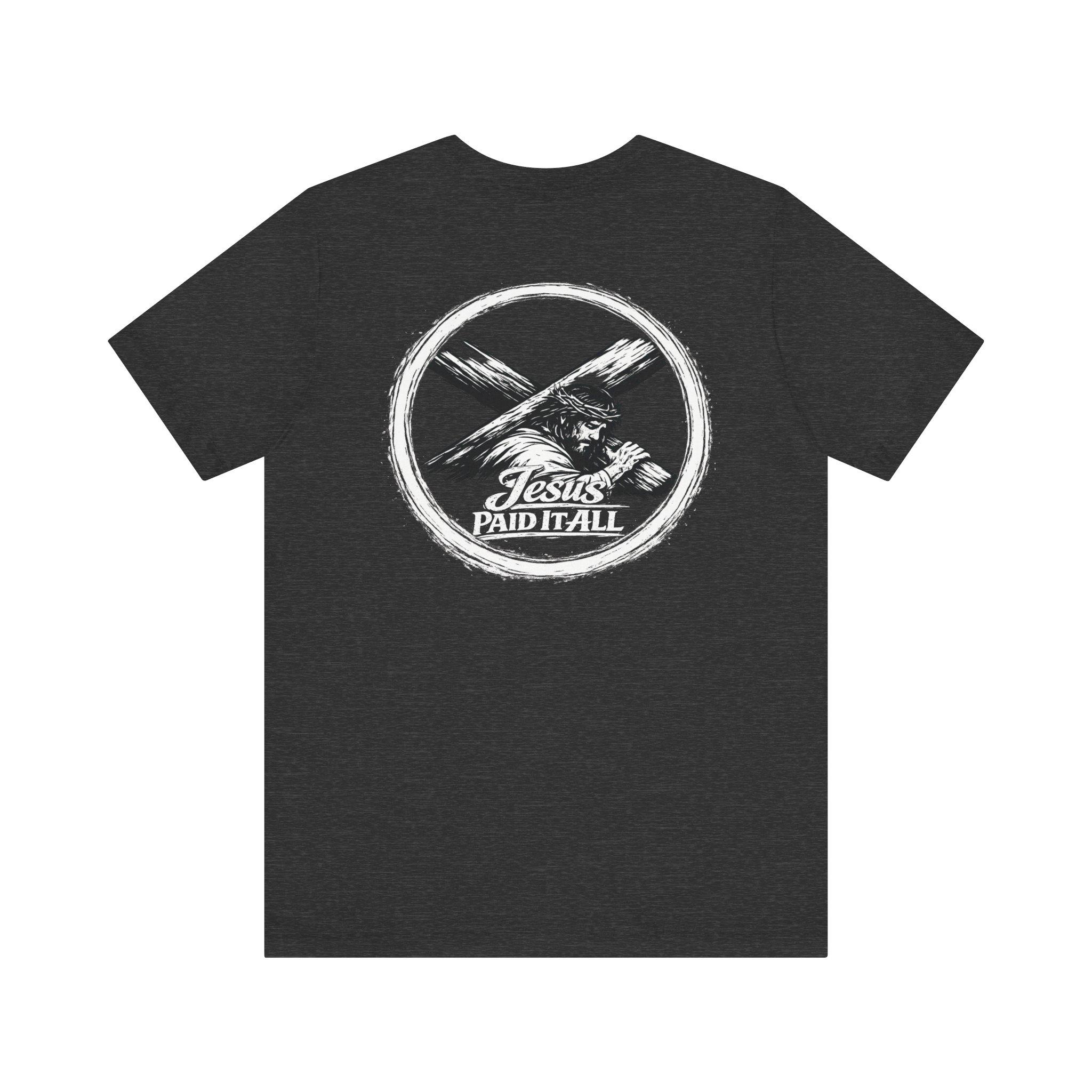 Wear your faith with this soft, breathable tee with a quiet, faith-forward message. This lightweight jersey sits close to the body without feeling tight, woven from Airlume combed and ring-spun cotton for a smooth hand and minimal shrinkage. A subtle chest logo and a more detailed back print — Christ bearing the weight of our sins encircled with the phrase “Jesus Paid It All” — give the shirt a rustic, contemplative look that reads like a personal testimony rather than loud branding. Finished with a ribbed knit collar, shoulder tape, side seams, and a tear-away label for comfort. The muted heather tone and vintage-style ink make it easy to wear to weekly gatherings, volunteer days, or quiet neighborhood meetups.