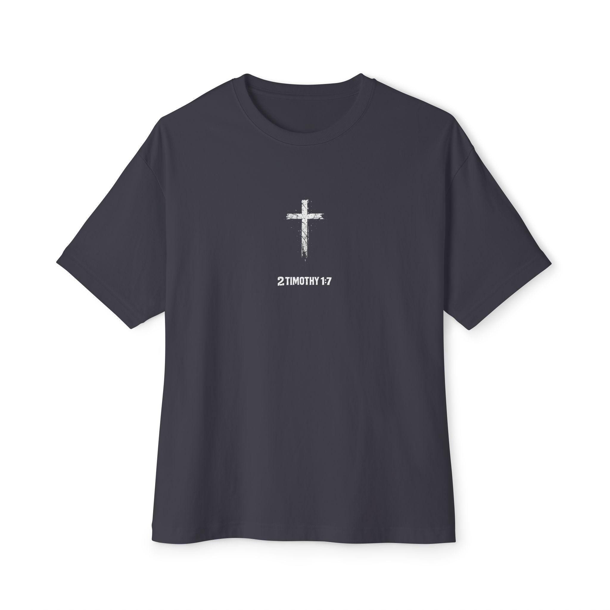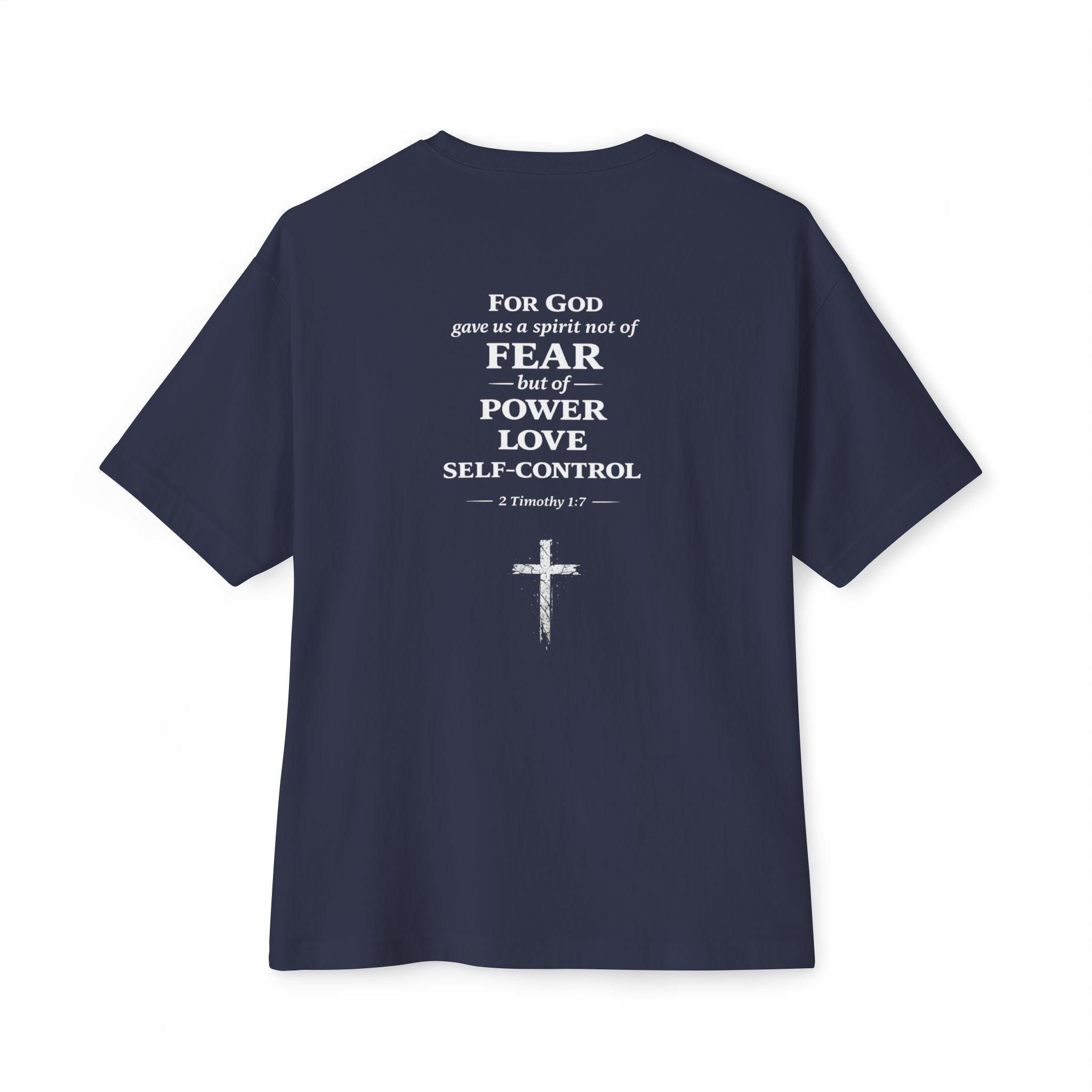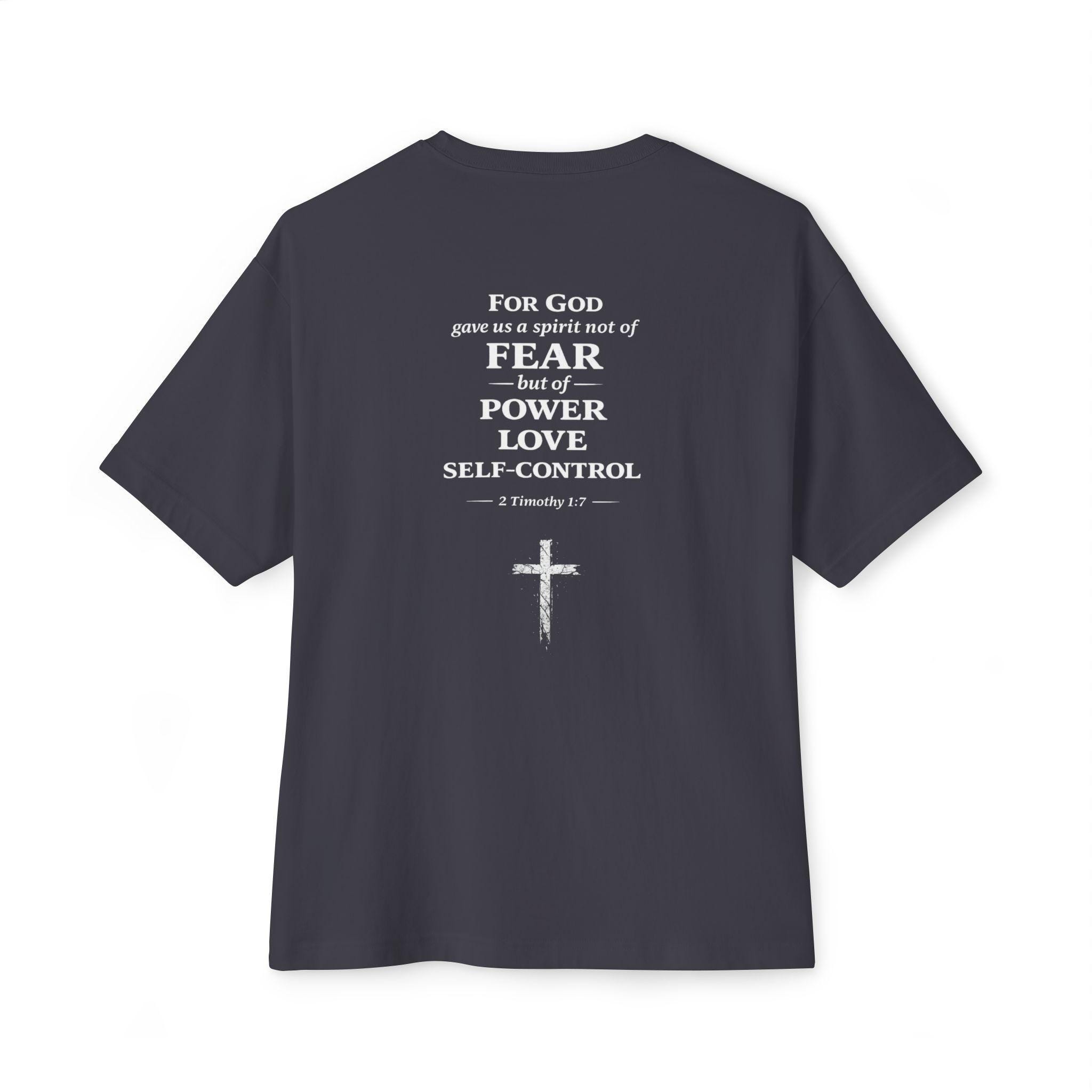 This relaxed boxy tee wears like a quiet declaration — soft, lived-in, and steadfast. A distressed cross on the front and an expanded verse on the back read: “For God gave us a spirit not of fear but of power, love and self-control — 2 Timothy 1:7.” It settles into the shoulders and chest with a roomy silhouette that moves with you, whether you’re heading to a small-group meeting, volunteering, or sitting through a sunrise service. The medium-weight cotton has substance without stiffness; the tear-away label keeps things gentle at the neck. Wear it layered over a long sleeve or alone on warm evenings — the message stays grounded, the fit stays comfortable.