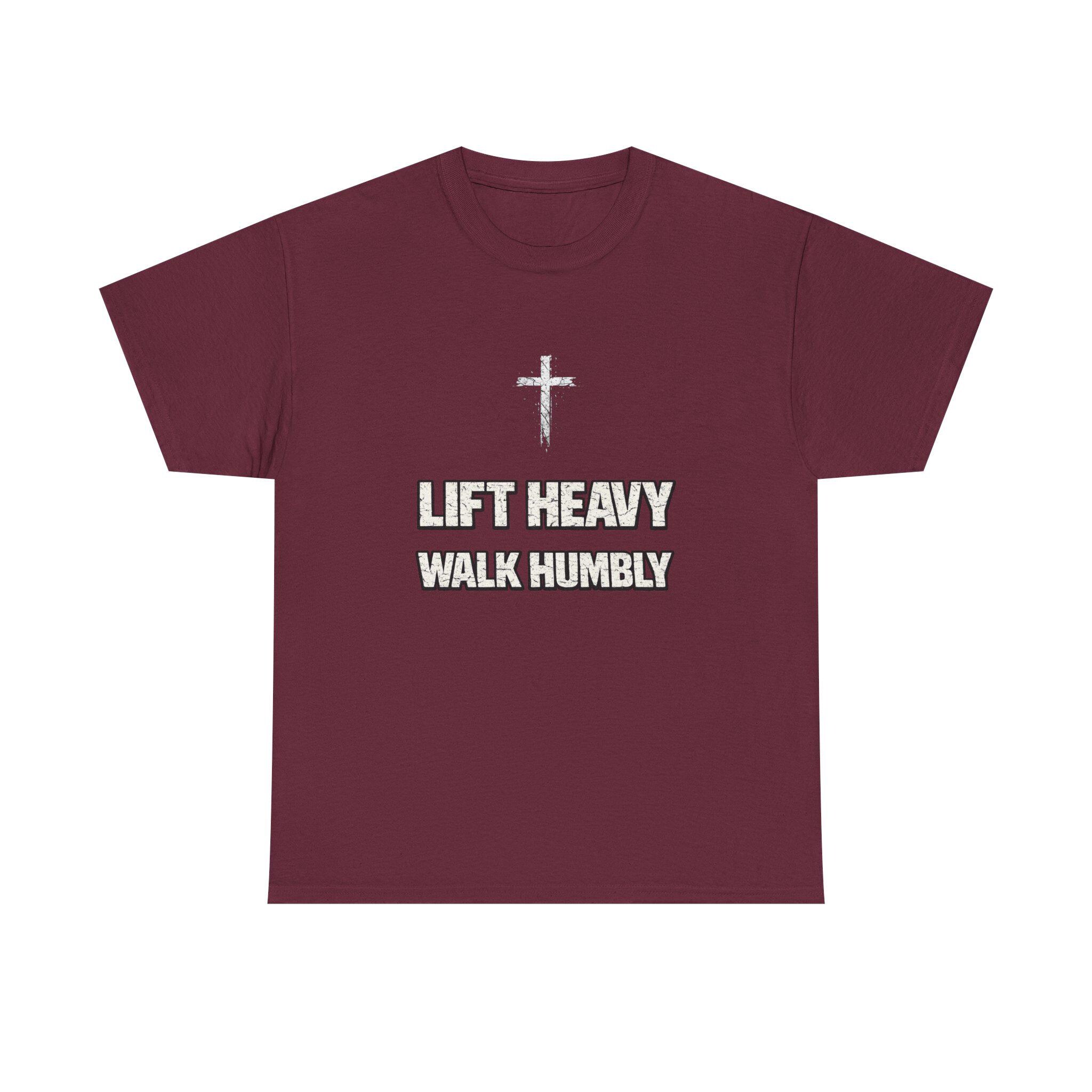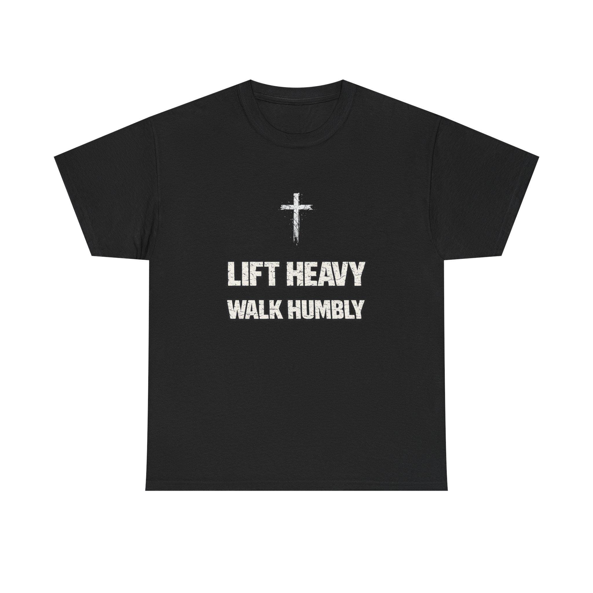 This soft, sturdy tee speaks simply and confidently: 'Lift heavy, walk humbly.' The classic crew silhouette and medium-weight cotton give it structure for workouts or everyday wear, while the distressed cross and bold lettering read like a quiet creed — strength grounded in humility. It layers easily under hoodies or over gym shorts, and holds up through wash after wash without losing shape. Wear it when you want your actions to do the talking: at the gym, on a hike, or during Sunday routines.