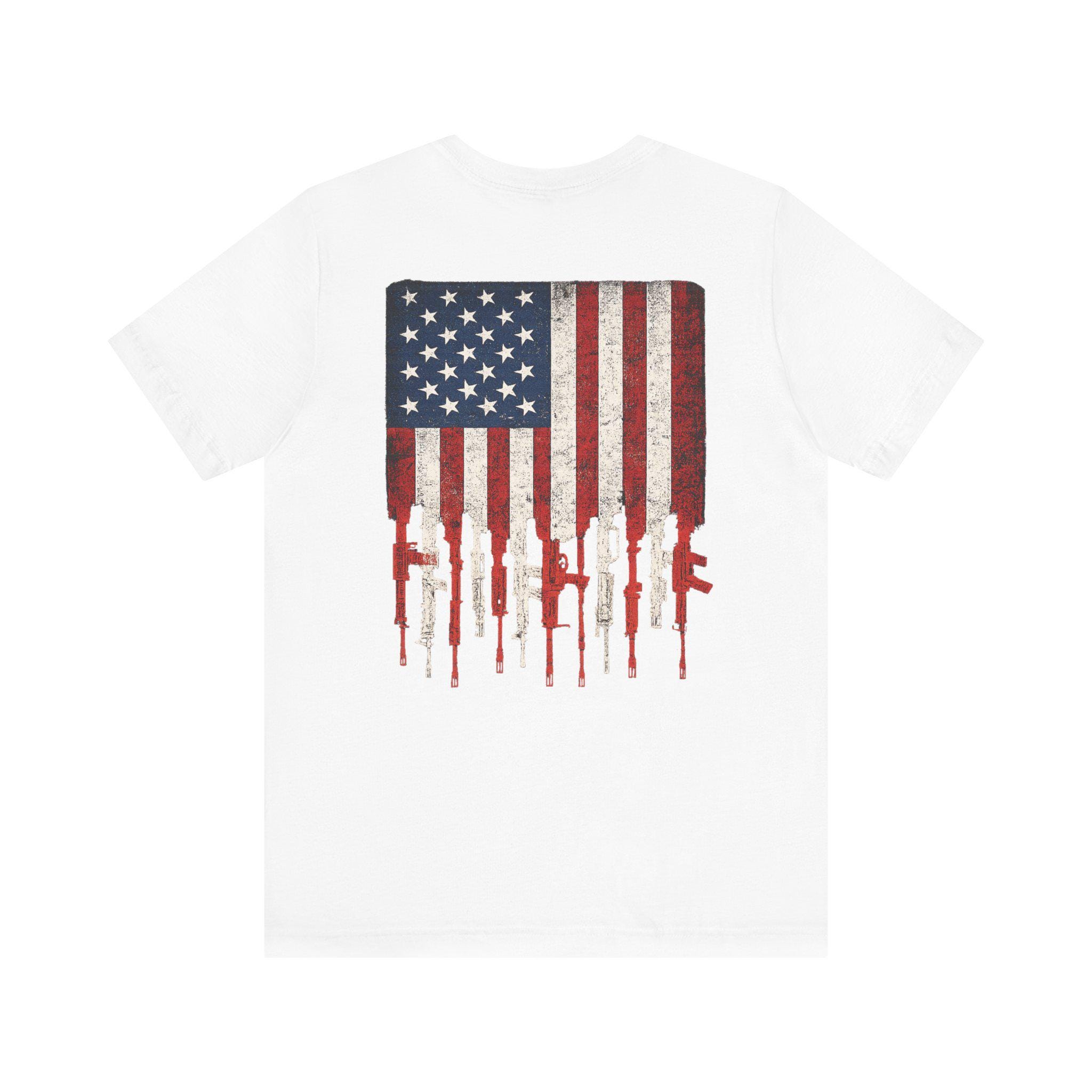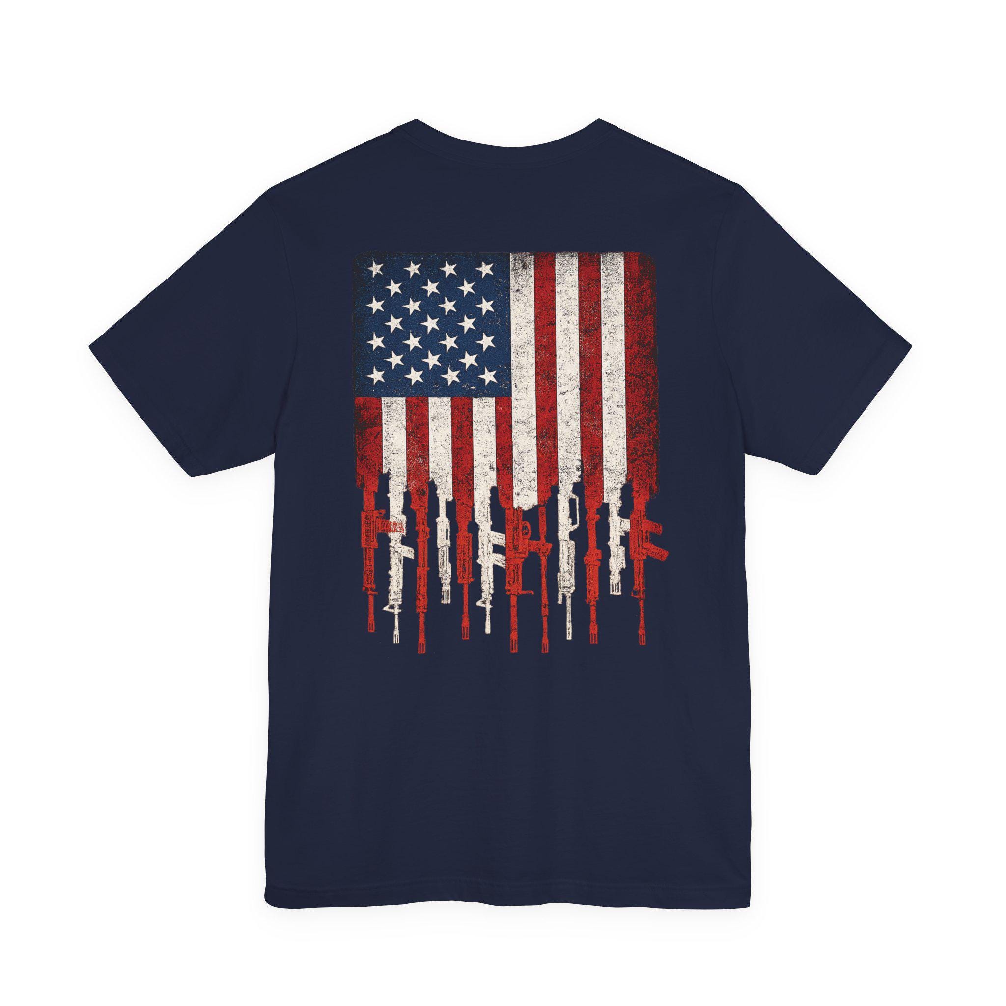A soft, breathable jersey tee that carries a bold, textured look—small distressed cross on the chest and a large, weathered American flag dripping into rifle silhouettes on the back. Lightweight Airlume combed ring-spun cotton keeps the shirt cool and easy to move in. Side seams and shoulder tape hold the shape through repeated wear. Wear it layered under a flannel or solo when you want a clean crew neckline with a bit of edge. The subtle tear-away label reduces irritation, and responsibly made sourcing gives this tee a straightforward, honest feel.