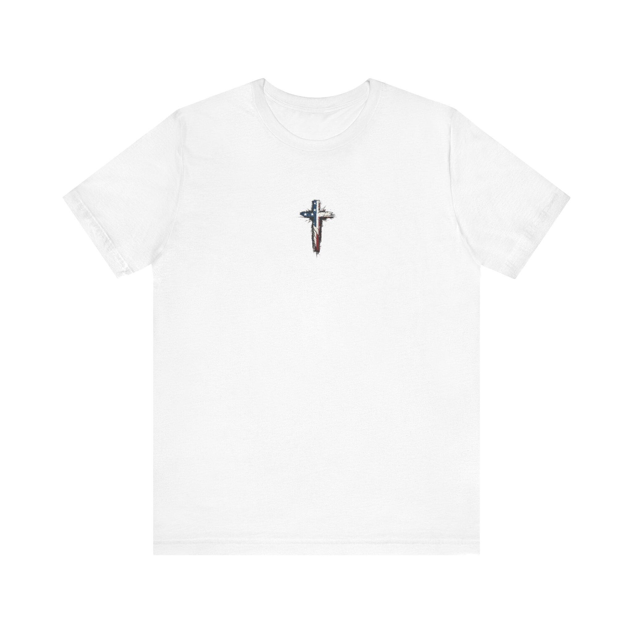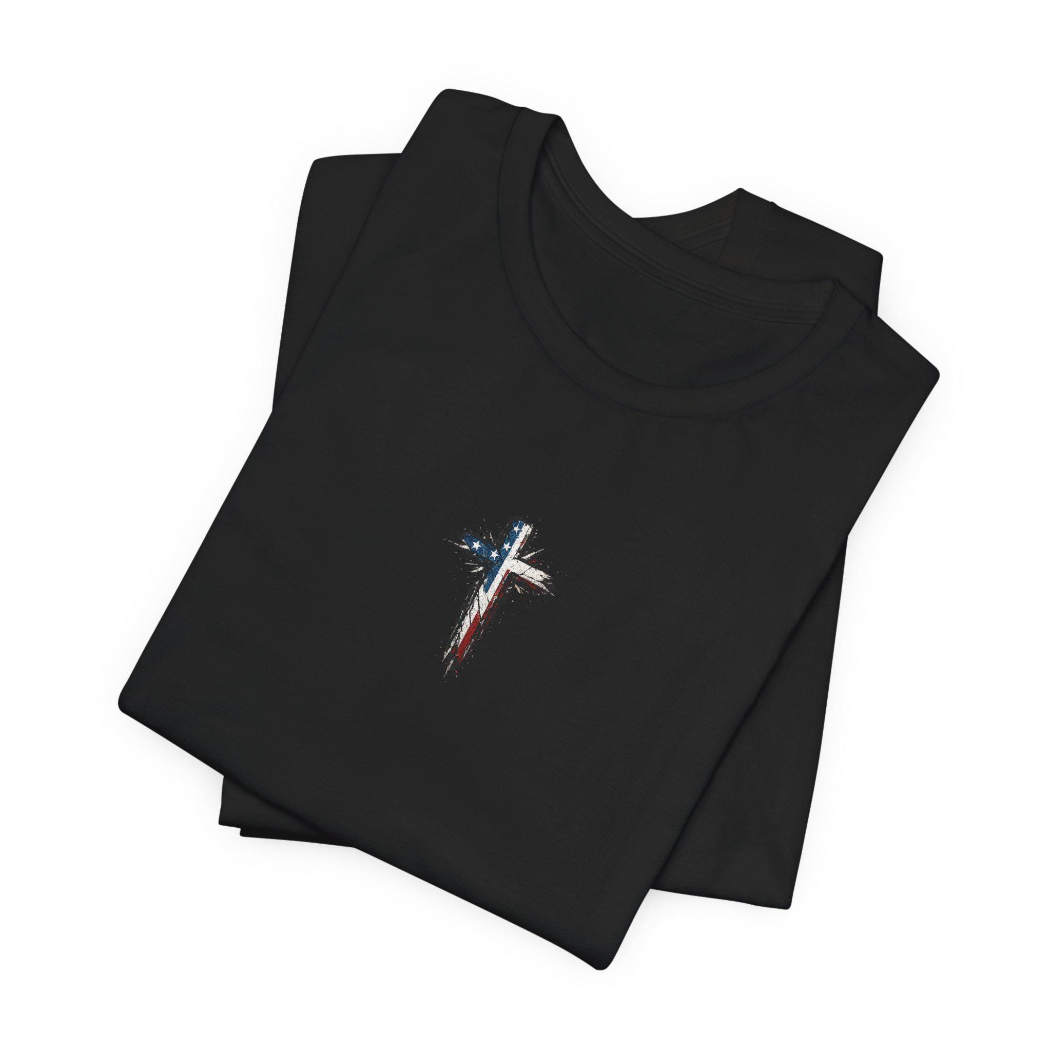 - Printed chest cross and distressed American flag back using crisp DTF/DTG methods
