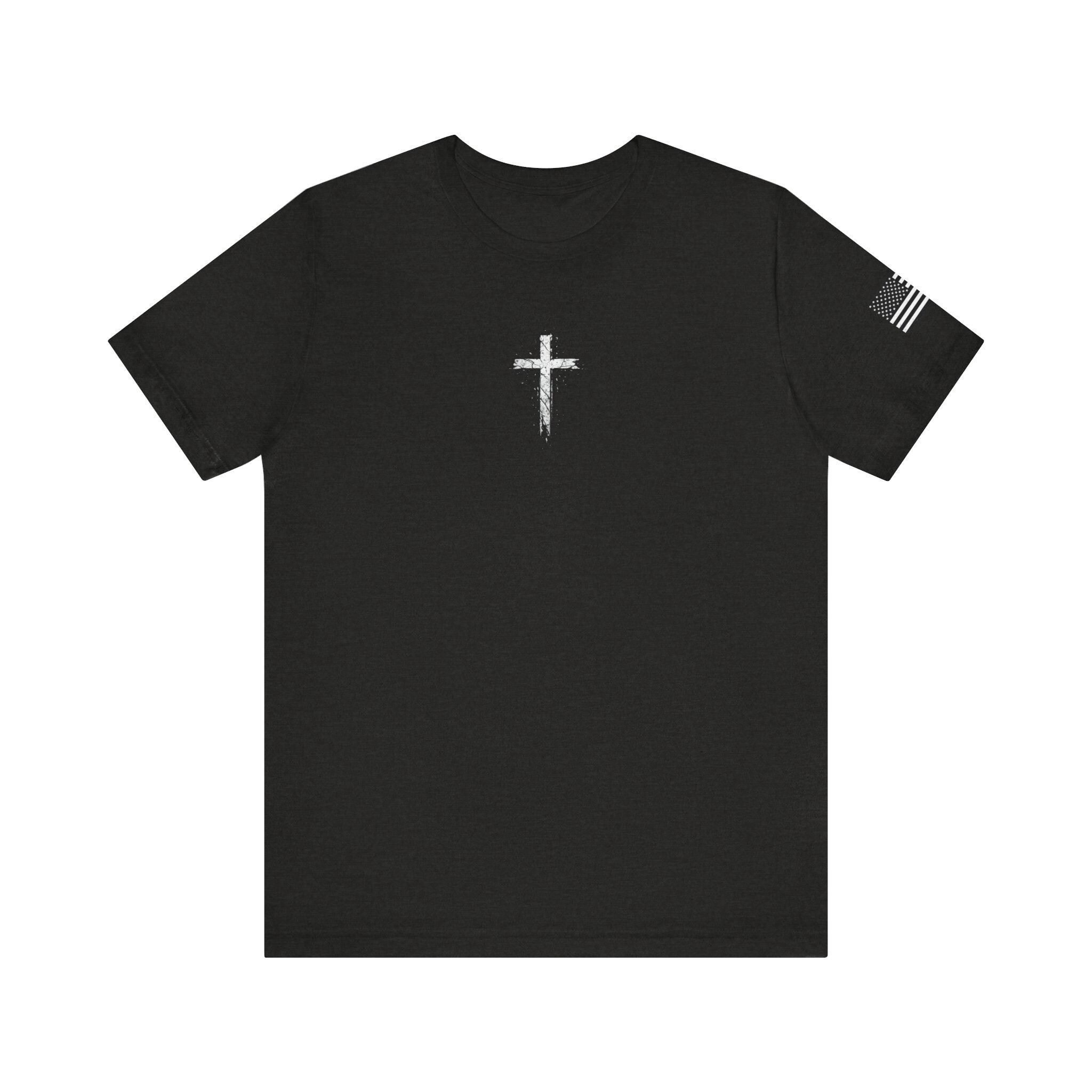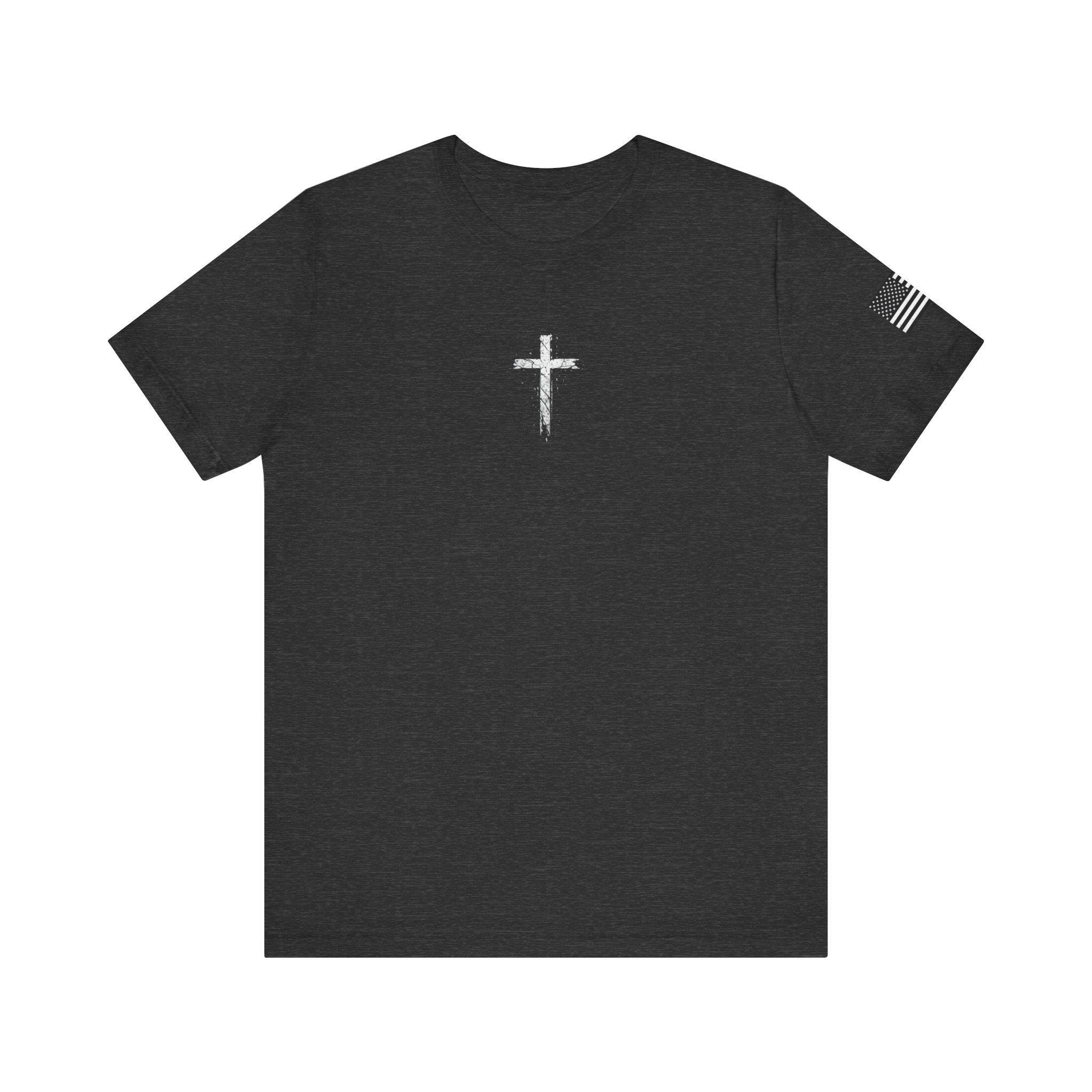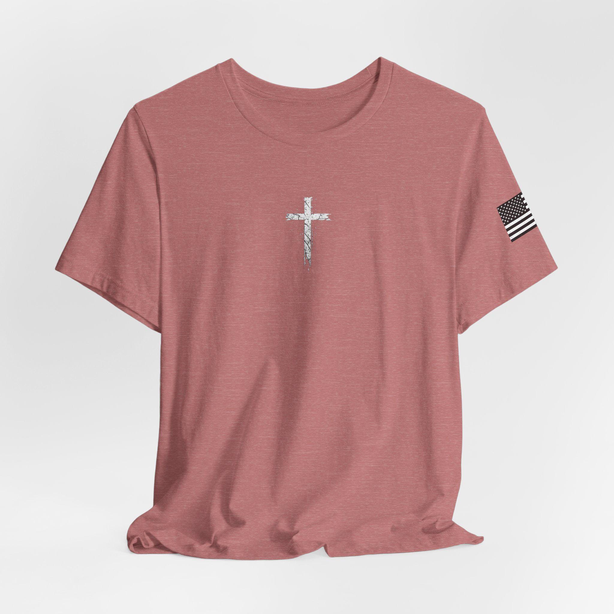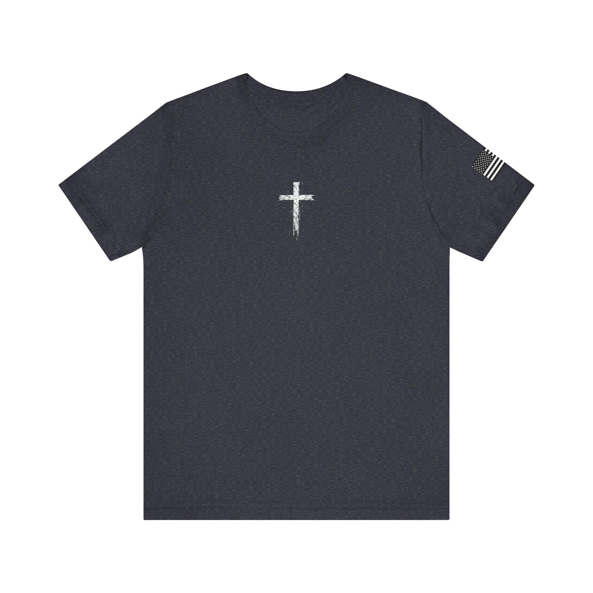 This lightweight heathered crew-neck tee combines subtle faith and rugged patriotism in a soft, breathable fabric you’ll reach for again and again. A small, distressed cross rests over the heart up front, while the back shows a worn American flag motif that melts into rifle silhouettes — a look that feels like quiet conviction, hard-won values, and everyday readiness. Sleeve detailing carries a subdued flag patch for a low-profile, lived-in aesthetic. The retail fit layers easily under jackets or stands on its own with jeans. Ethically made with Airlume combed and ring‑spun cotton, it’s comfortable against the skin and built to hold its shape thanks to side seams, ribbed collar, and reinforced shoulder tape. REACH-certified and finished with a tear‑away label for minimal irritation.