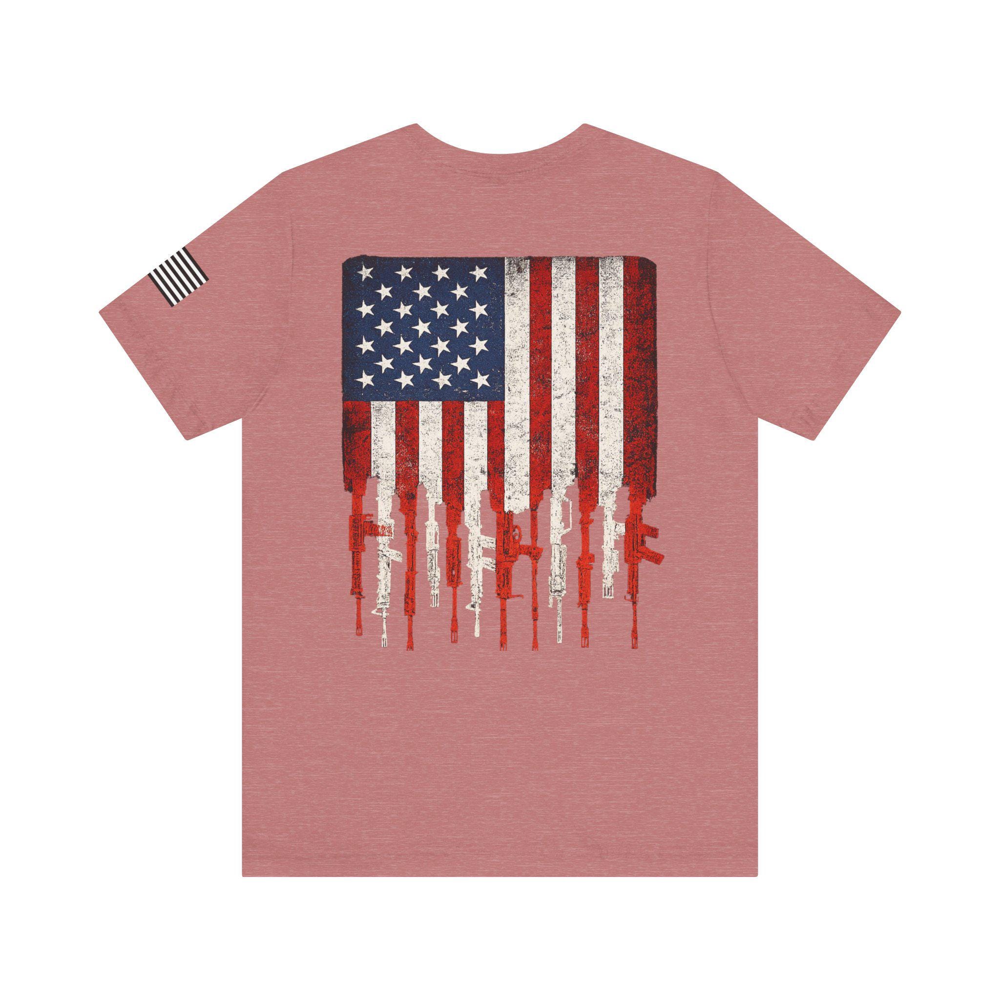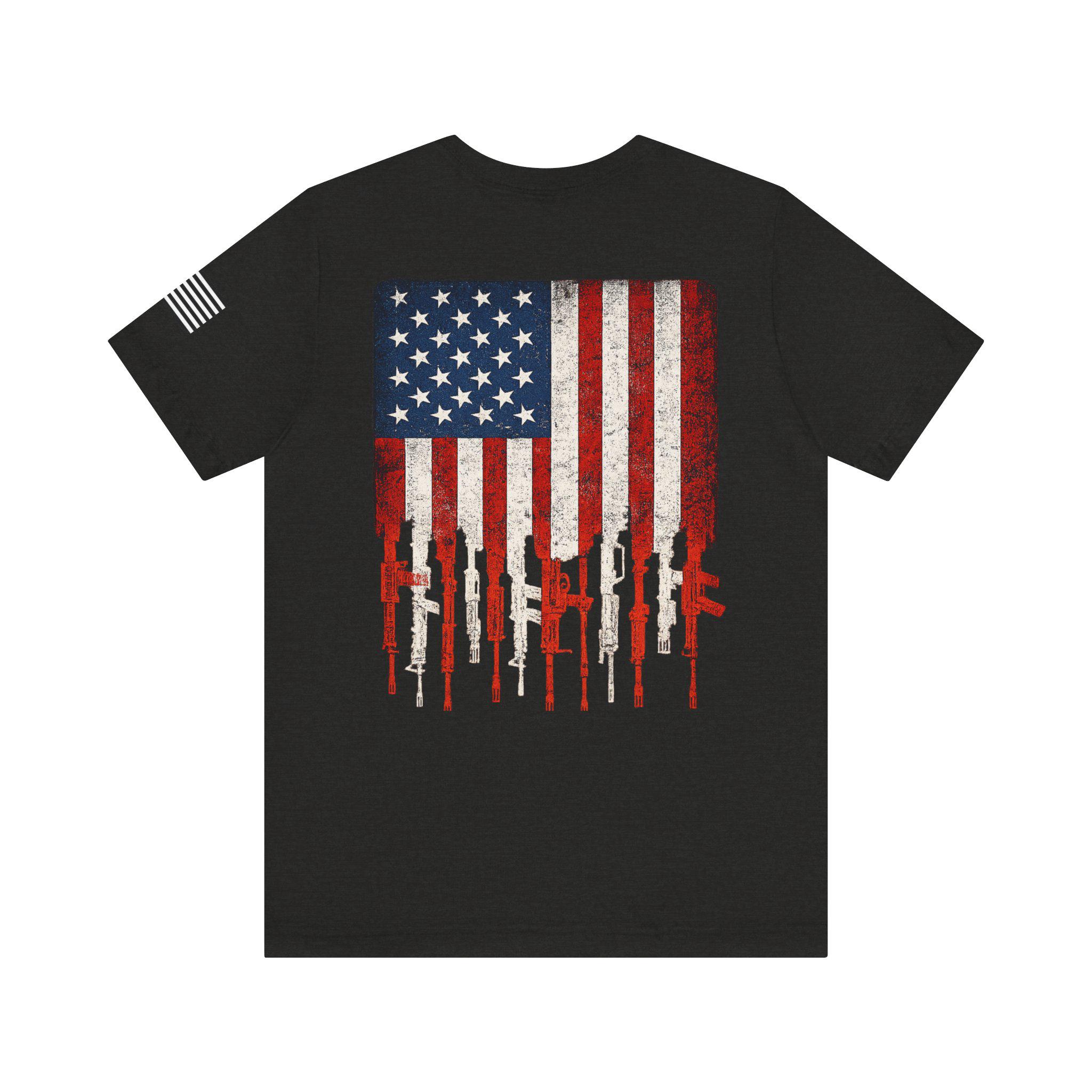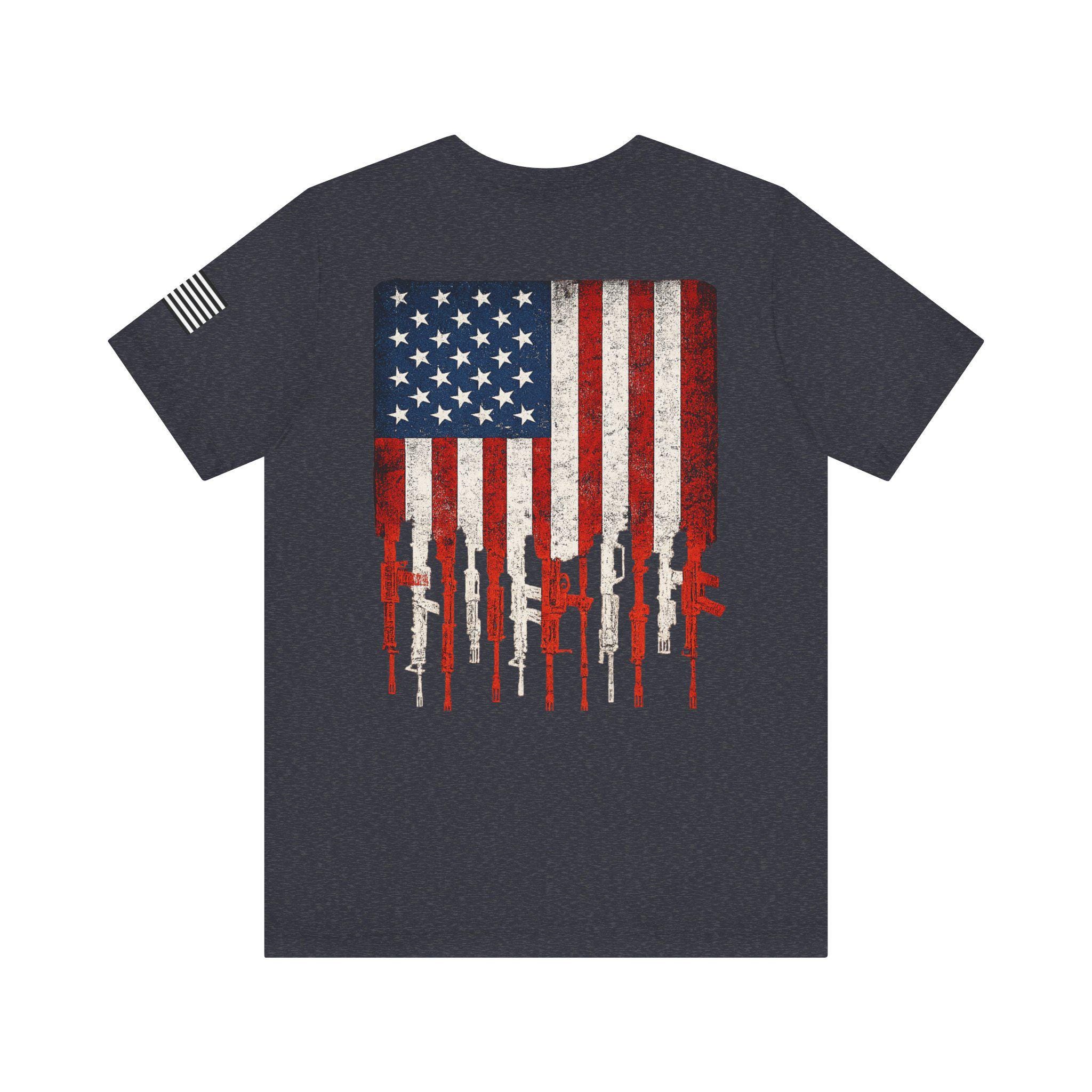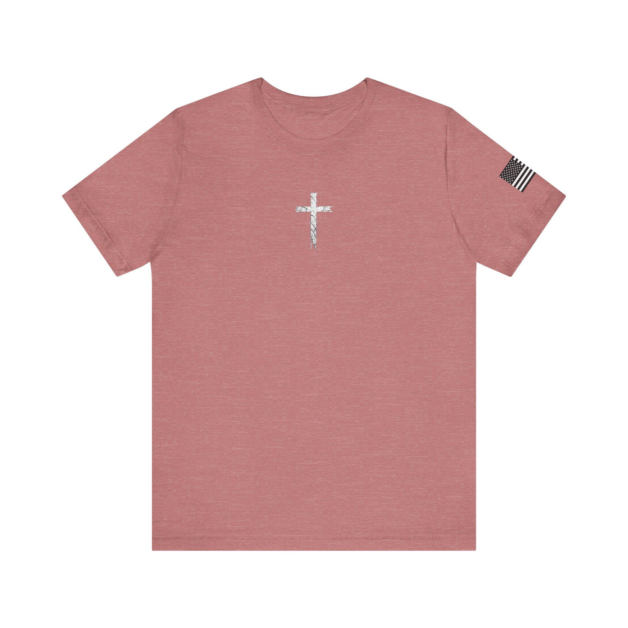 This lightweight heathered crew-neck tee combines subtle faith and rugged patriotism in a soft, breathable fabric you’ll reach for again and again. A small, distressed cross rests over the heart up front, while the back shows a worn American flag motif that melts into rifle silhouettes — a look that feels like quiet conviction, hard-won values, and everyday readiness. Sleeve detailing carries a subdued flag patch for a low-profile, lived-in aesthetic. The retail fit layers easily under jackets or stands on its own with jeans. Ethically made with Airlume combed and ring‑spun cotton, it’s comfortable against the skin and built to hold its shape thanks to side seams, ribbed collar, and reinforced shoulder tape. REACH-certified and finished with a tear‑away label for minimal irritation.