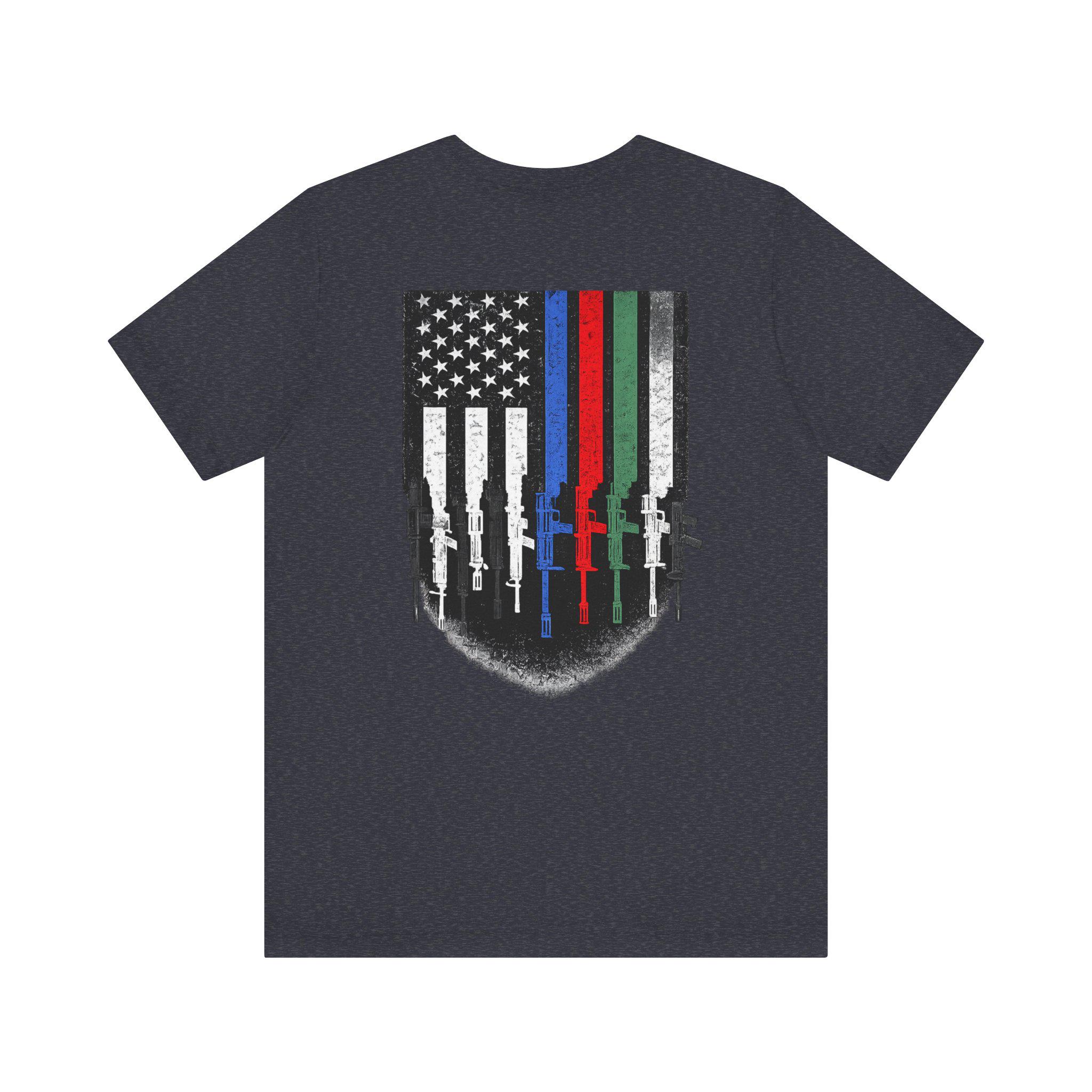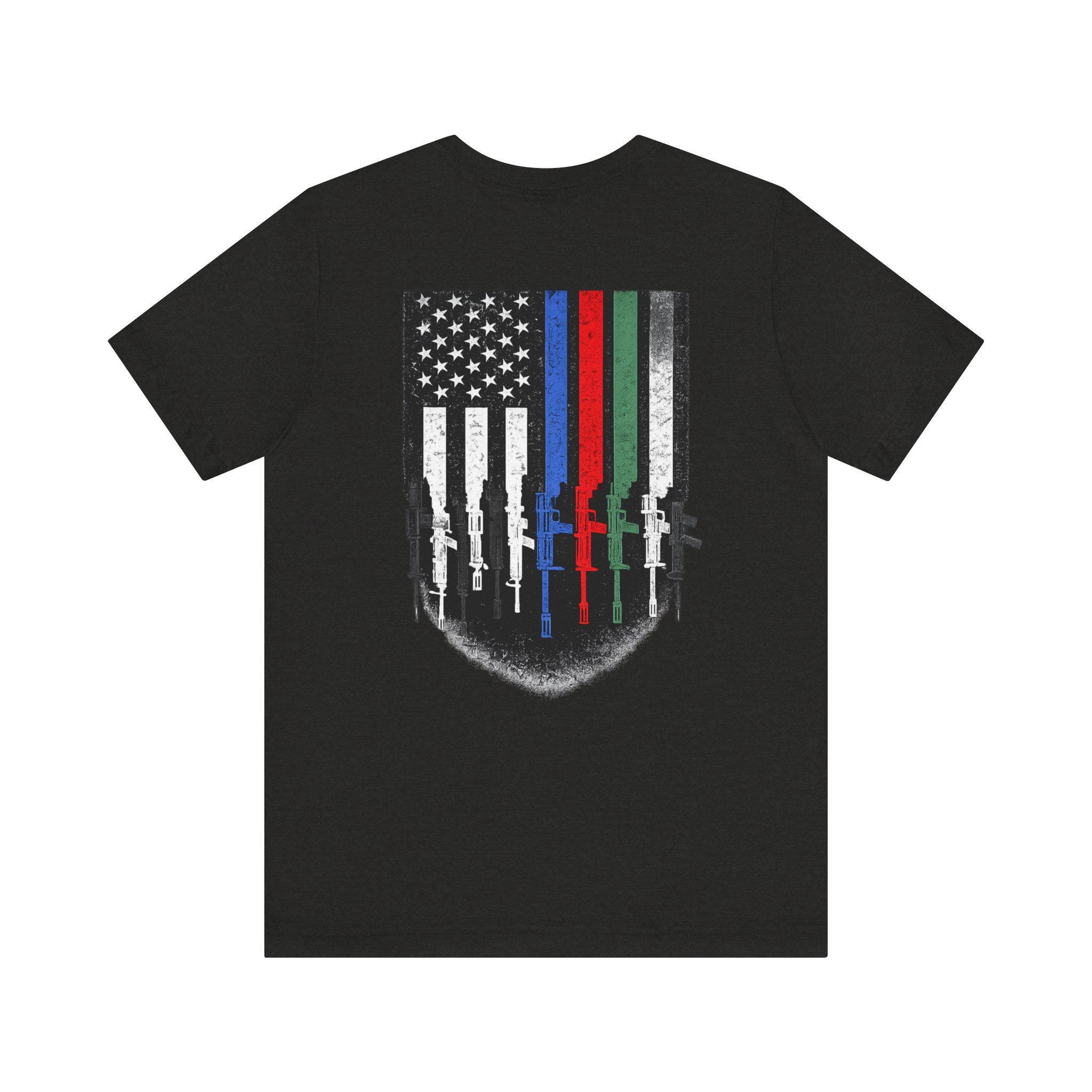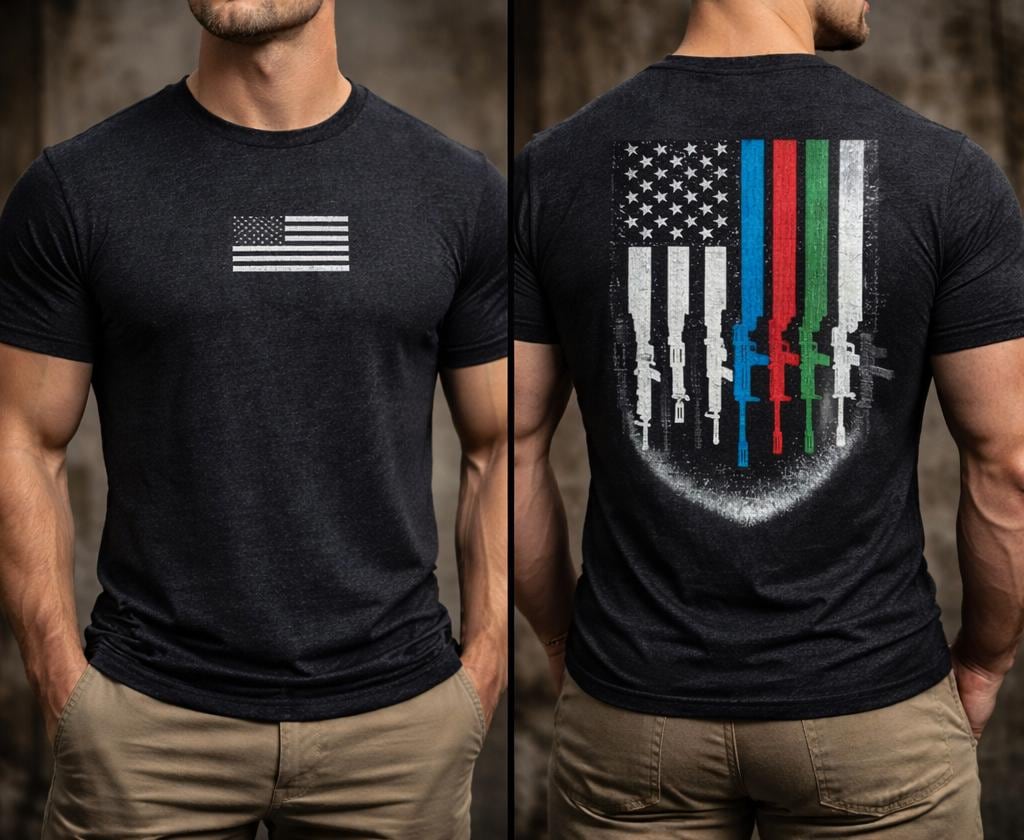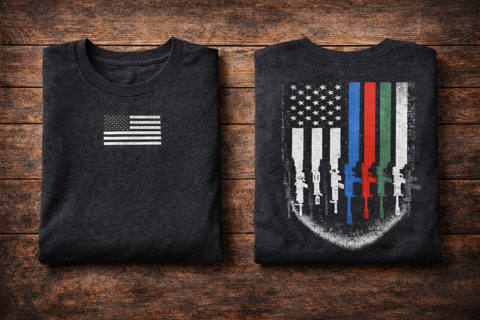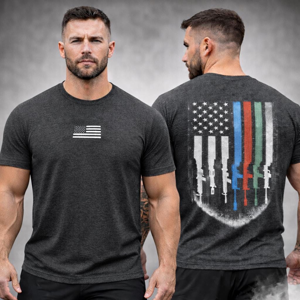 A Premium, soft, breathable jersey tee that balances everyday wear with quiet strength. The front bears a small monochrome flag motif over the heart, while the back displays a distressed flag made of stacked rifle silhouettes in muted black, white and individual colored stripes — a gritty, reverent aesthetic that reads as solidarity without shouting. Lightweight Airlume combed and ring-spun cotton keeps the shirt airy for long days on the move. The retail crew neckline and side-seamed construction hold a clean shape whether layered under a jacket or worn alone. This tee fits into a deliberate, functional wardrobe: worn during range days, veteran meetups, or low-key weekends at the cabin, it speaks to those who value craft, history, and a subtle statement.