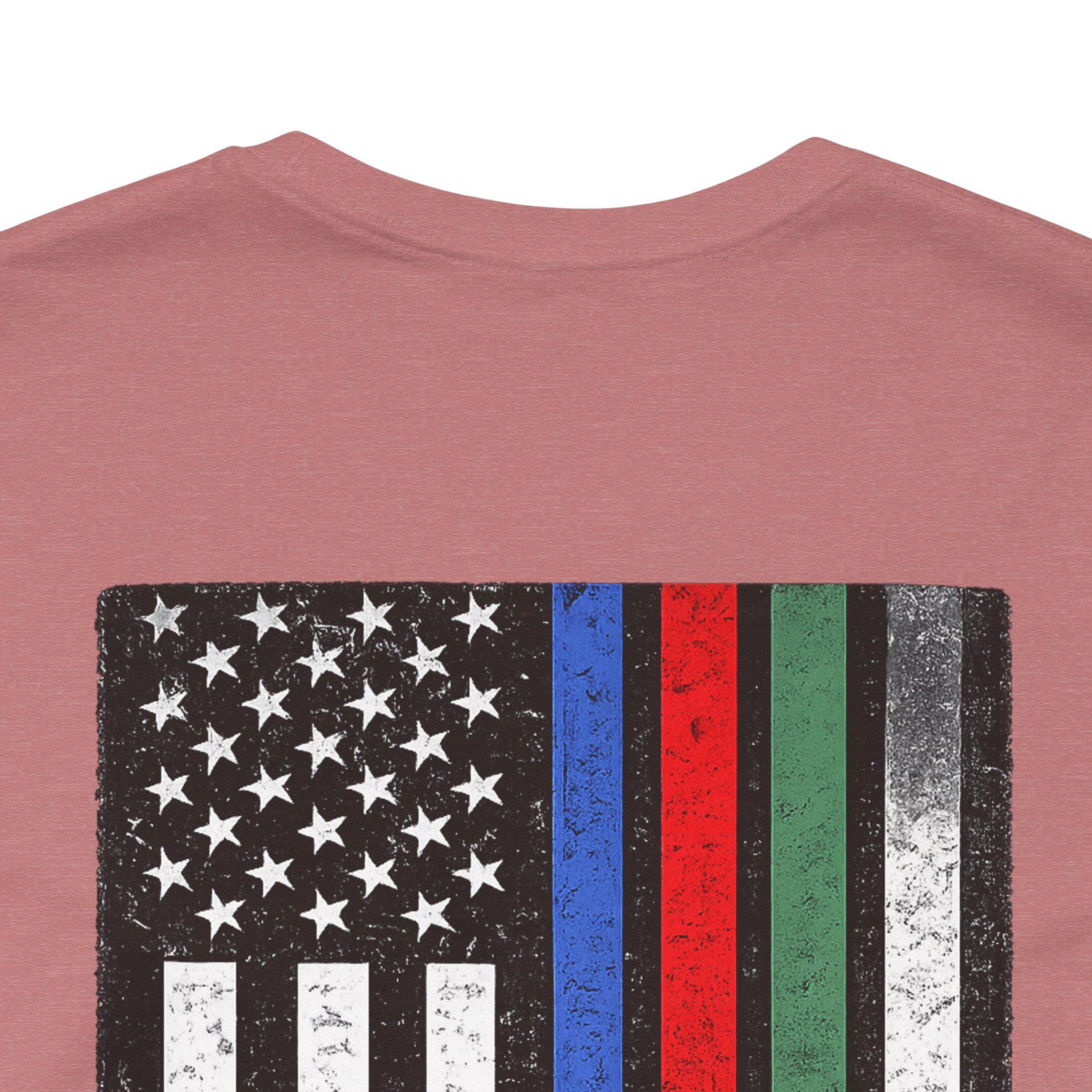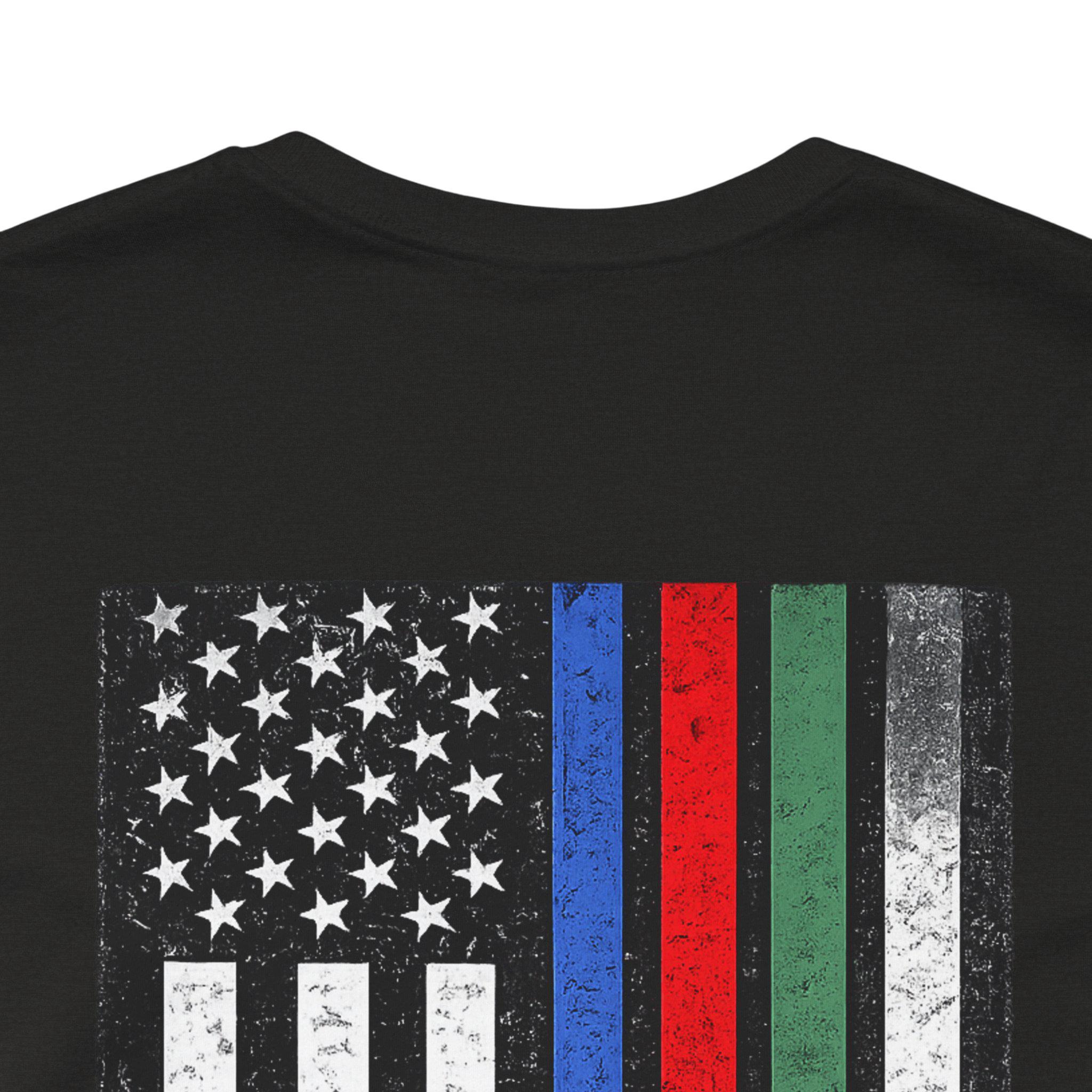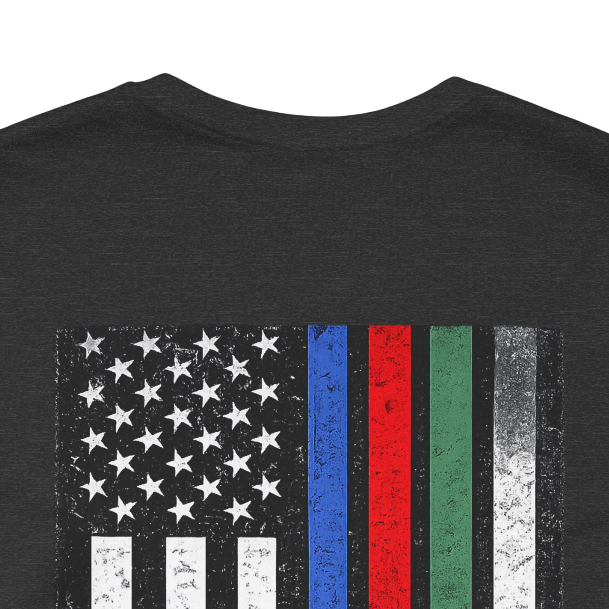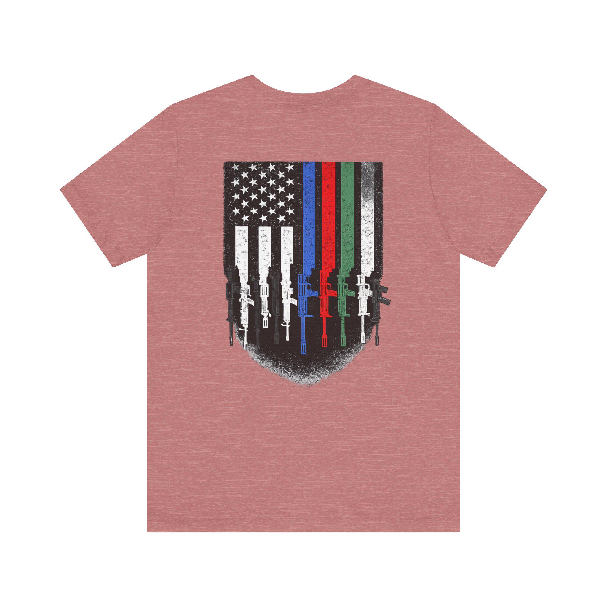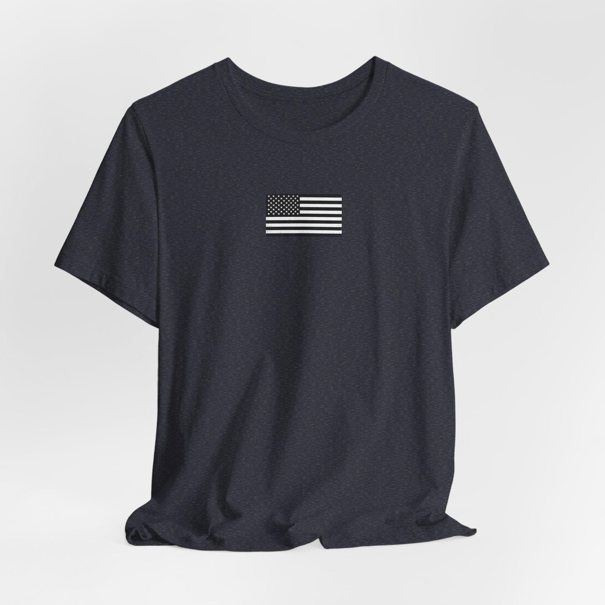 A Premium, soft, breathable jersey tee that balances everyday wear with quiet strength. The front bears a small monochrome flag motif over the heart, while the back displays a distressed flag made of stacked rifle silhouettes in muted black, white and individual colored stripes — a gritty, reverent aesthetic that reads as solidarity without shouting. Lightweight Airlume combed and ring-spun cotton keeps the shirt airy for long days on the move. The retail crew neckline and side-seamed construction hold a clean shape whether layered under a jacket or worn alone. This tee fits into a deliberate, functional wardrobe: worn during range days, veteran meetups, or low-key weekends at the cabin, it speaks to those who value craft, history, and a subtle statement.