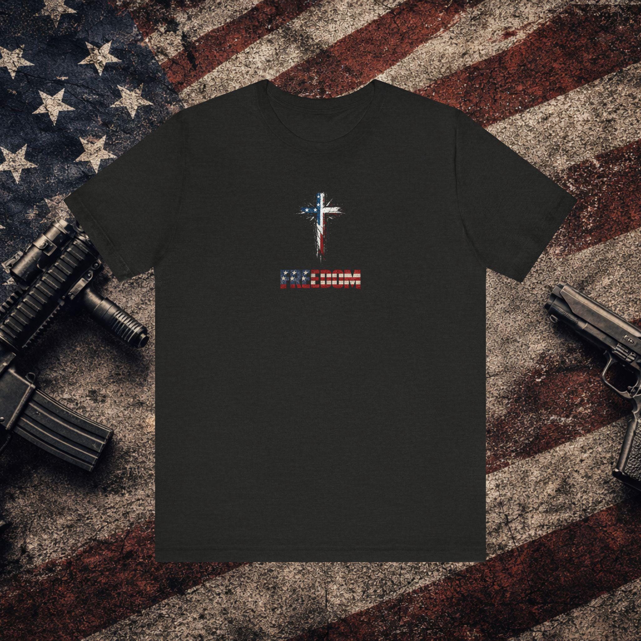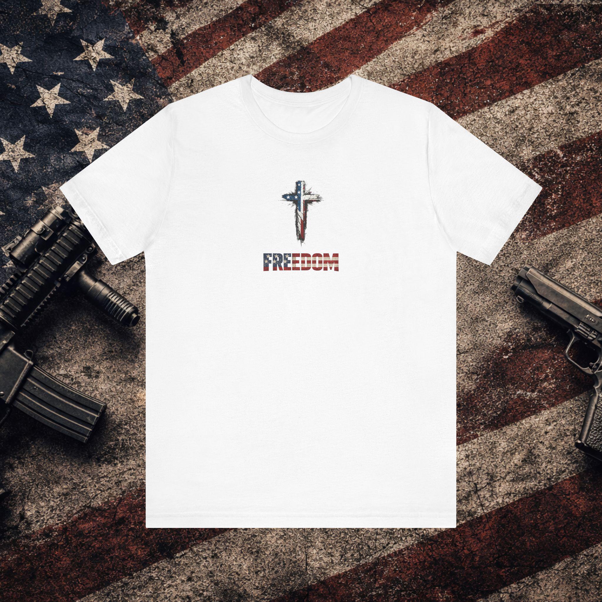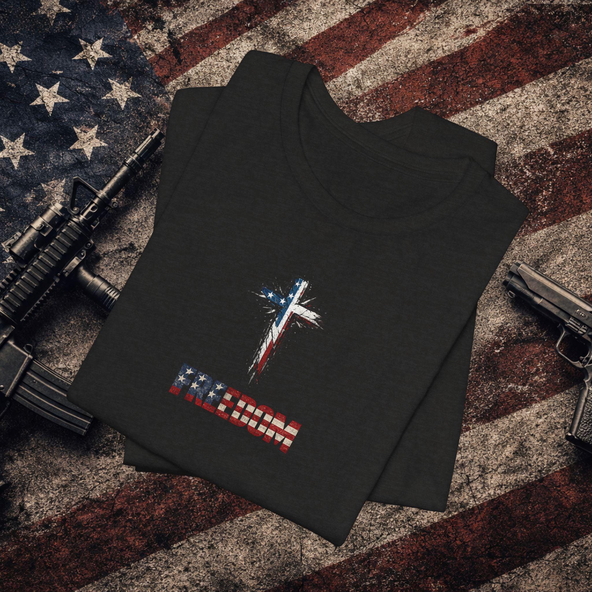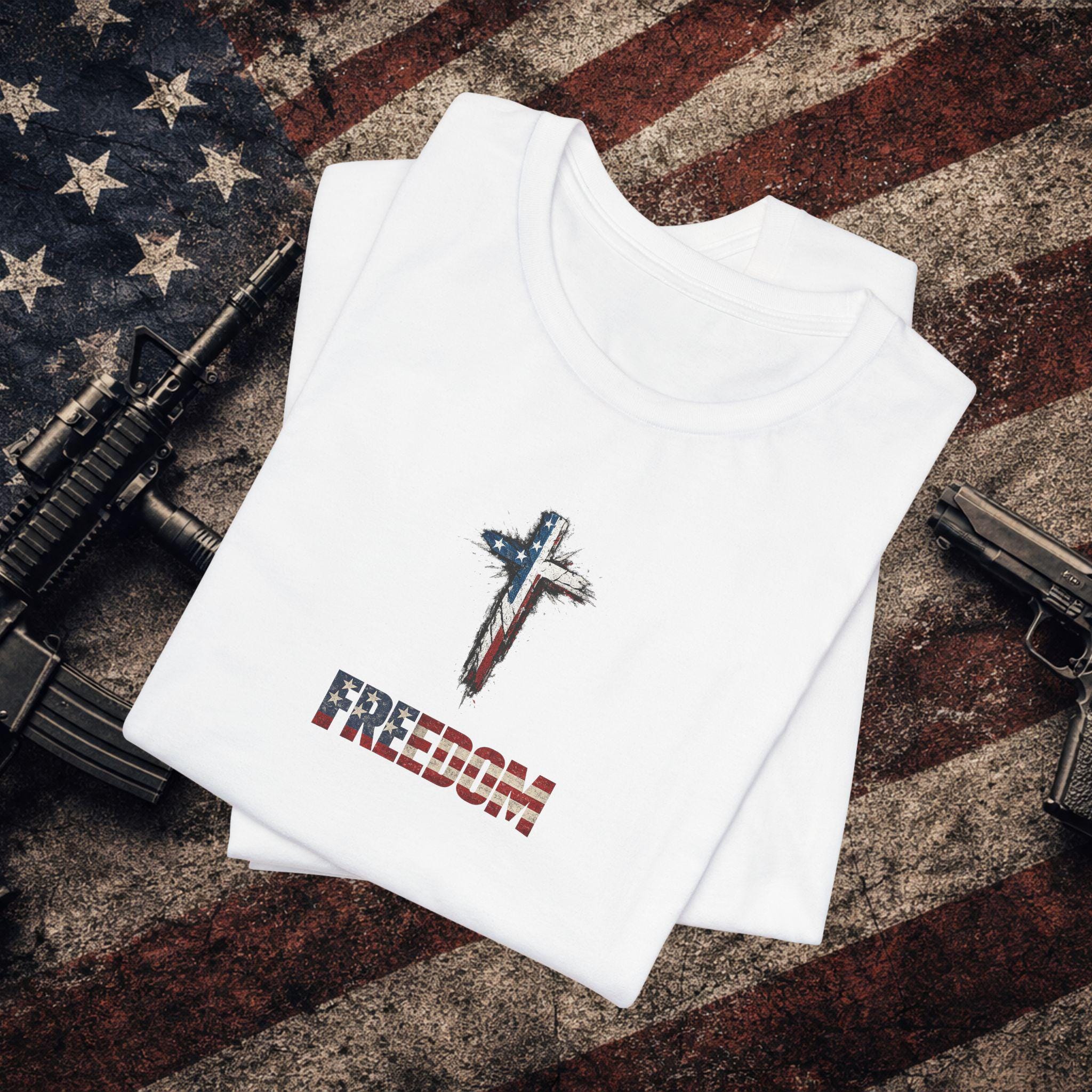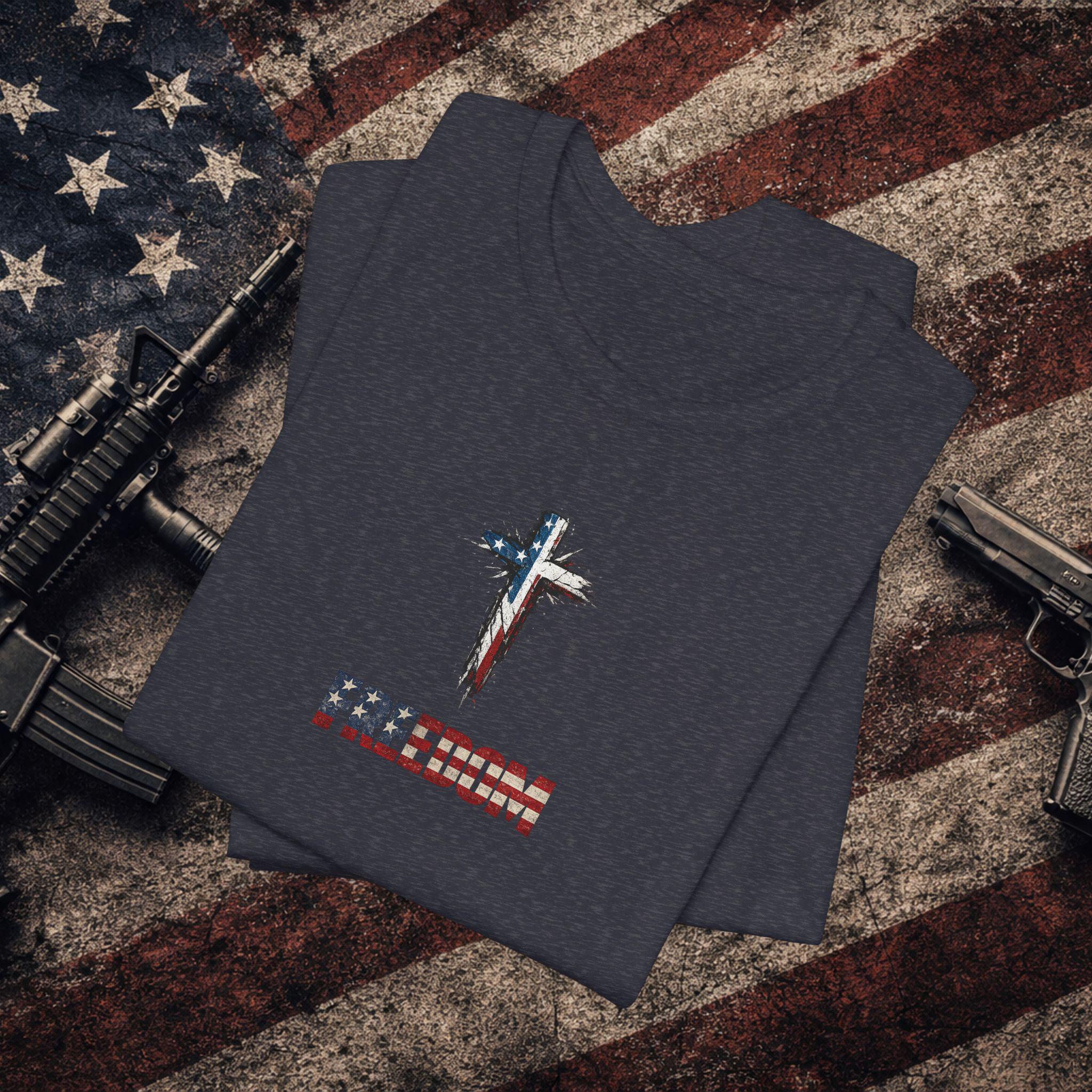 A Premium, soft, lightweight tee that speaks quietly but boldly. This crew-neck shirt pairs a subtle, distressed cross emblem with the word “FREEDOM” in washed, Americana tones — a restrained statement for Sundays at church, backyard barbecues, or long drives down country roads. The fabric breathes and moves with you; the retail fit stays neat under a jacket or worn loose with denim. It’s made to be lived in: gentle on the skin, easy to layer, and built to keep its shape through many wears and washes.