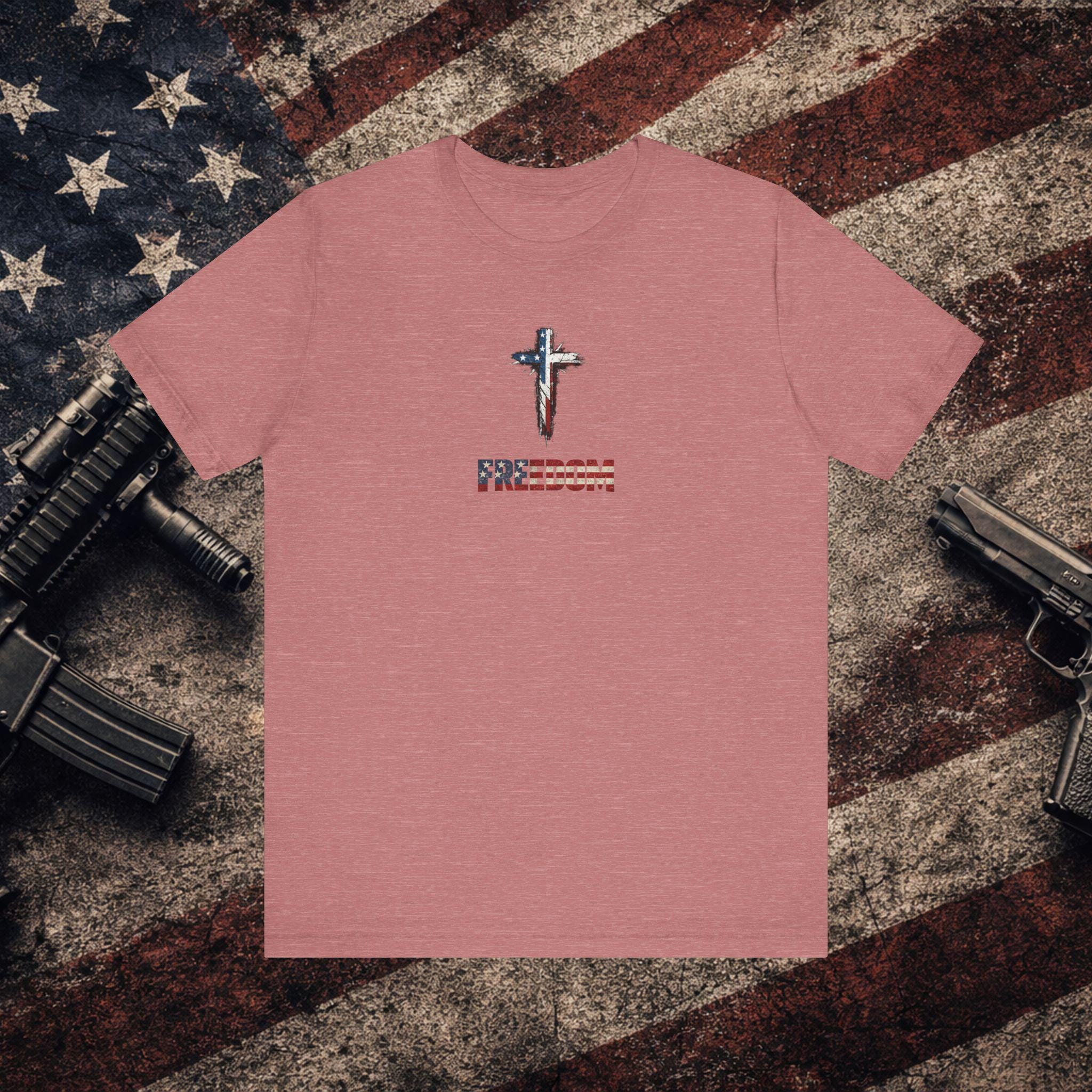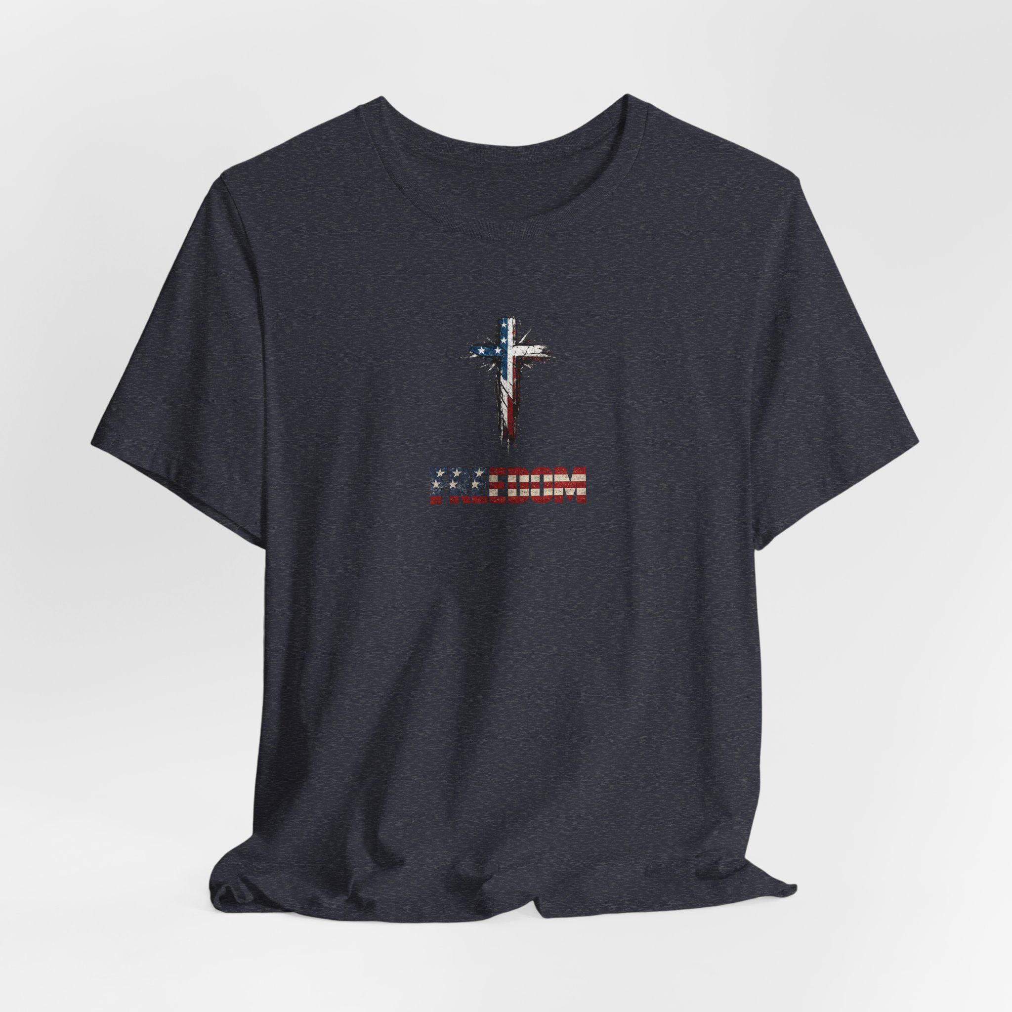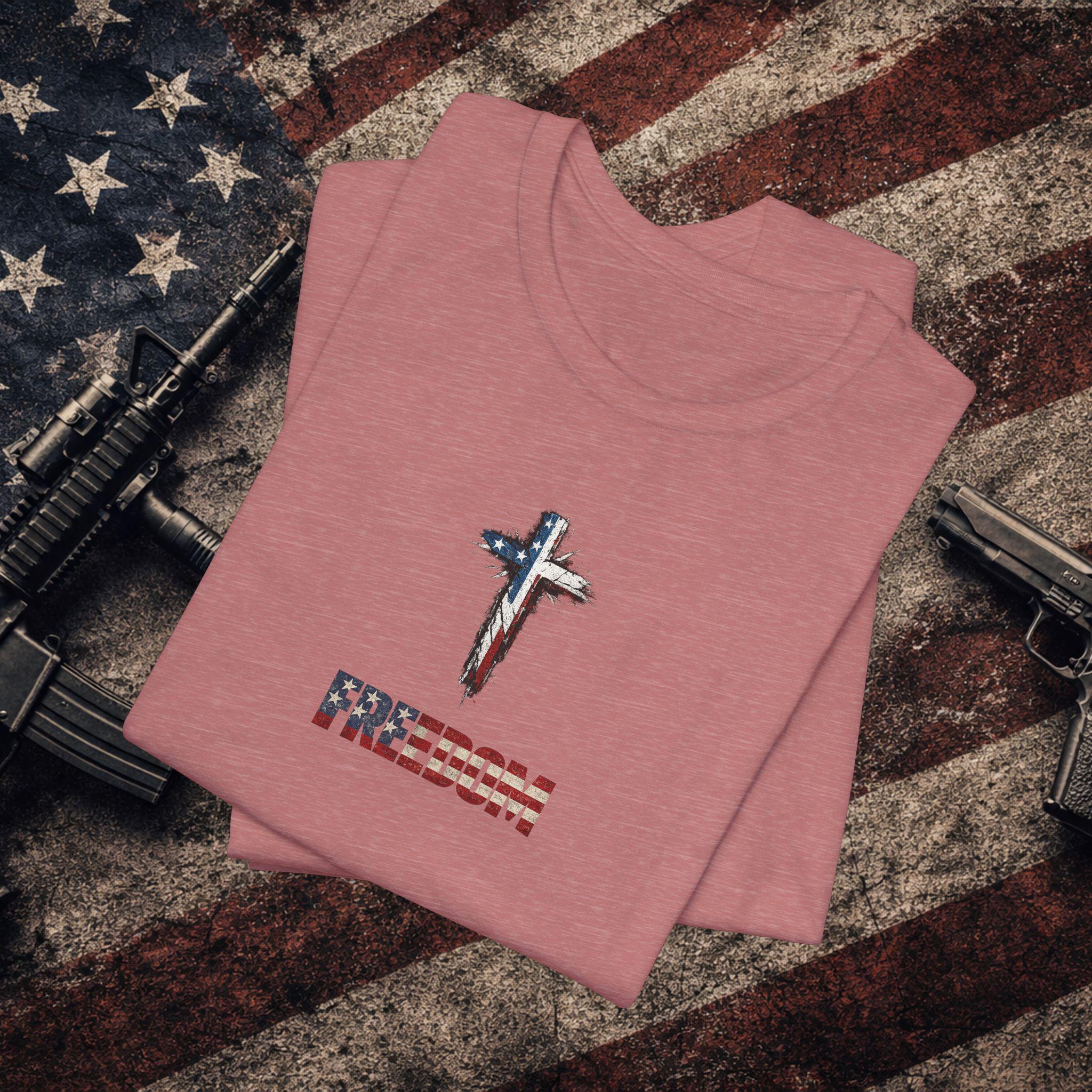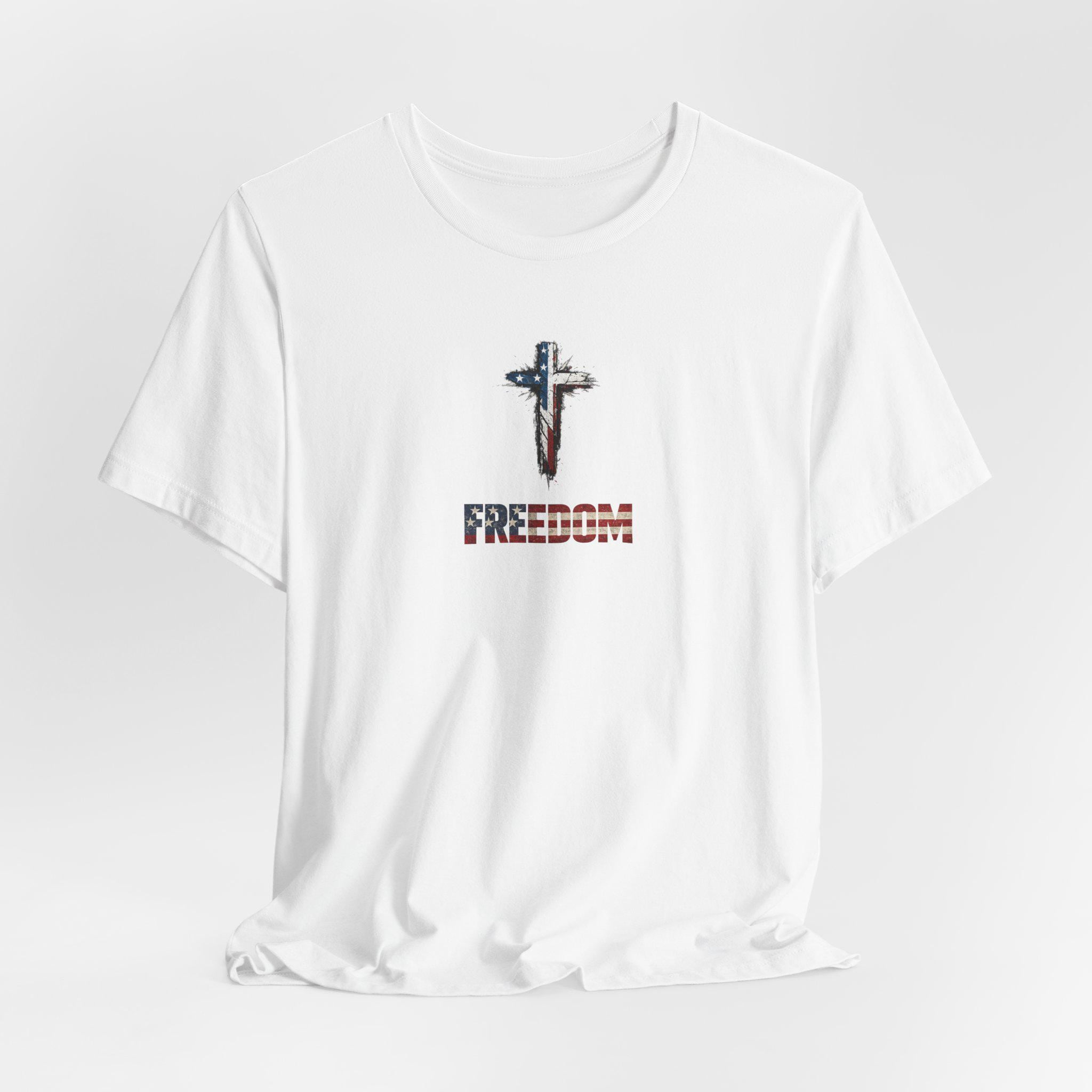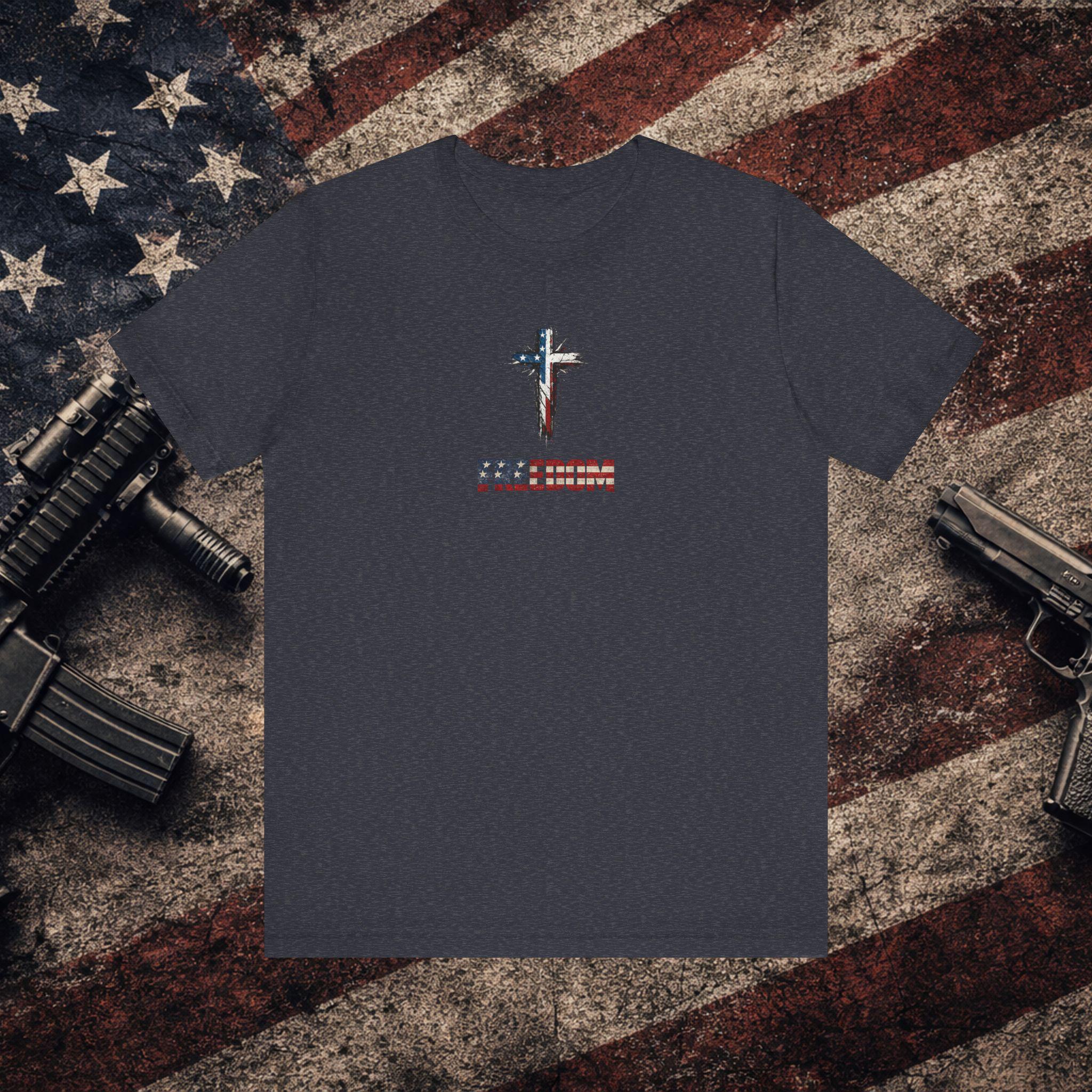 A Premium, soft, lightweight tee that speaks quietly but boldly. This crew-neck shirt pairs a subtle, distressed cross emblem with the word “FREEDOM” in washed, Americana tones — a restrained statement for Sundays at church, backyard barbecues, or long drives down country roads. The fabric breathes and moves with you; the retail fit stays neat under a jacket or worn loose with denim. It’s made to be lived in: gentle on the skin, easy to layer, and built to keep its shape through many wears and washes.
