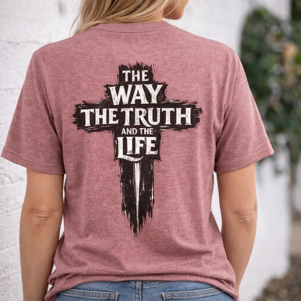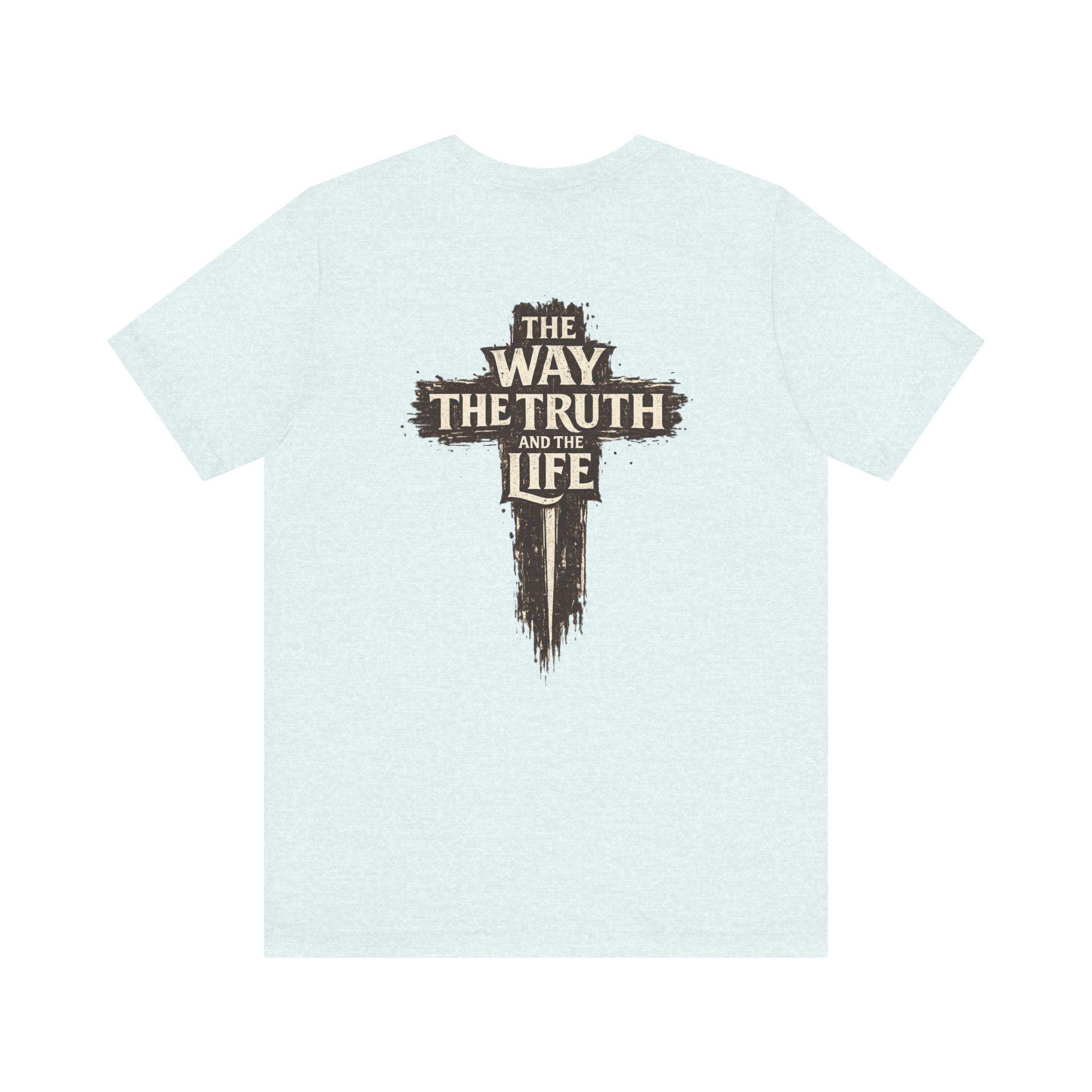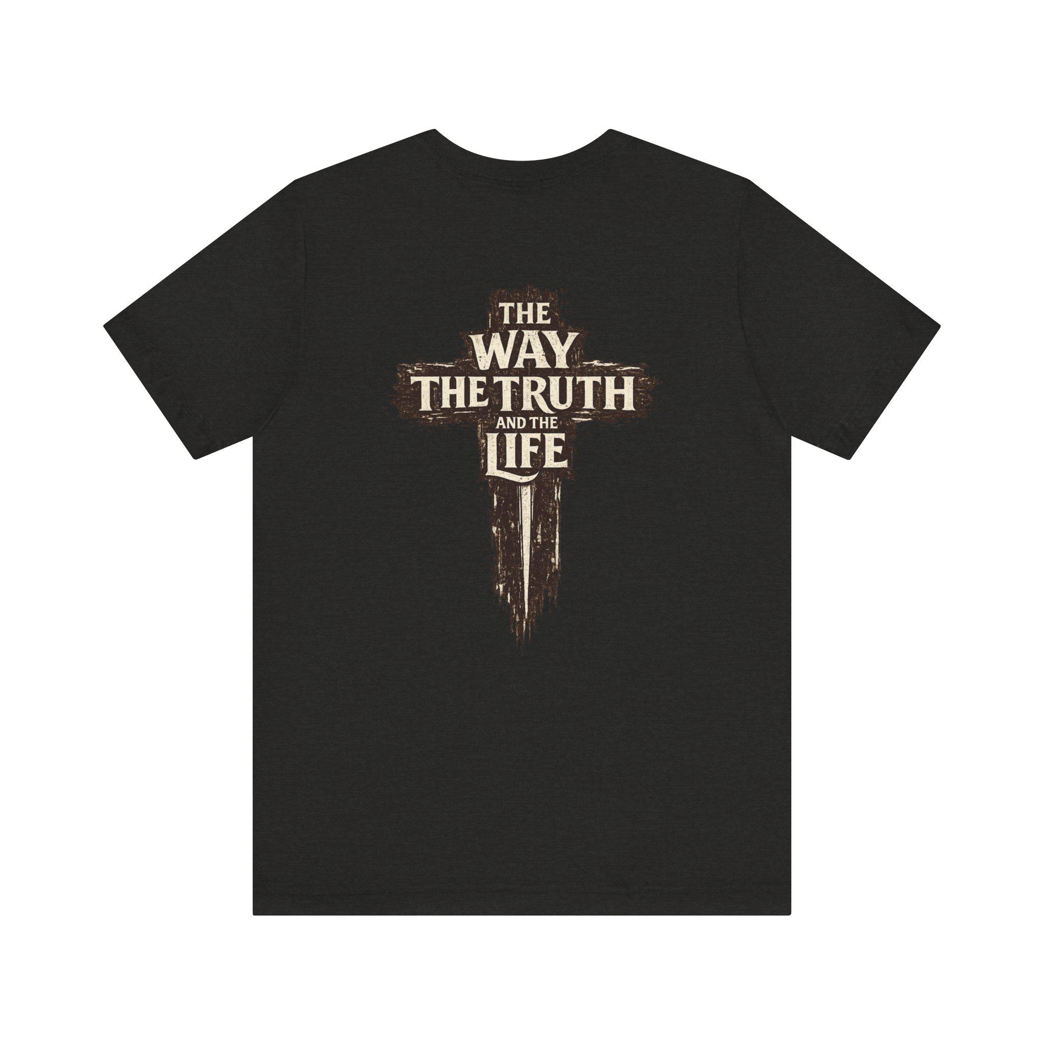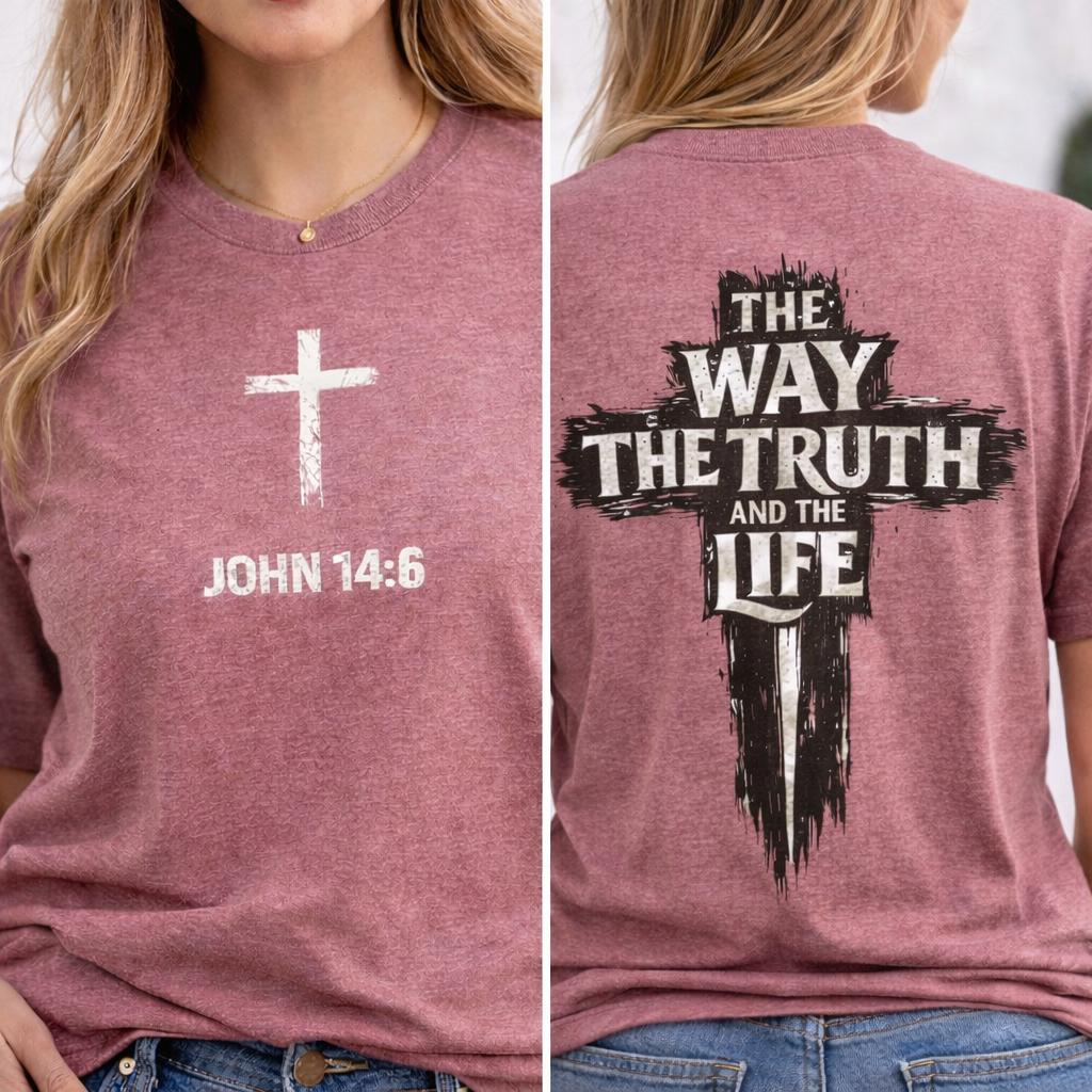 The front of the tee features a subtle yet powerful design with a small cross and the verse reference “JOHN 14:6,” serving as a quiet reminder of the truth. On the back, a distressed cross motif is complemented by the bold words “The Way, The Truth and The Life,” making a clear faith-forward statement that resonates with believers and inspires conversations.