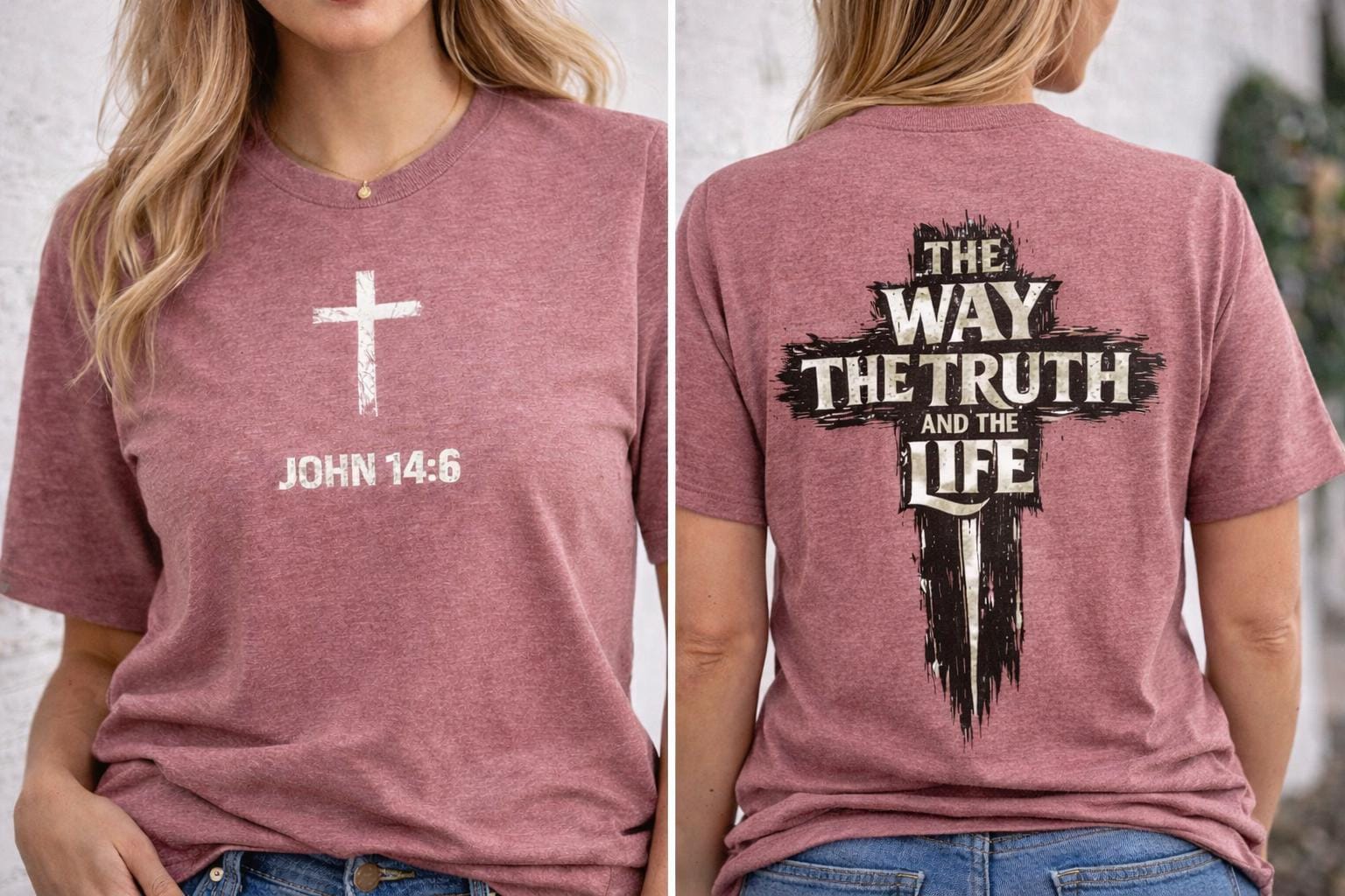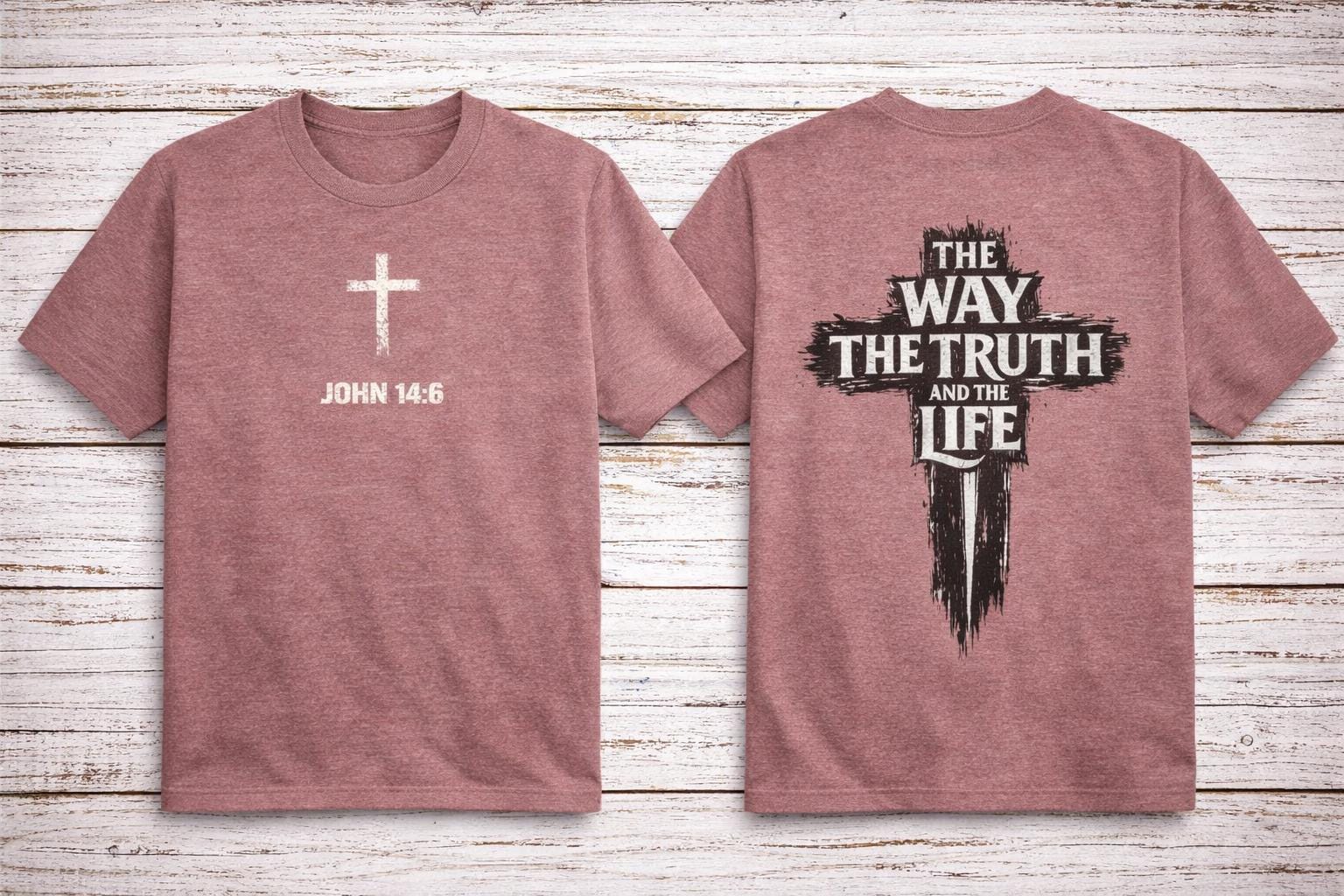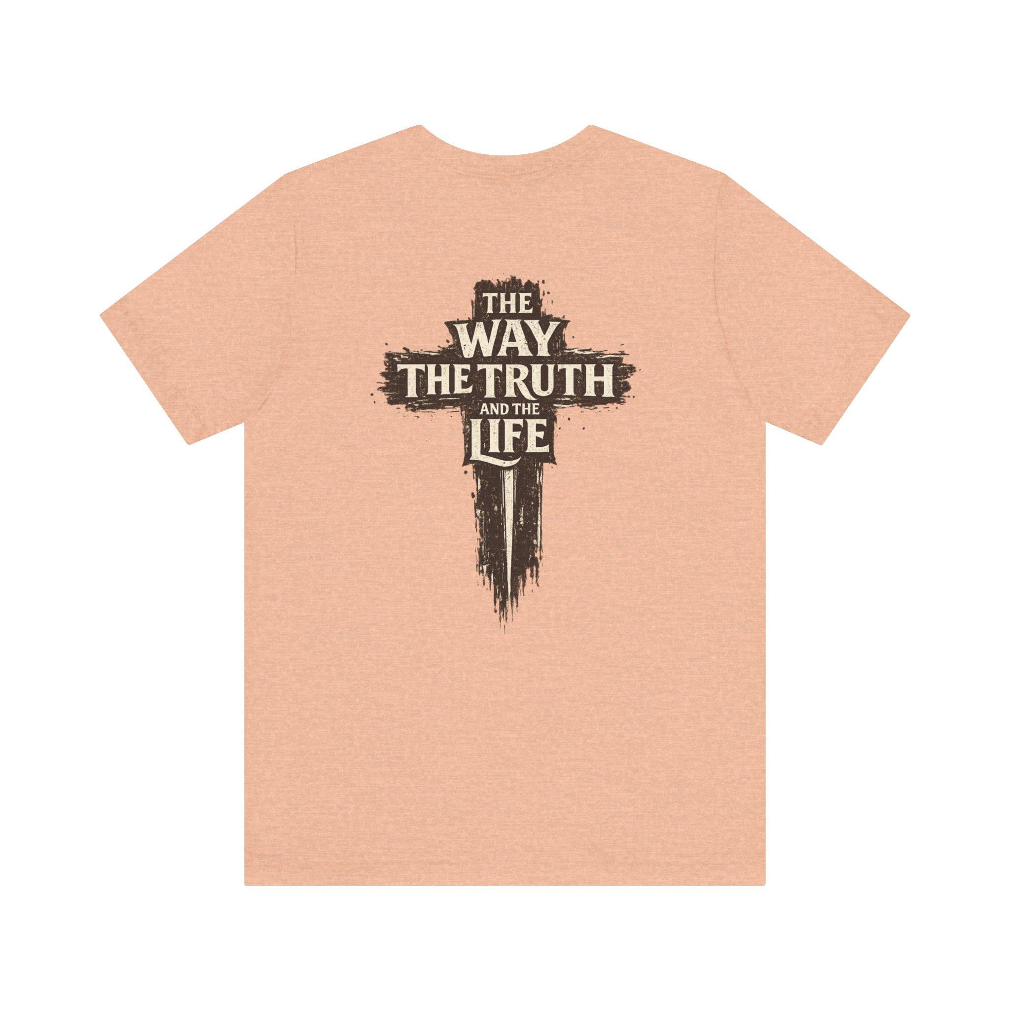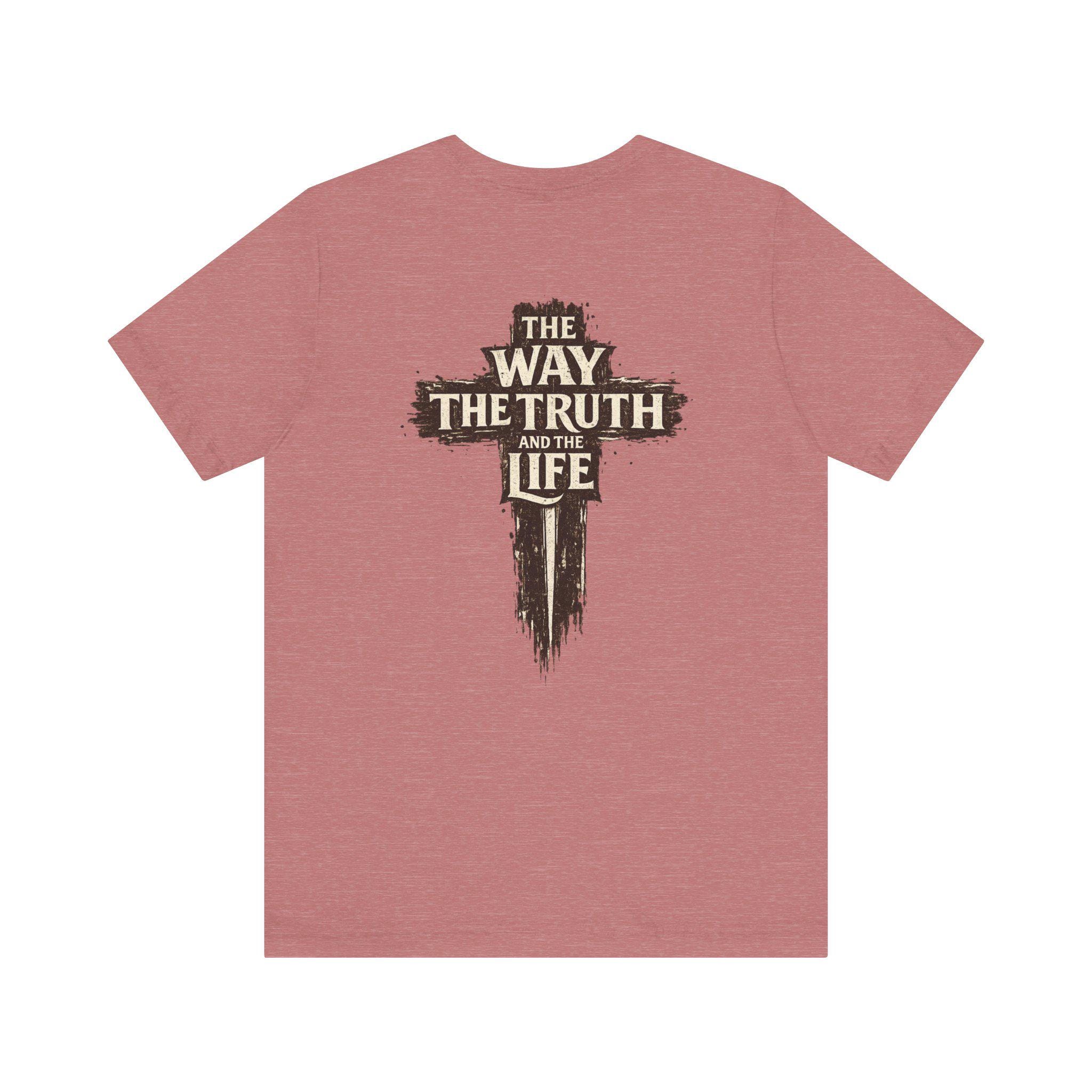 The front of the tee features a subtle yet powerful design with a small cross and the verse reference “JOHN 14:6,” serving as a quiet reminder of the truth. On the back, a distressed cross motif is complemented by the bold words “The Way, The Truth and The Life,” making a clear faith-forward statement that resonates with believers and inspires conversations.