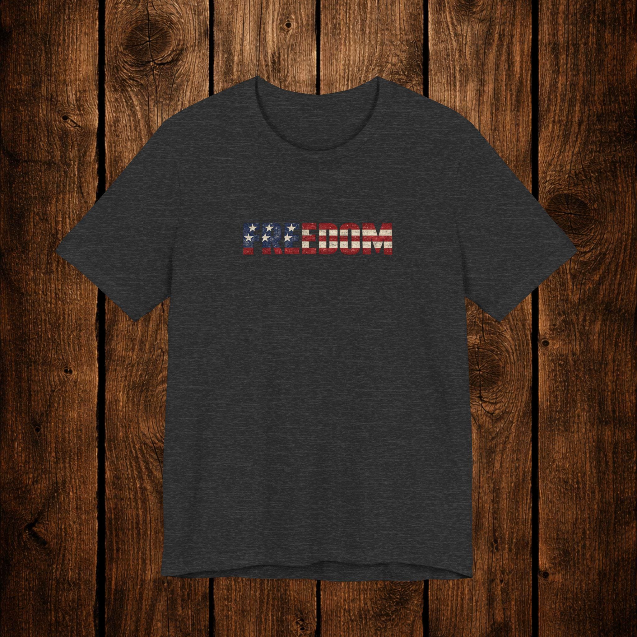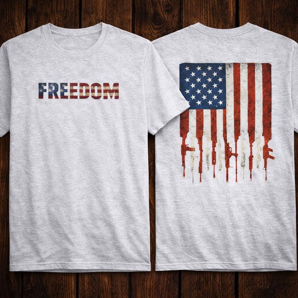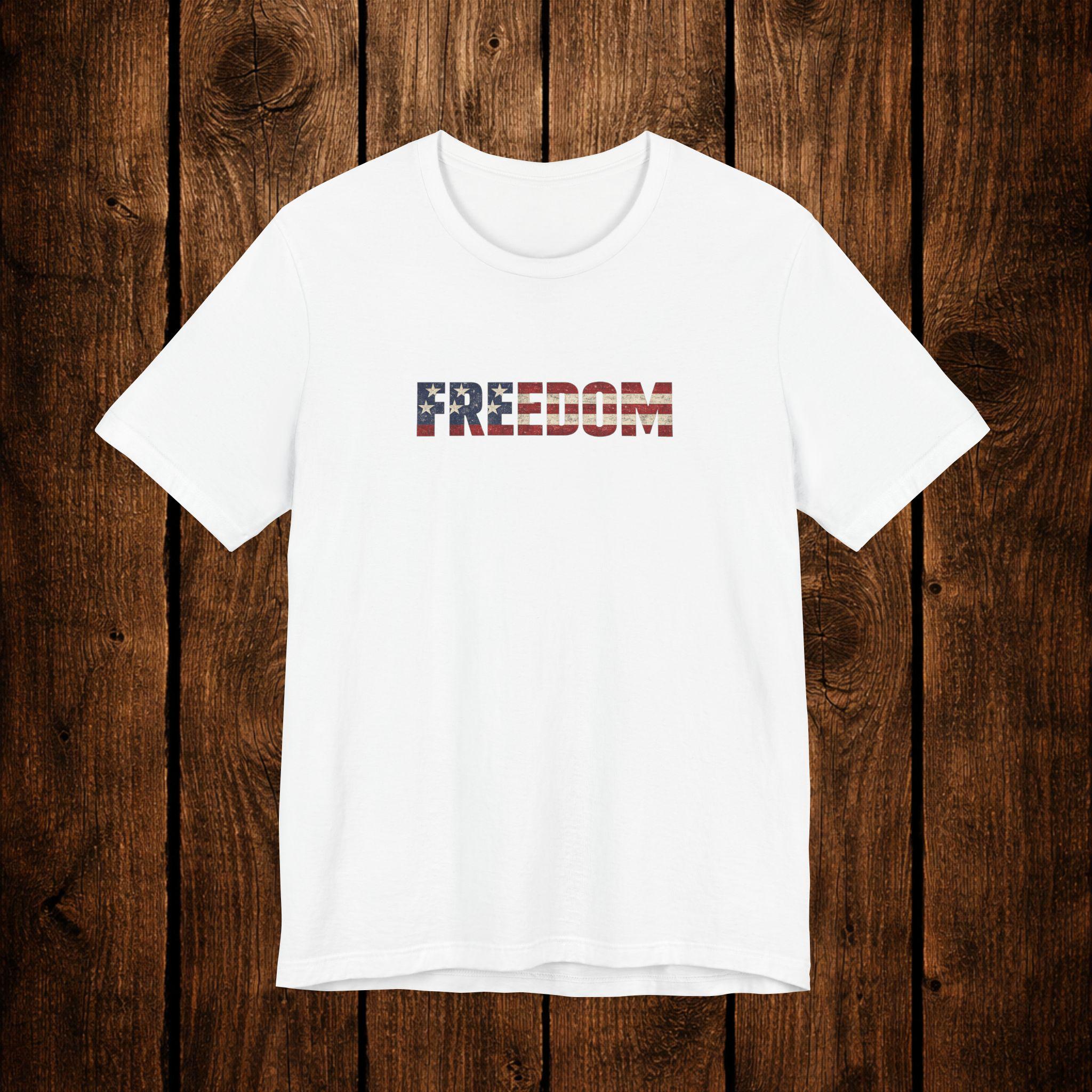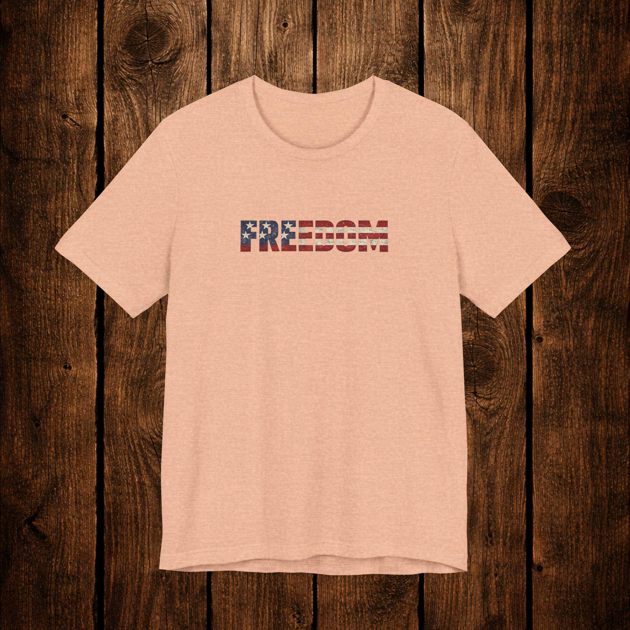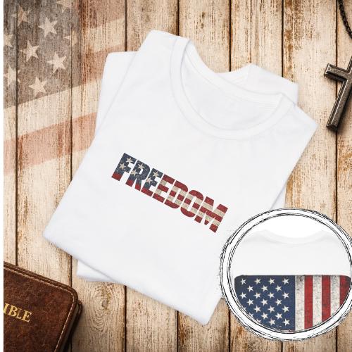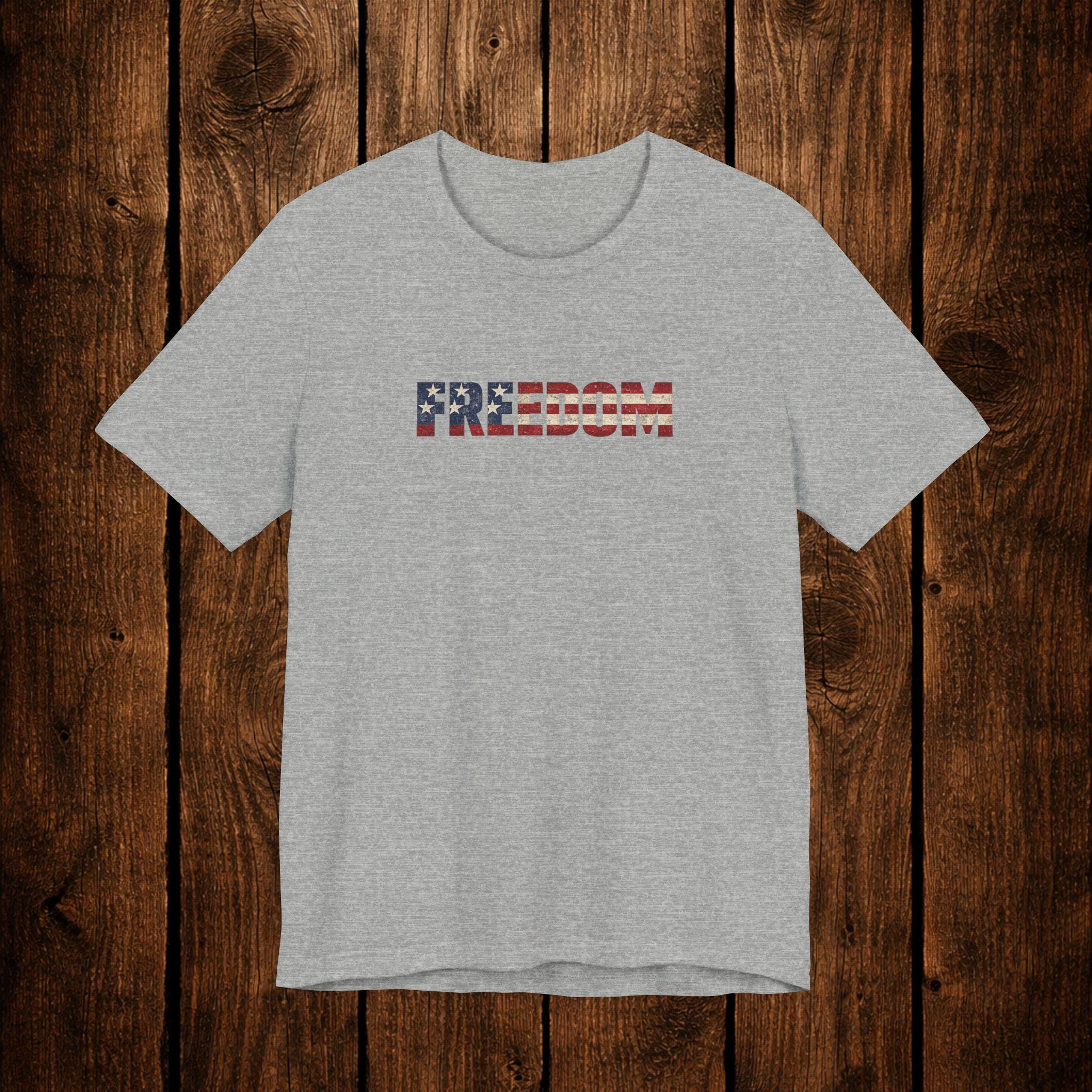 Wear your Patriotism, with this Premium, Bella Canvas, Light, breathable, and honest tee. — this tee speaks quietly but confidently. The front carries a distressed, star-spangled “FREEDOM” across the chest; the back shows a weathered American flag that melts into bold, military-inspired silhouettes. Wear it when you want to show steady pride without shouting. It layers easily under jackets for dawn hikes, sits comfortable at backyard cookouts, and moves with you during weekend projects. The soft Airlume cotton feels lived-in from the first wear, and details like the ribbed collar, shoulder tape, and side seams keep the shape steady through many washes. Ethically made and REACH certified, this shirt fits into a life that values craftsmanship, comfort, and understated patriotism.