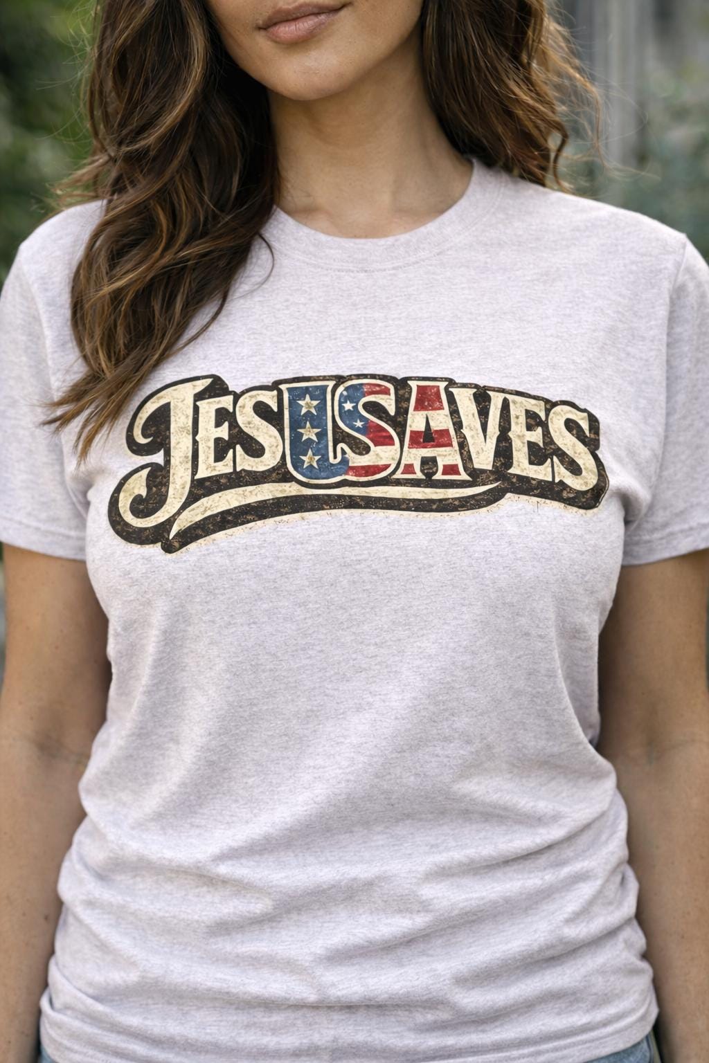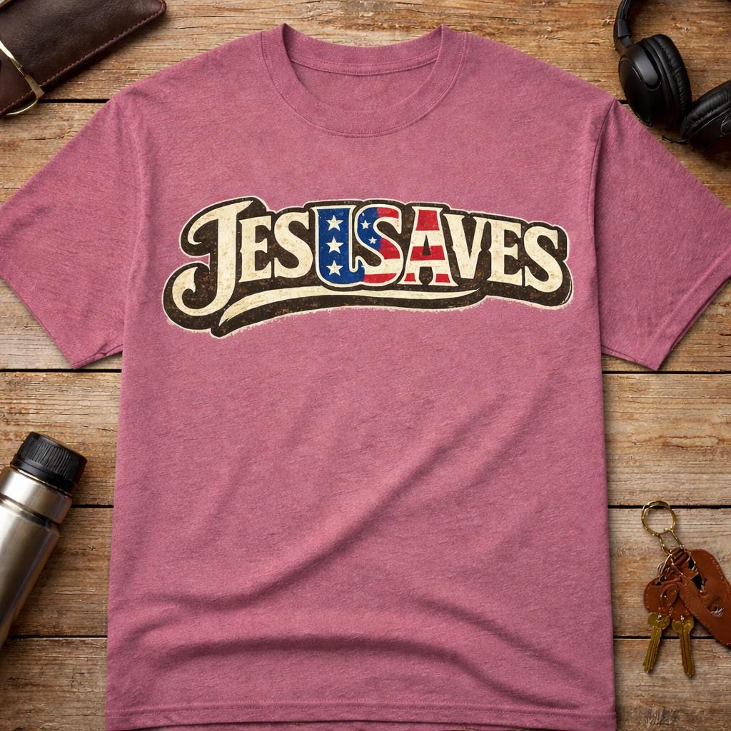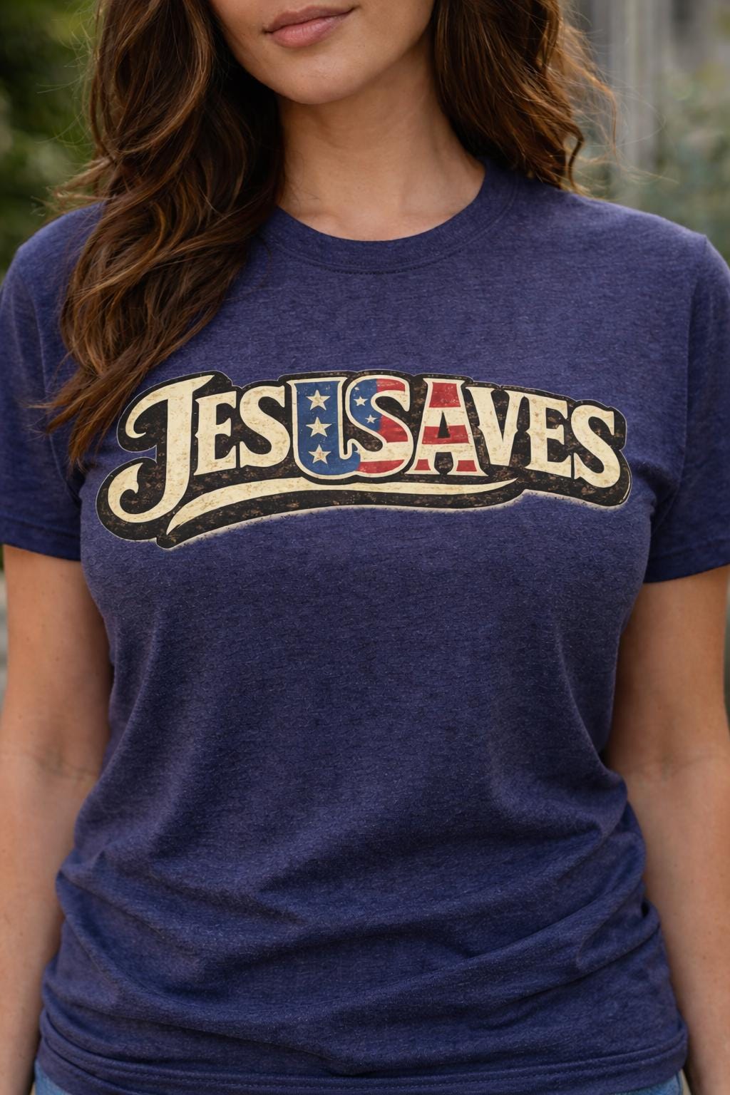 Soft, breathable tee with a vintage-inspired gospel graphic—’JESUS SAVES’ rendered in warm, worn colors with an American flag motif inside the lettering. Lightweight Airlume cotton keeps you comfortable during Sunday service, volunteer shifts, or casual days out. The retail fit and crew neckline make it easy to layer under a jacket or wear alone. Subtle distressing in the print gives the shirt an heirloom feel that blends faith and Americana without shouting. Ethically produced and finished with a tear-away label for comfort.