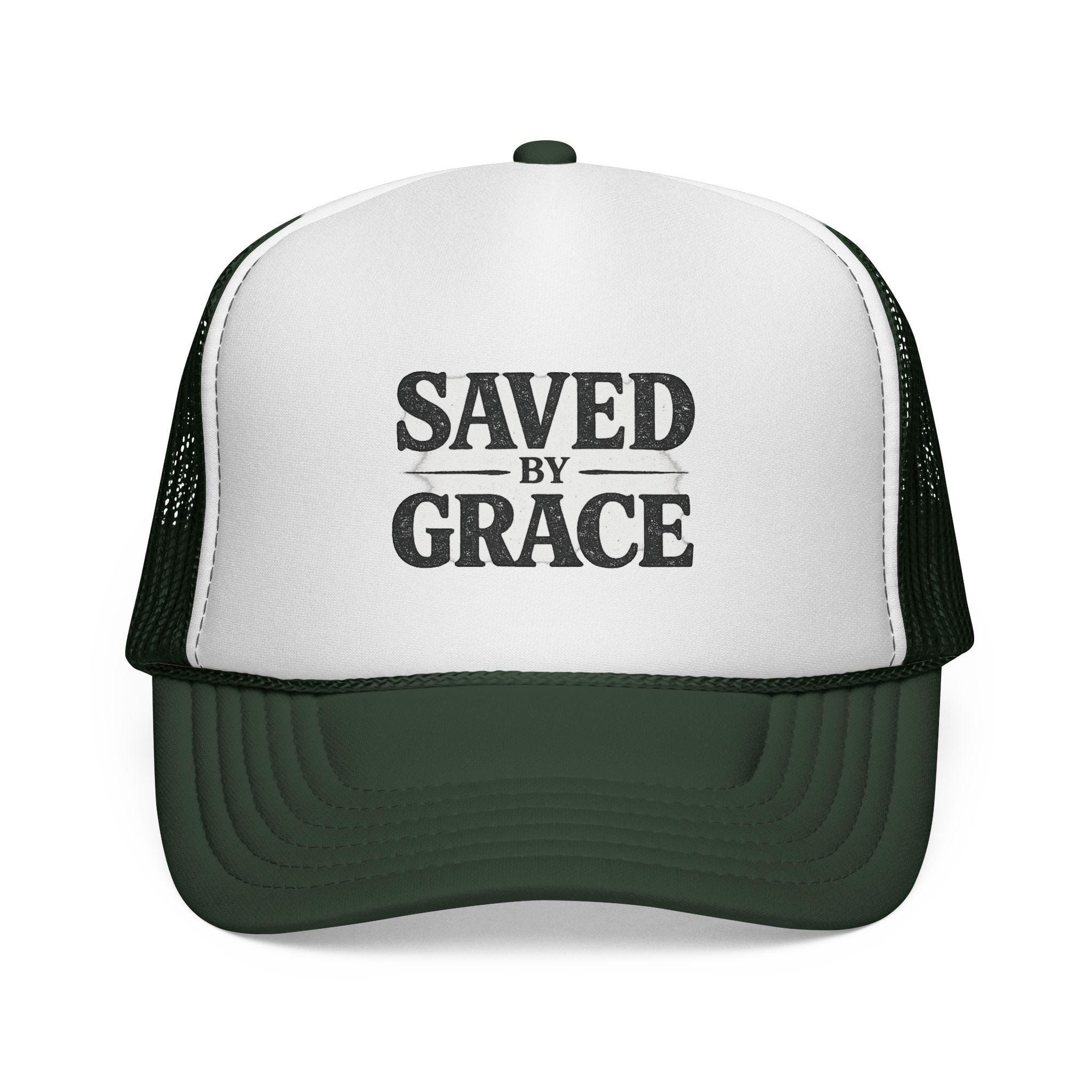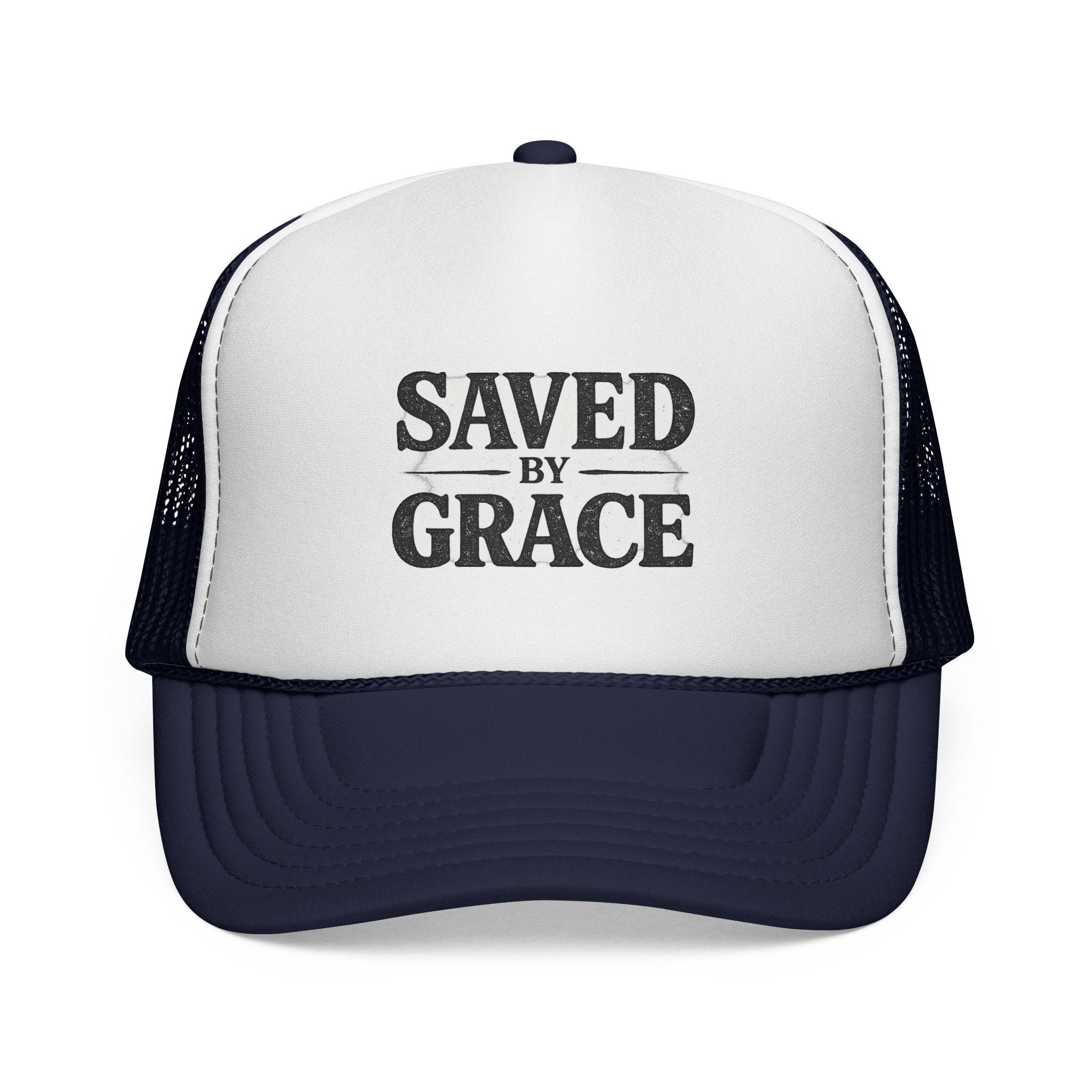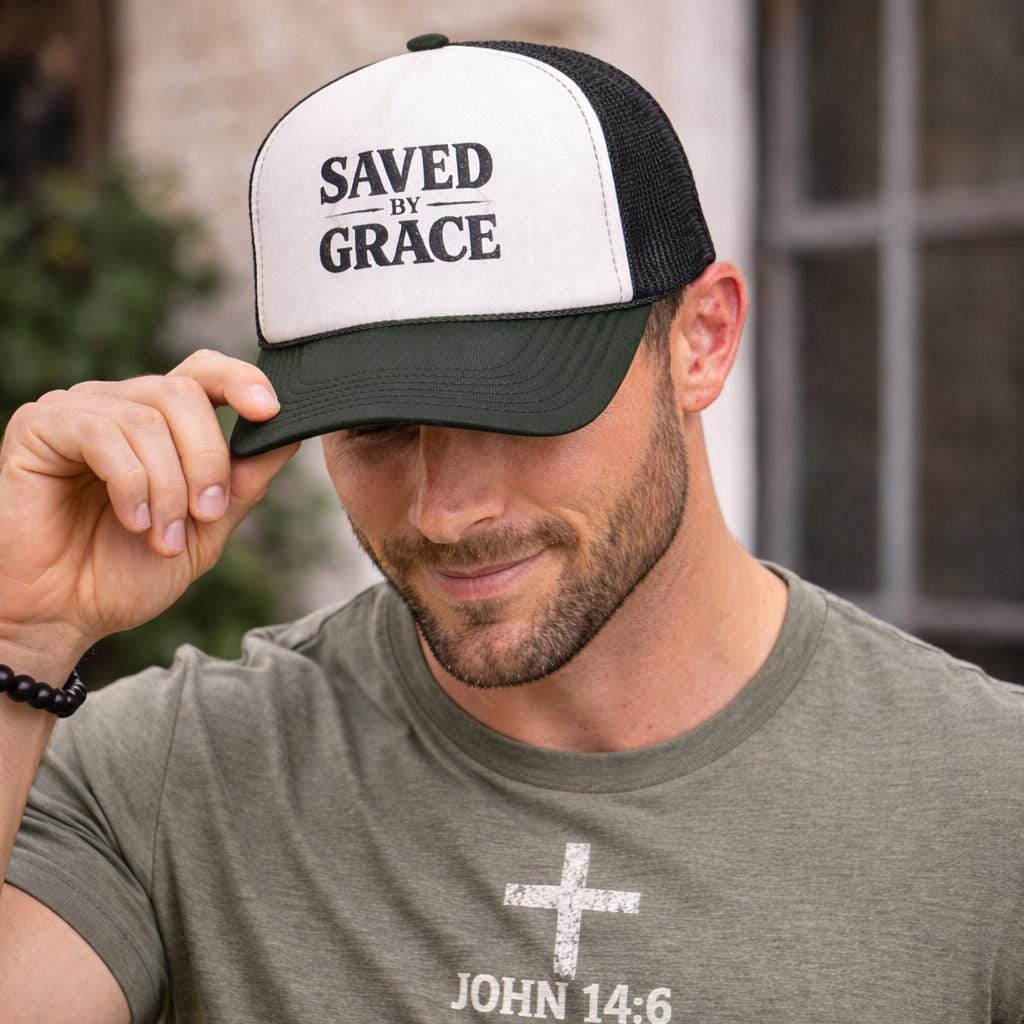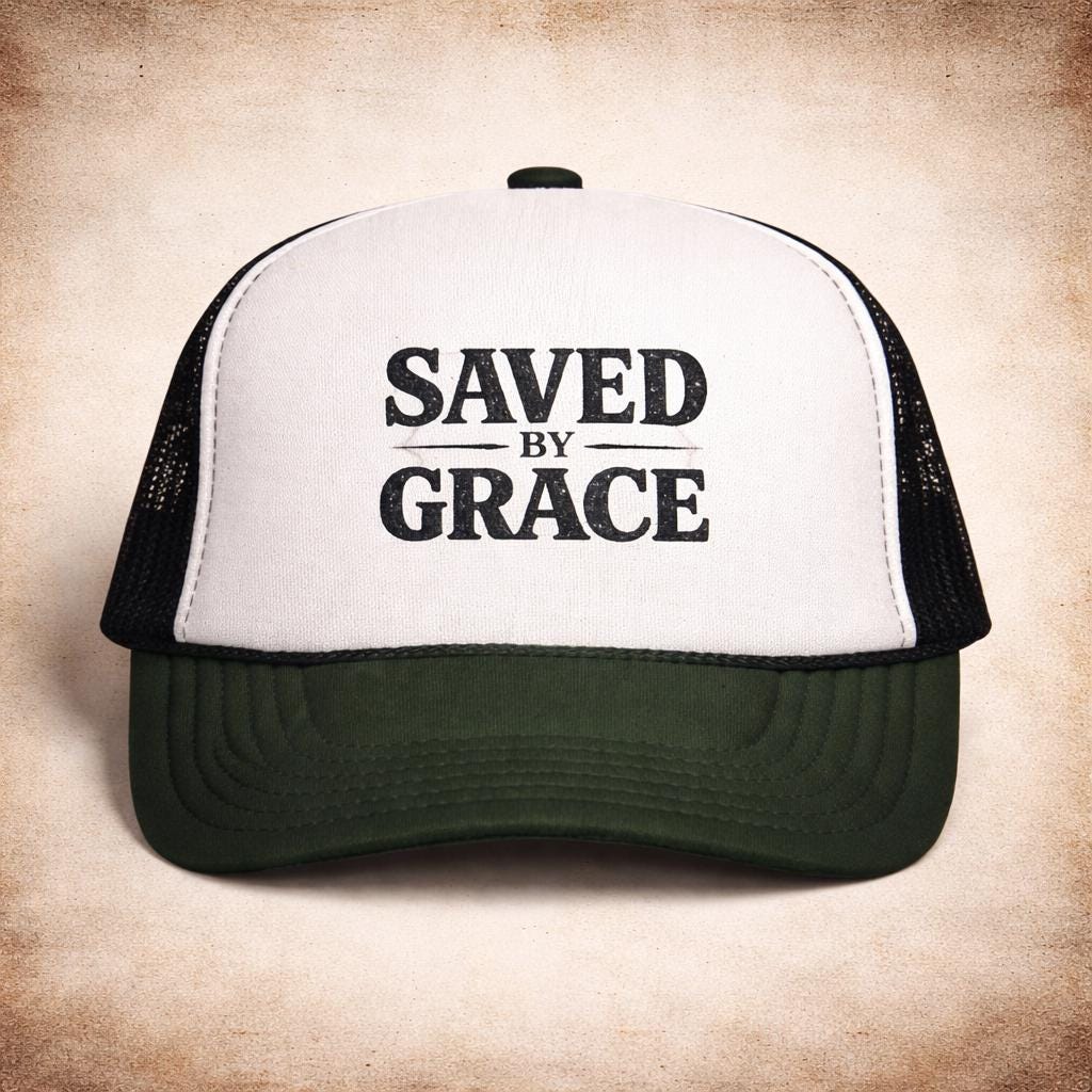 Lightweight and bold — this trucker cap carries a quiet declaration. The structured foam front showcases a vintage-style “SAVED BY GRACE” print, while the ventilated mesh back keeps you cool on long days. It settles into the curve of your head and wears in with you: a low-key statement for church outings, volunteer days, mission trips, or casual weekends when you want your faith to speak without shouting. The muted, slightly distressed lettering reads like something passed down — familiar, steady, unshowy. Pick a color combo that fits your wardrobe and let the cap become part of the rhythm of your life: sun on your face, breeze through the mesh, and a simple phrase that brings a quiet smile.