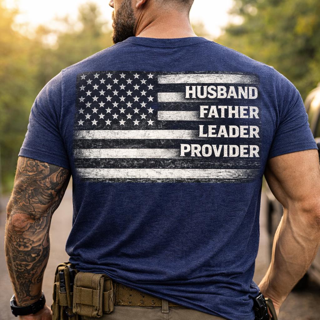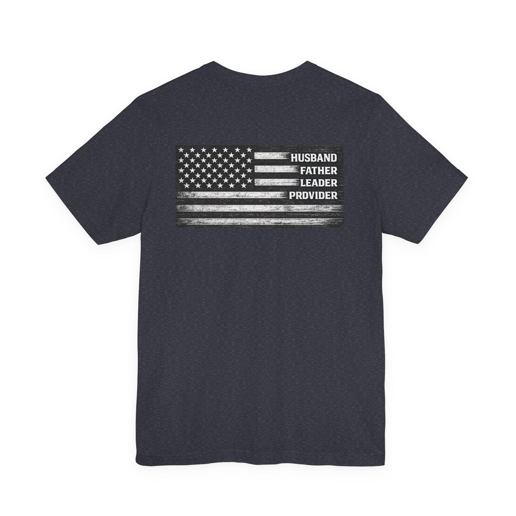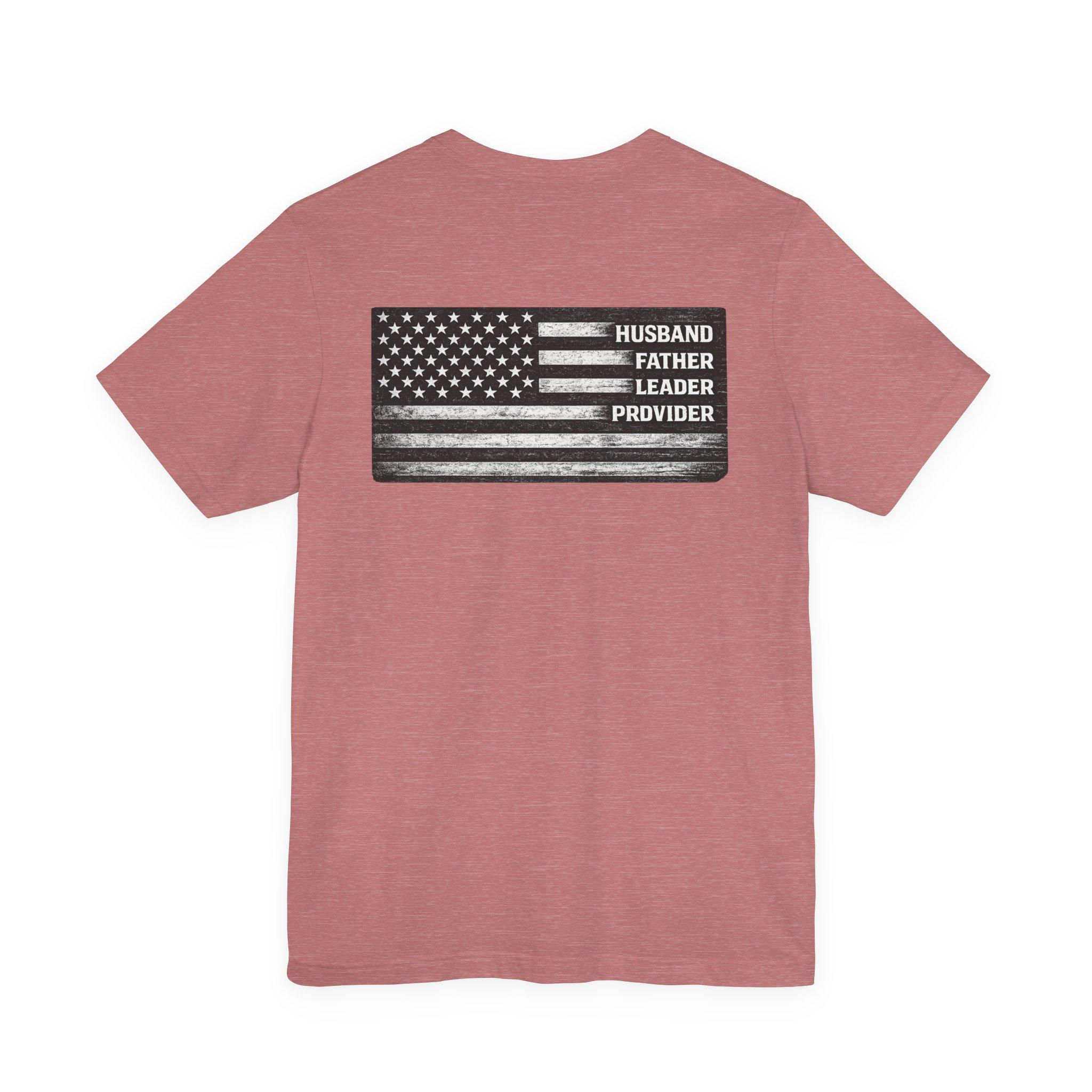 This soft, breathable tee wears like a lived-in favorite from day one. Lightweight Airlume combed cotton gives it a gentle drape and holds shape thanks to side seams and a ribbed knit collar. The front chest carries a small tonal flag; the back shows a distressed flag block that lists roles — Husband, Father, Leader, Provider — rendered in a worn, vintage style. It sits cleanly between casual and slightly dressed-up, layered under a jacket or worn solo on warm afternoons. Thoughtfully made with shoulder tape and a tear-away label for comfort, and produced under responsible labor practices. The muted, weathered design reads quiet and grounded — for someone who values steady presence over flash.