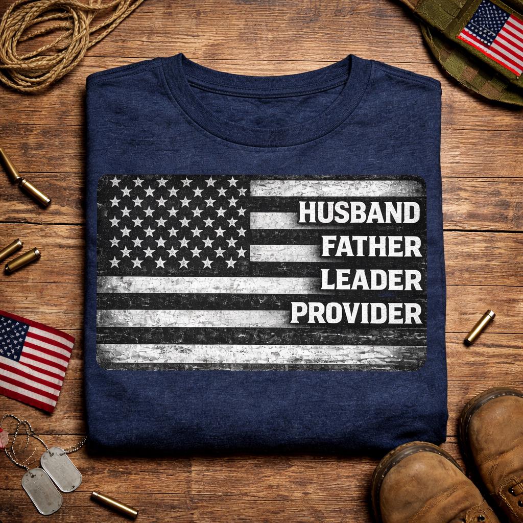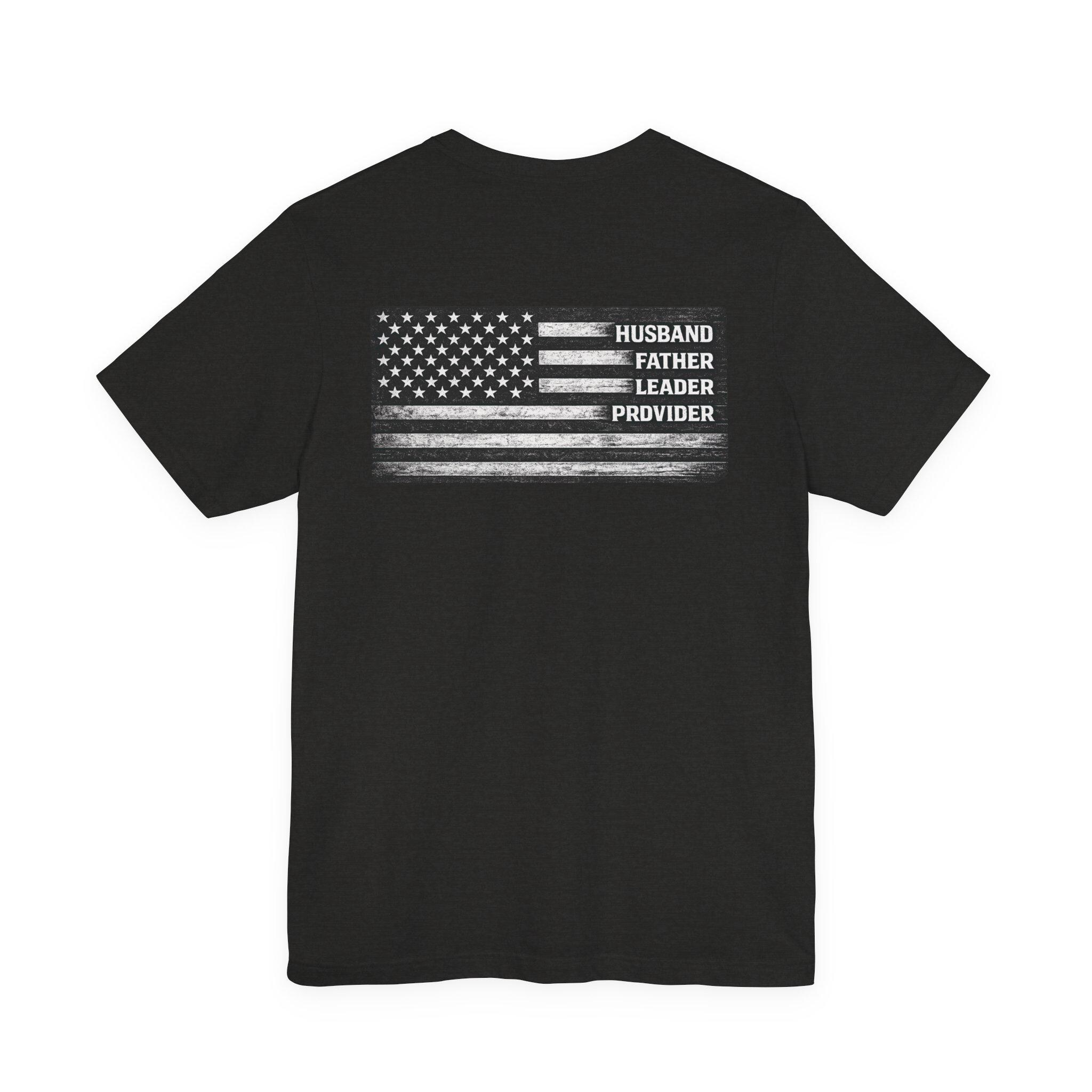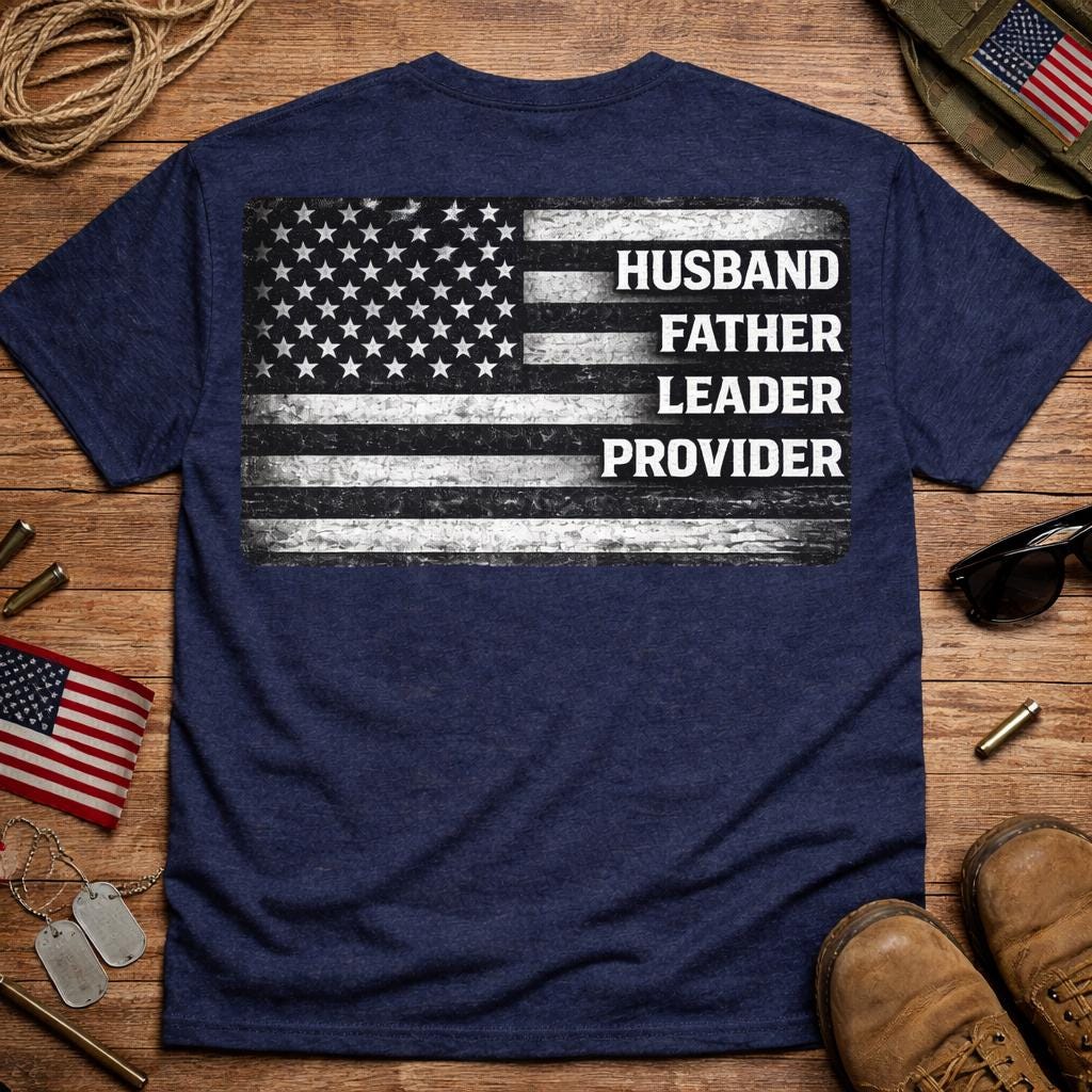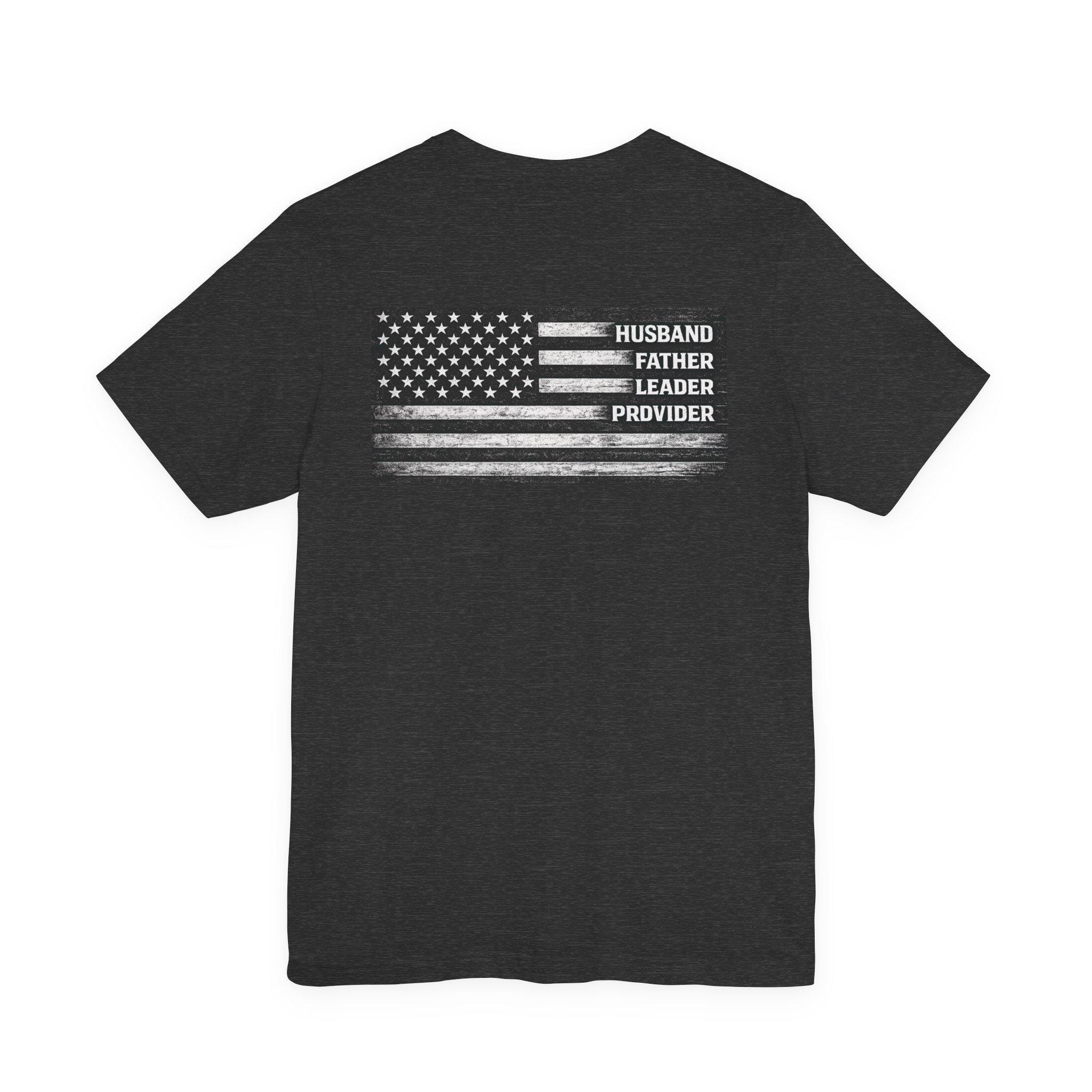 This soft, breathable tee wears like a lived-in favorite from day one. Lightweight Airlume combed cotton gives it a gentle drape and holds shape thanks to side seams and a ribbed knit collar. The front chest carries a small tonal flag; the back shows a distressed flag block that lists roles — Husband, Father, Leader, Provider — rendered in a worn, vintage style. It sits cleanly between casual and slightly dressed-up, layered under a jacket or worn solo on warm afternoons. Thoughtfully made with shoulder tape and a tear-away label for comfort, and produced under responsible labor practices. The muted, weathered design reads quiet and grounded — for someone who values steady presence over flash.