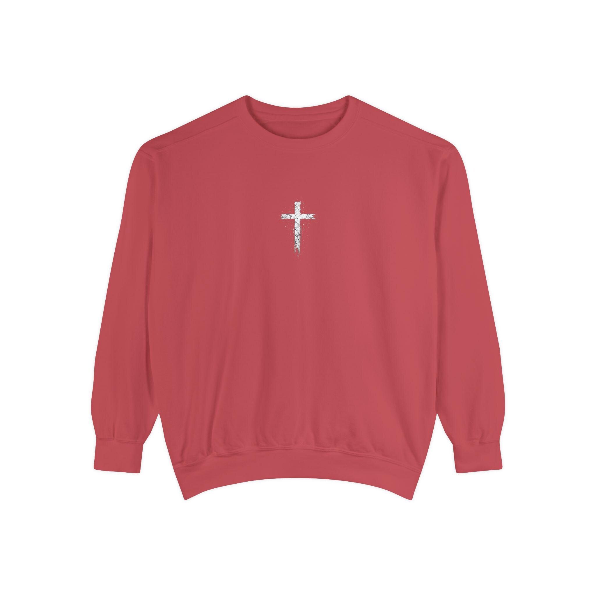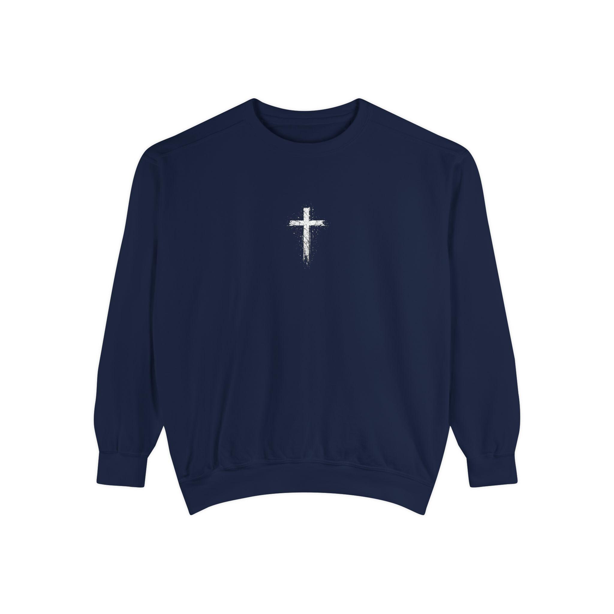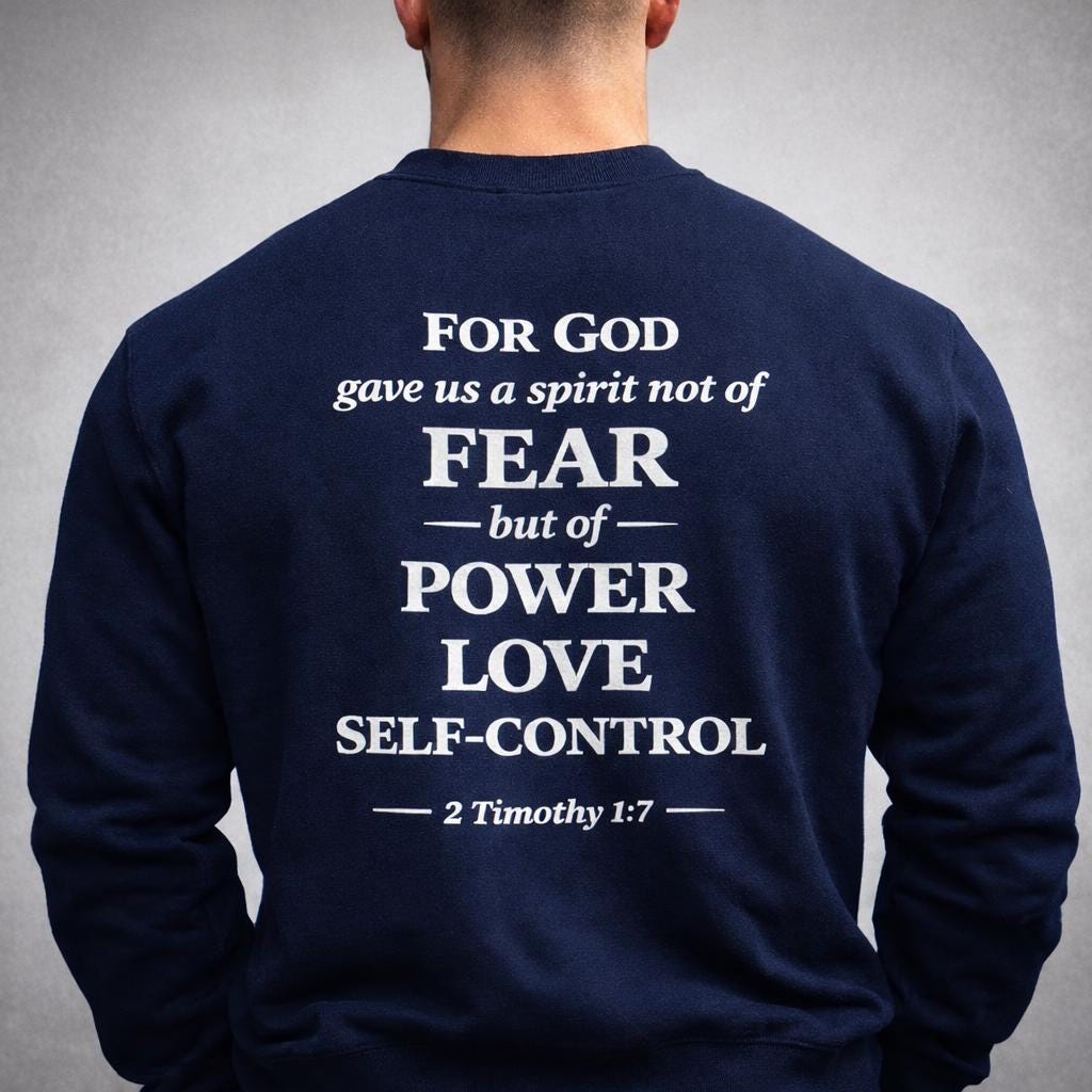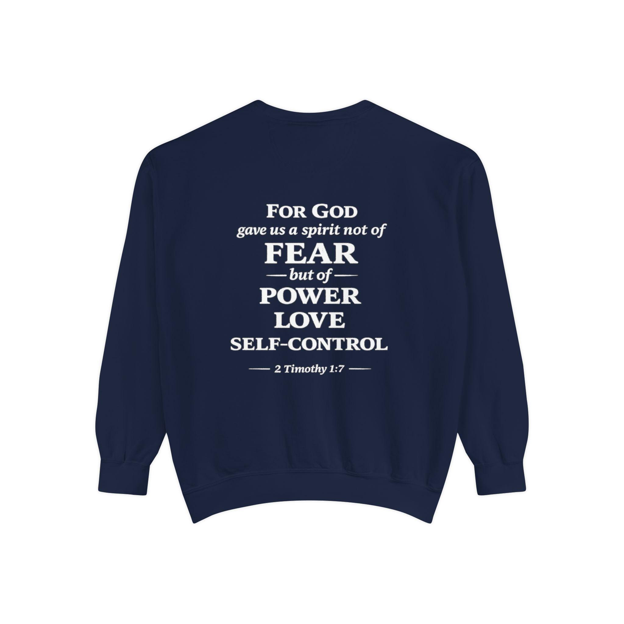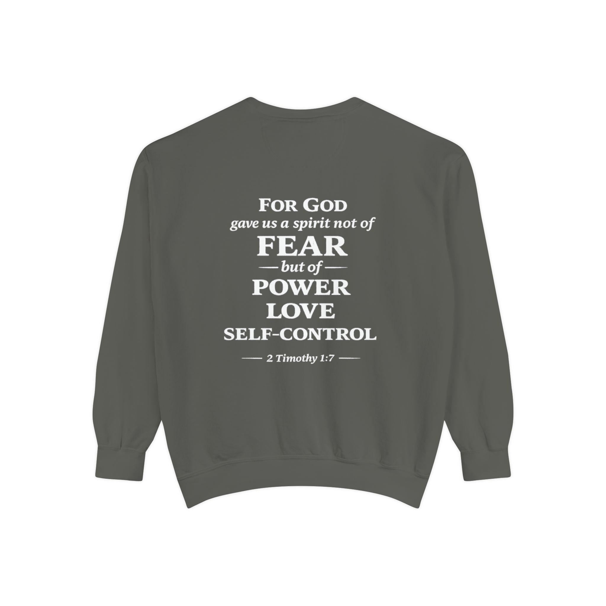 A soft, garment-dyed sweatshirt featuring a subtle distressed cross on the front and a bold, typographic scripture on the back (2 Timothy 1:7). The relaxed, medium-heavy fabric drapes comfortably and the ribbed collar, cuffs, and hem hold their shape after wear. Thoughtful details — like the half-moon neck patch, neck tape, and option for embroidered chest accents — give this piece a lived-in, durable feel. The muted dye and low-impact OEKO-TEX certified colors keep the look grounded and easy to layer with denim or a favorite jacket. This sweatshirt speaks quietly but firmly: faith anchored in courage, love, and self-control, worn for everyday moments when you want your values visible without shouting.