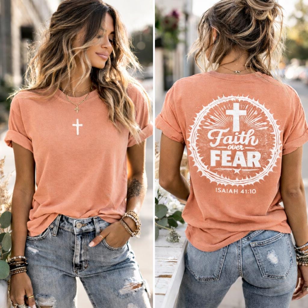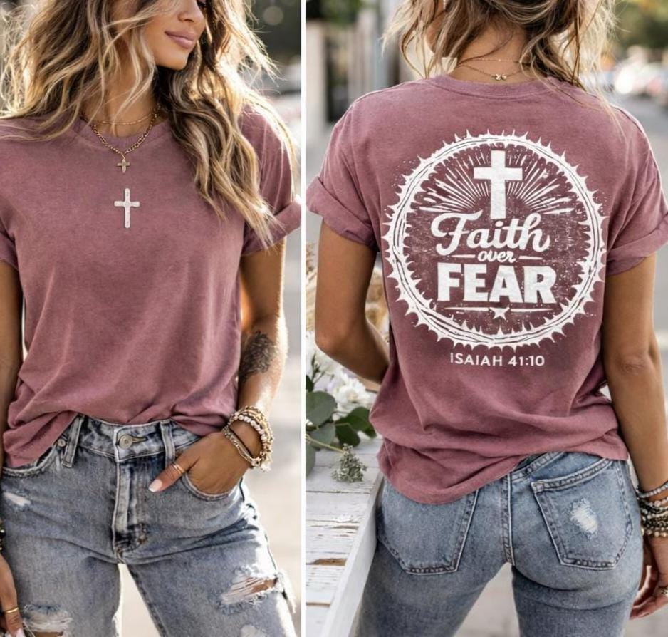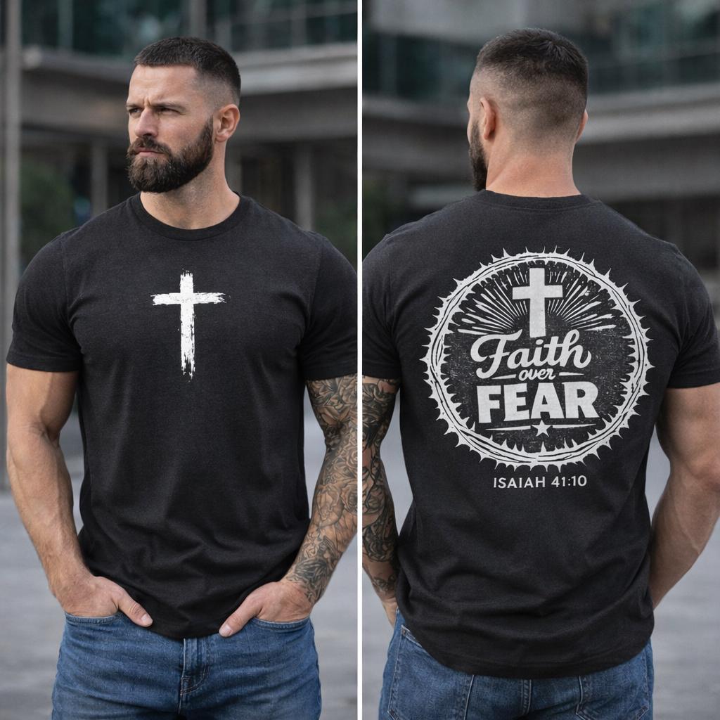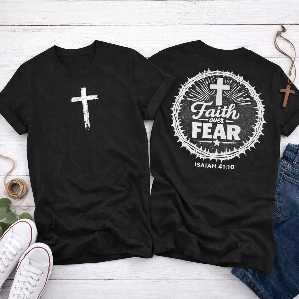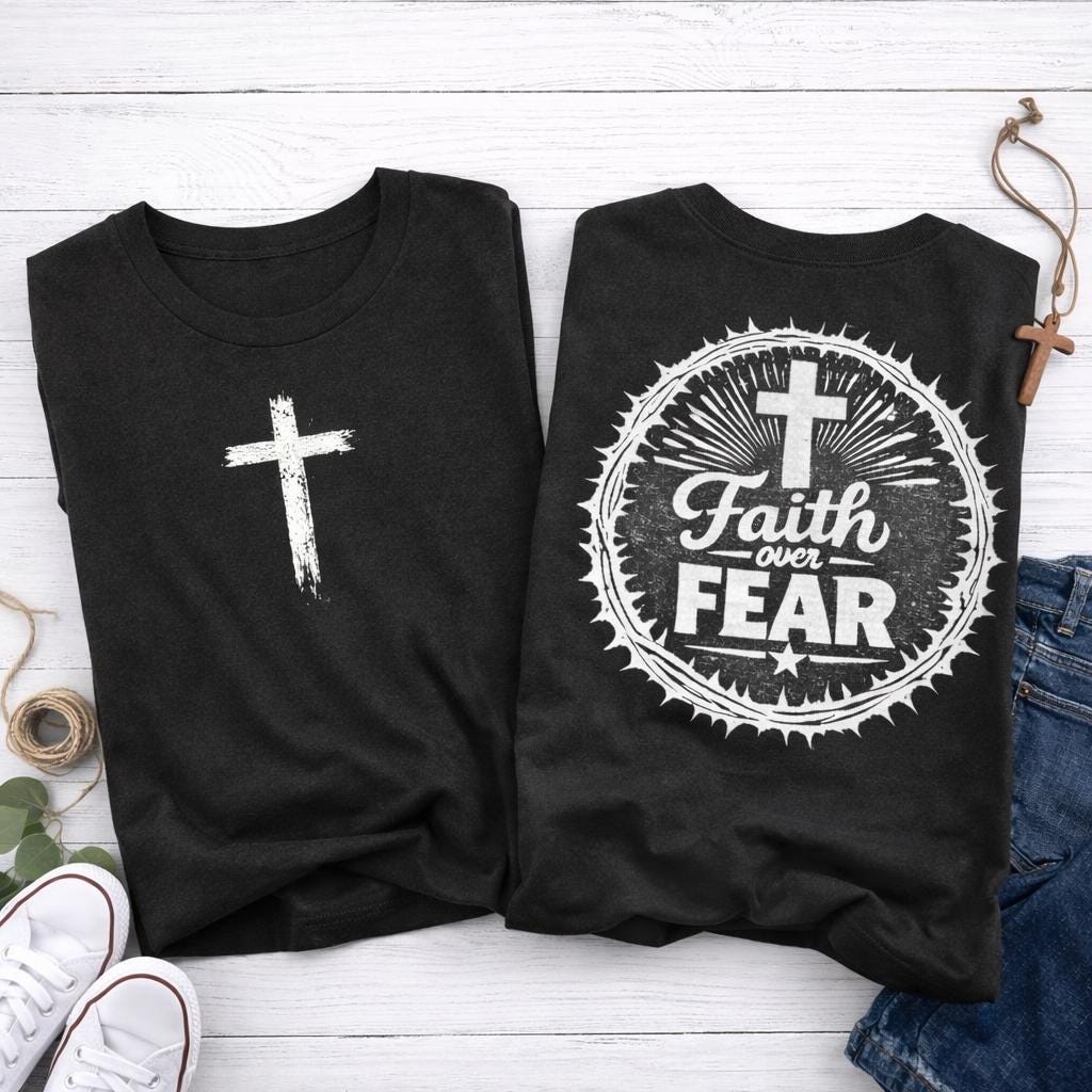- Front small cross and back “Faith over Fear” printed by DTF/DTG methods for crisp, vibrant graphics
