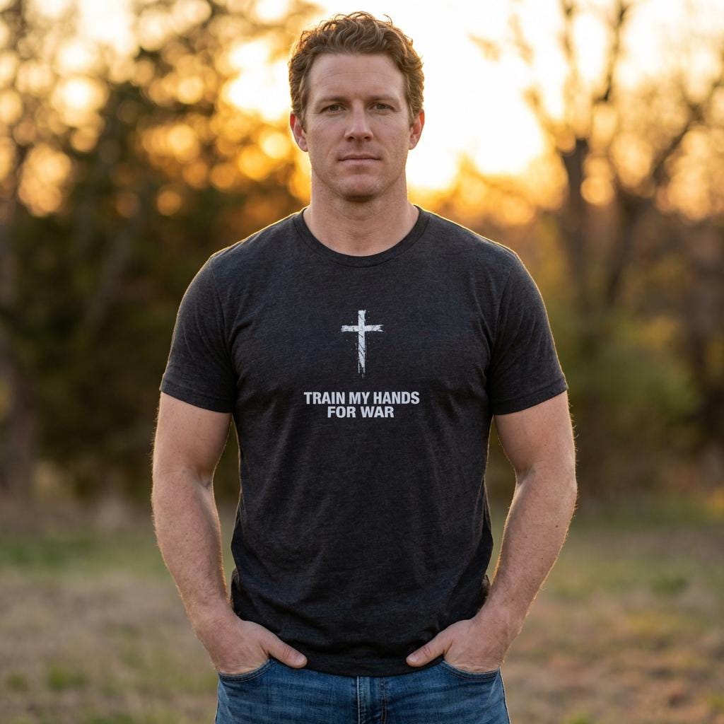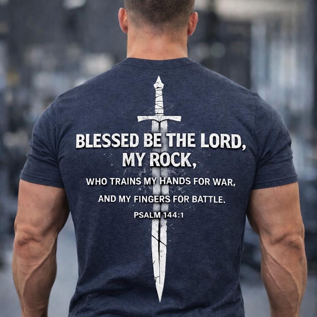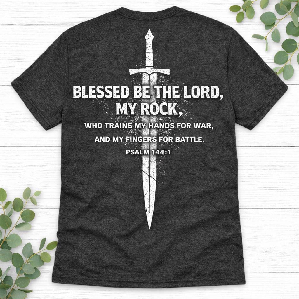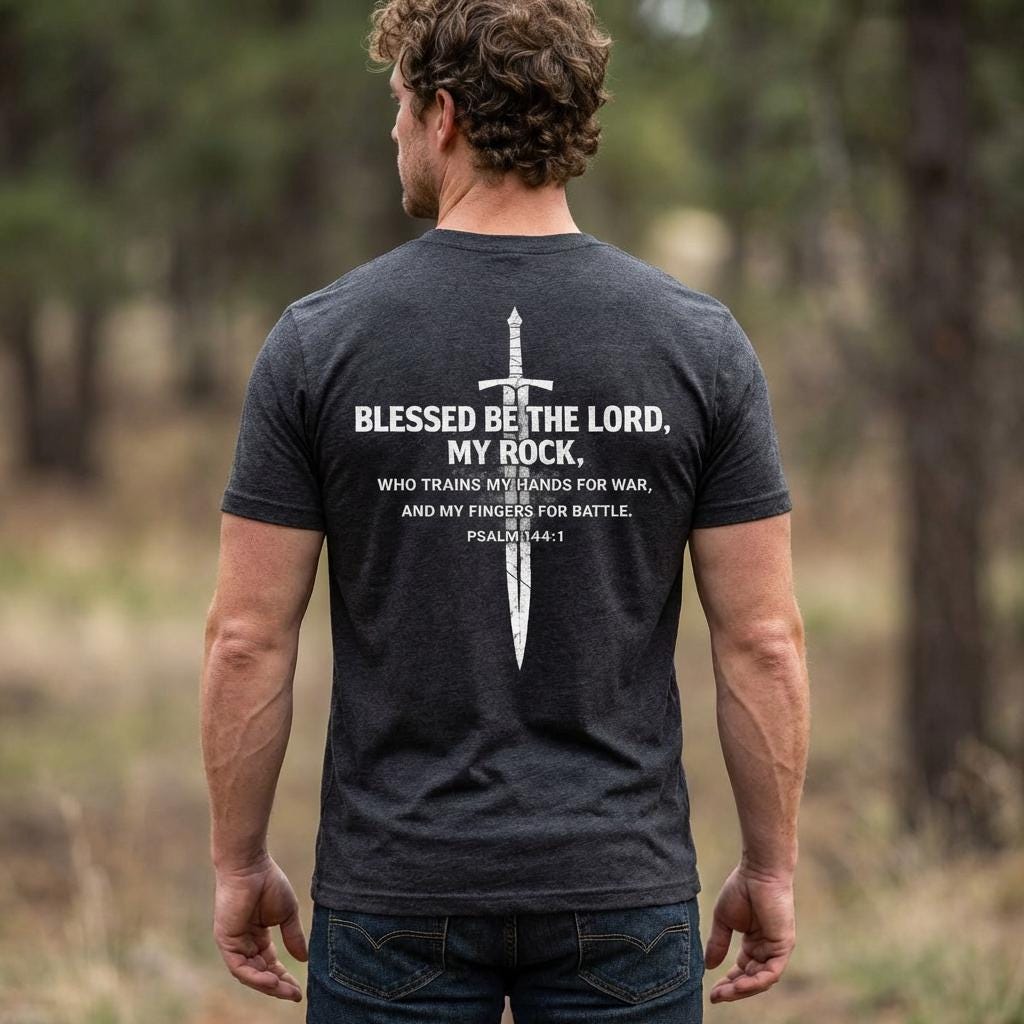 Gear up for spiritual battle with our Prepare My Hands for War | Psalm 144:1 Cross and Sword T-Shirt. This powerful Vintage rugged Christian Scripture Tee combines faith and strength, serving as a daily reminder of divine guidance in life's challenges. Made from soft, high-quality fabric, it’s perfect for everyday wear or as a gift for your loved ones. Whether you're at church, at home, or out and about, this shirt embodies your commitment to faith. Stand strong in your beliefs—order yours today!