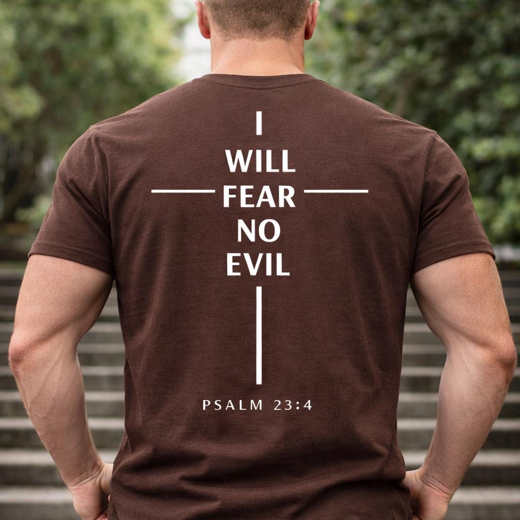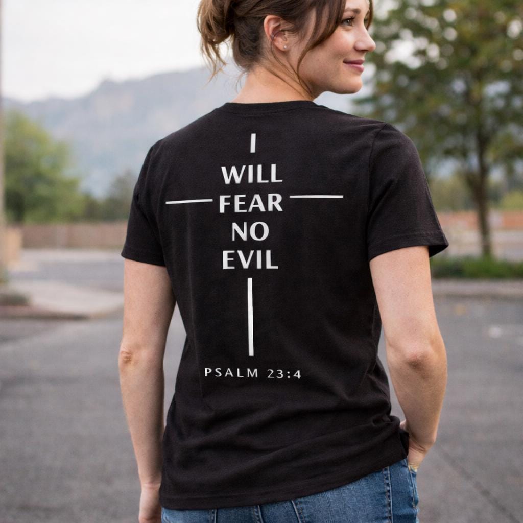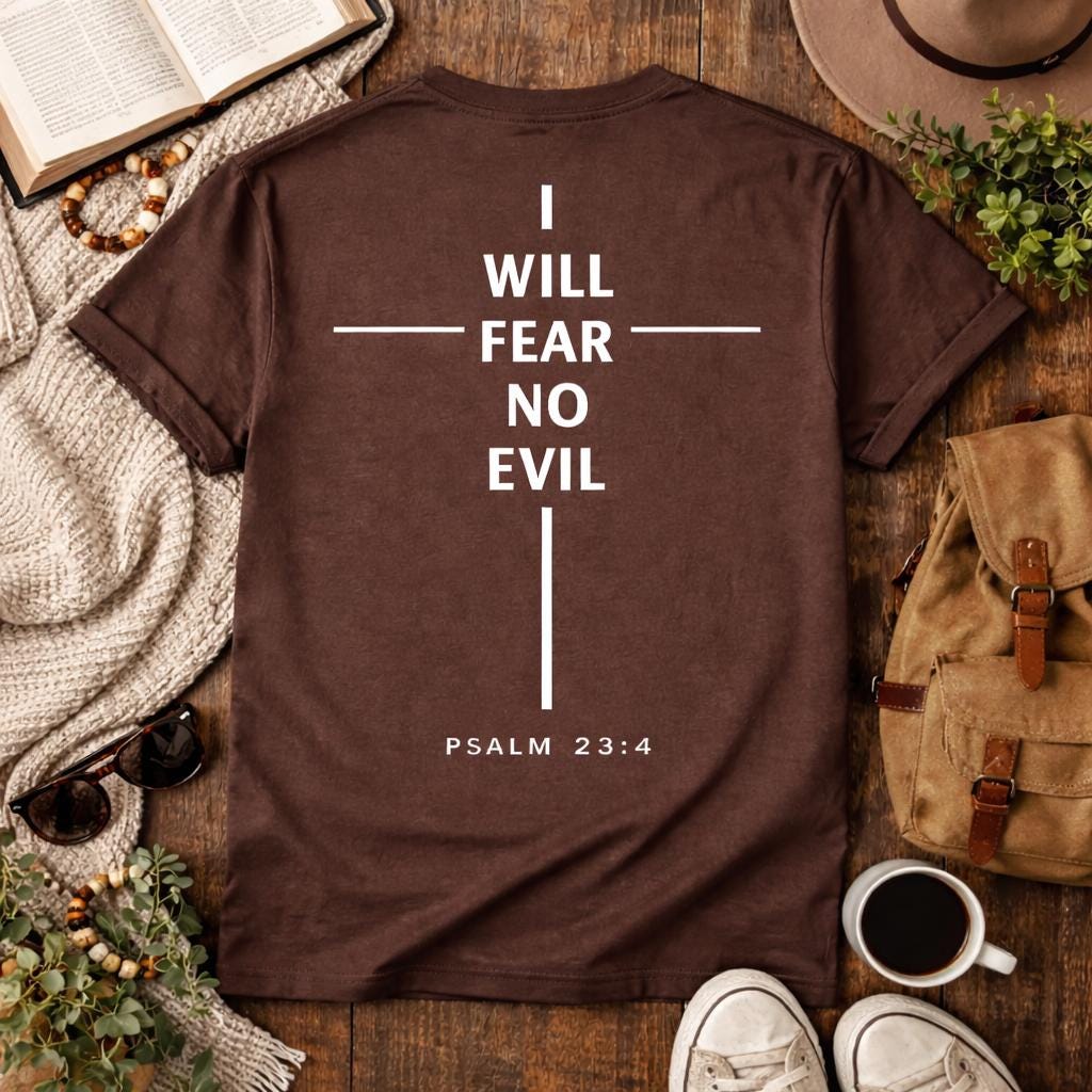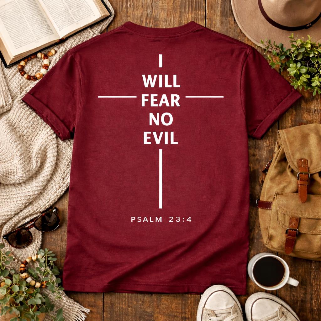 Embrace your faith with our I Will Fear No Evil cross design T-Shirt, inspired by Psalm 23:This stylish and comfortable tee features a beautiful cross graphic and an uplifting scripture to remind you of strength and courage. Perfect for everyday wear or as a thoughtful gift for loved ones. Available in various sizes and colors, it's a perfect addition to your wardrobe or a meaningful gift for someone special. Wear your faith proudly!