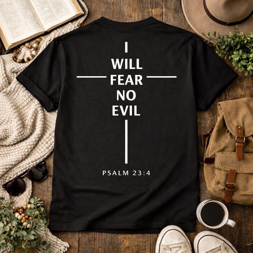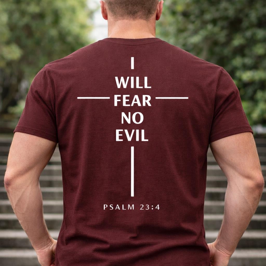- Back minimalist cross print with "I WILL FEAR NO EVIL" and "PSALM 23:4" (DTF/DTG printing methods used)
