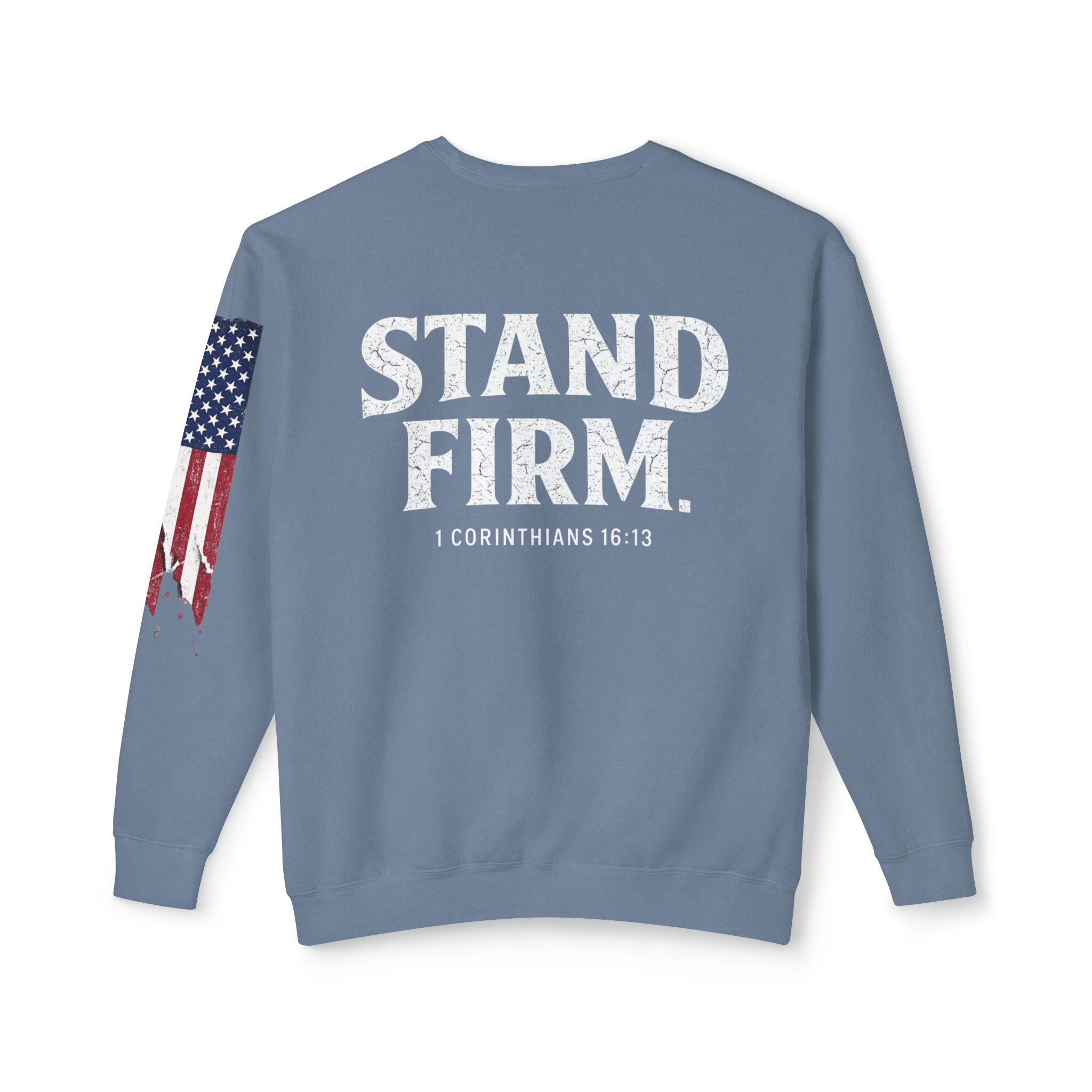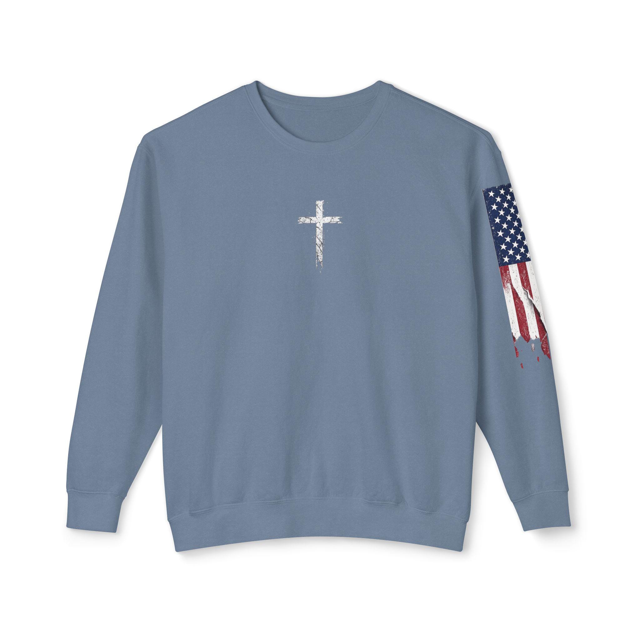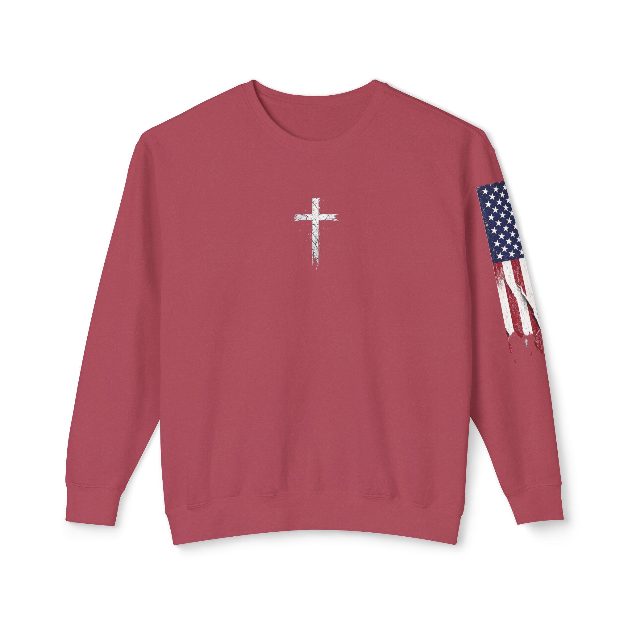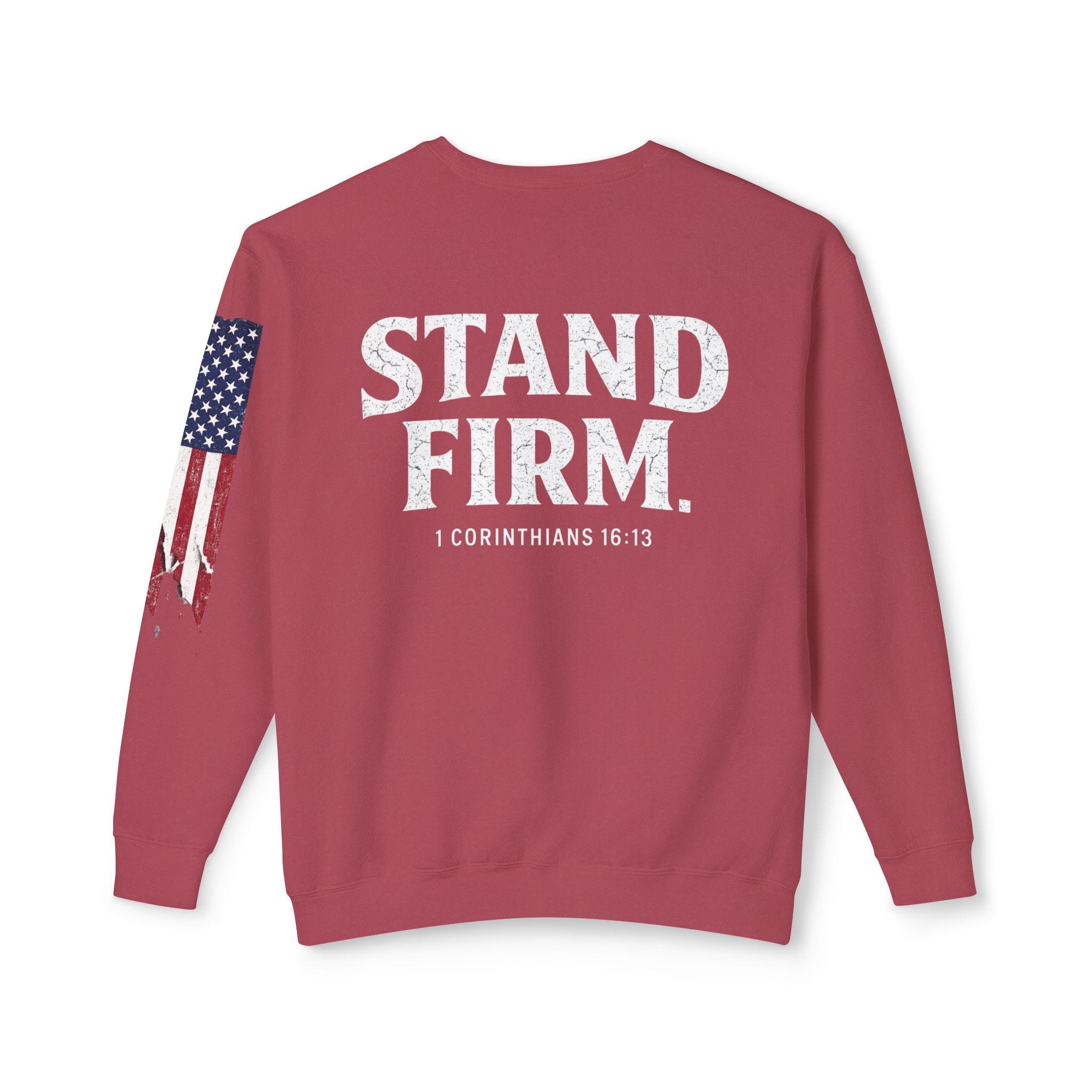 Embrace your faith in style with our light weight Stand Firm cross Comfort Colors sweatshirt! This cozy Christian crewneck features a striking American flag sleeve, making it a perfect blend of comfort and patriotism. Ideal for everyday wear or special gatherings, this sweatshirt serves as a reminder to stand strong in your beliefs. Available in various sizes and colors, it's a must-have addition to your wardrobe. Show your love for faith and country with this unique piece today!