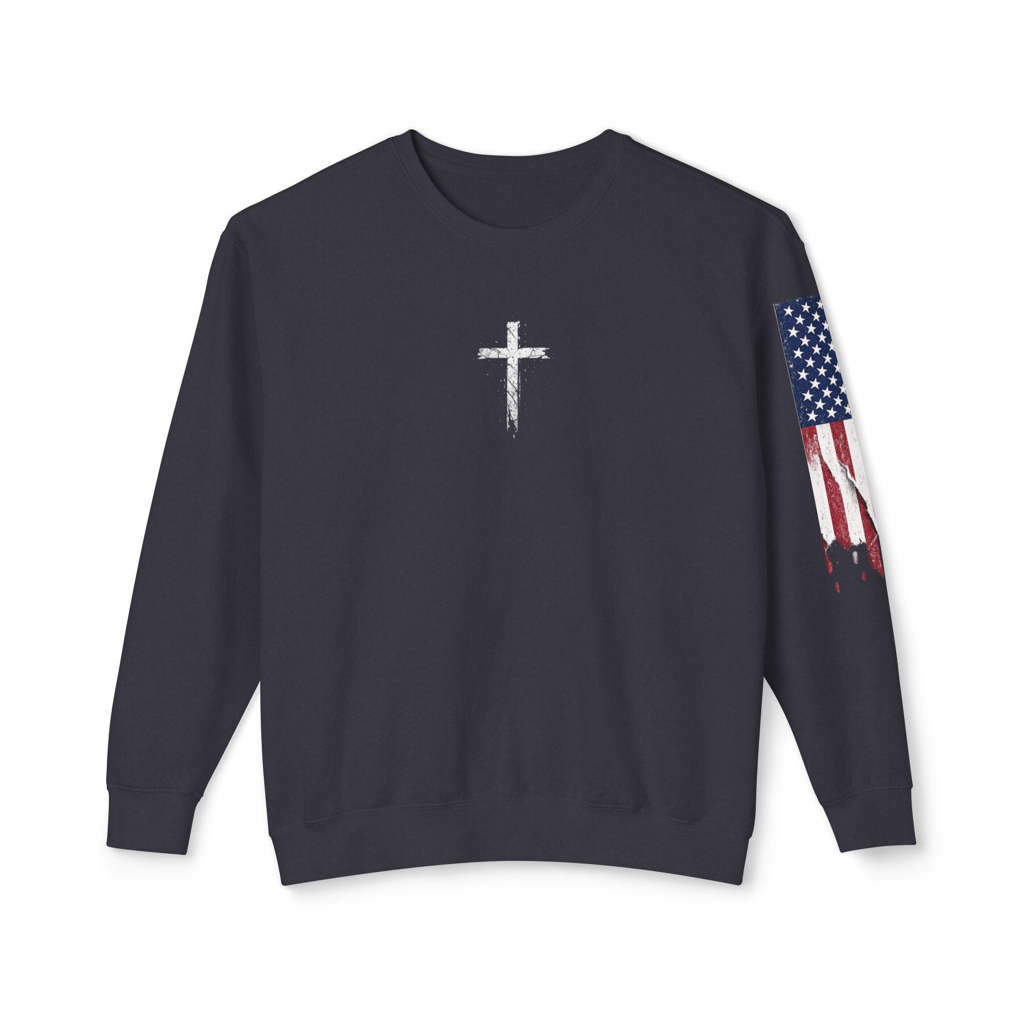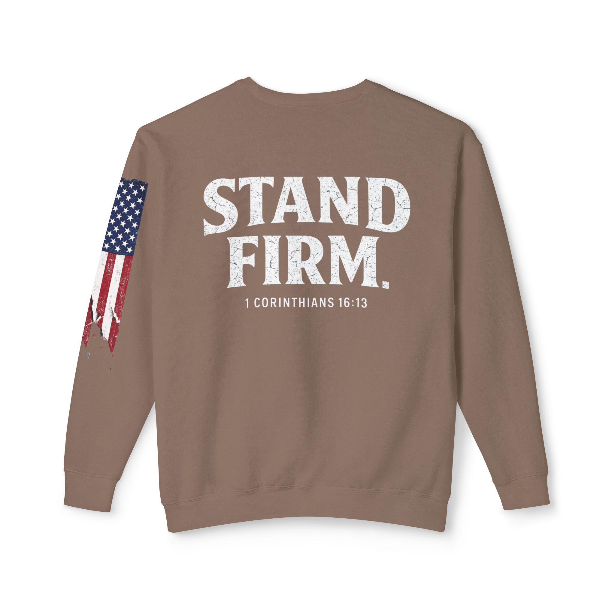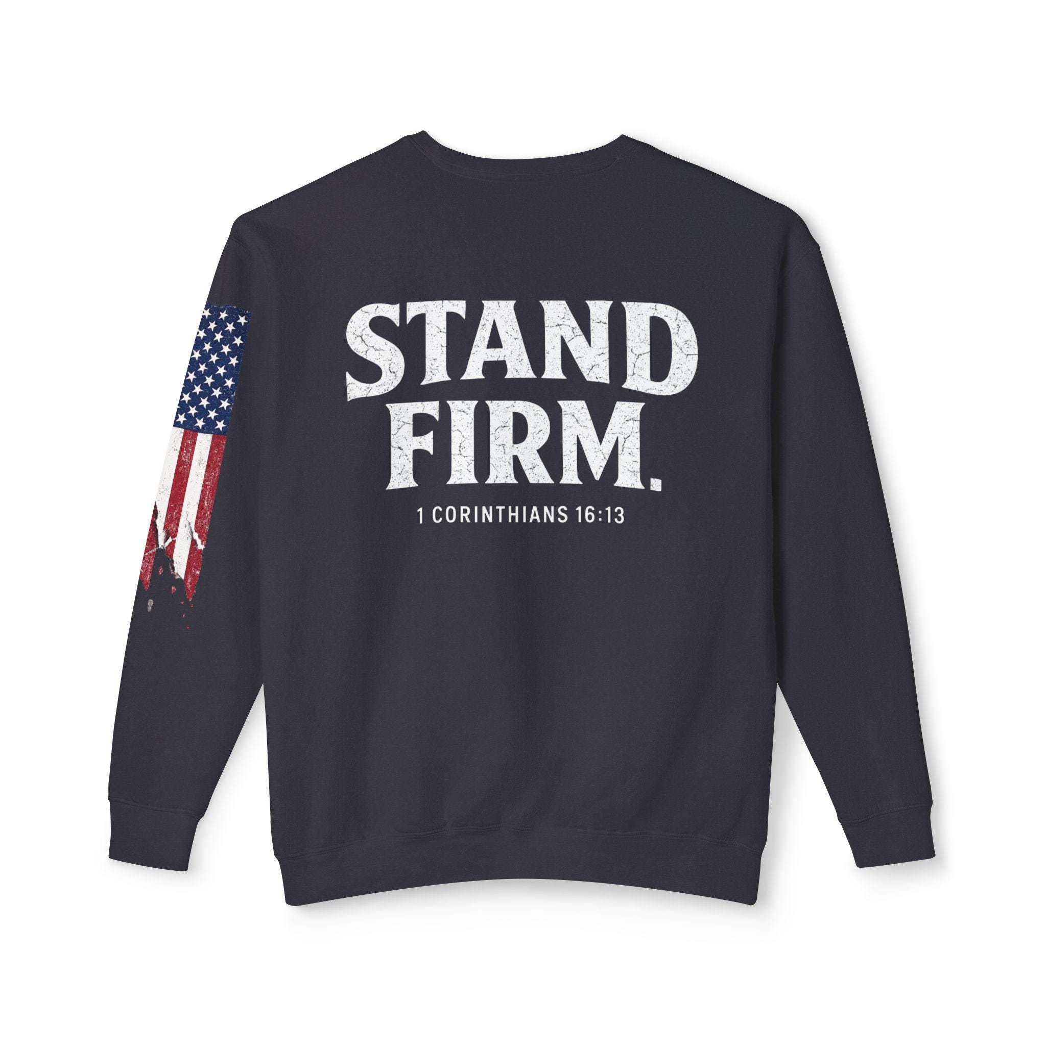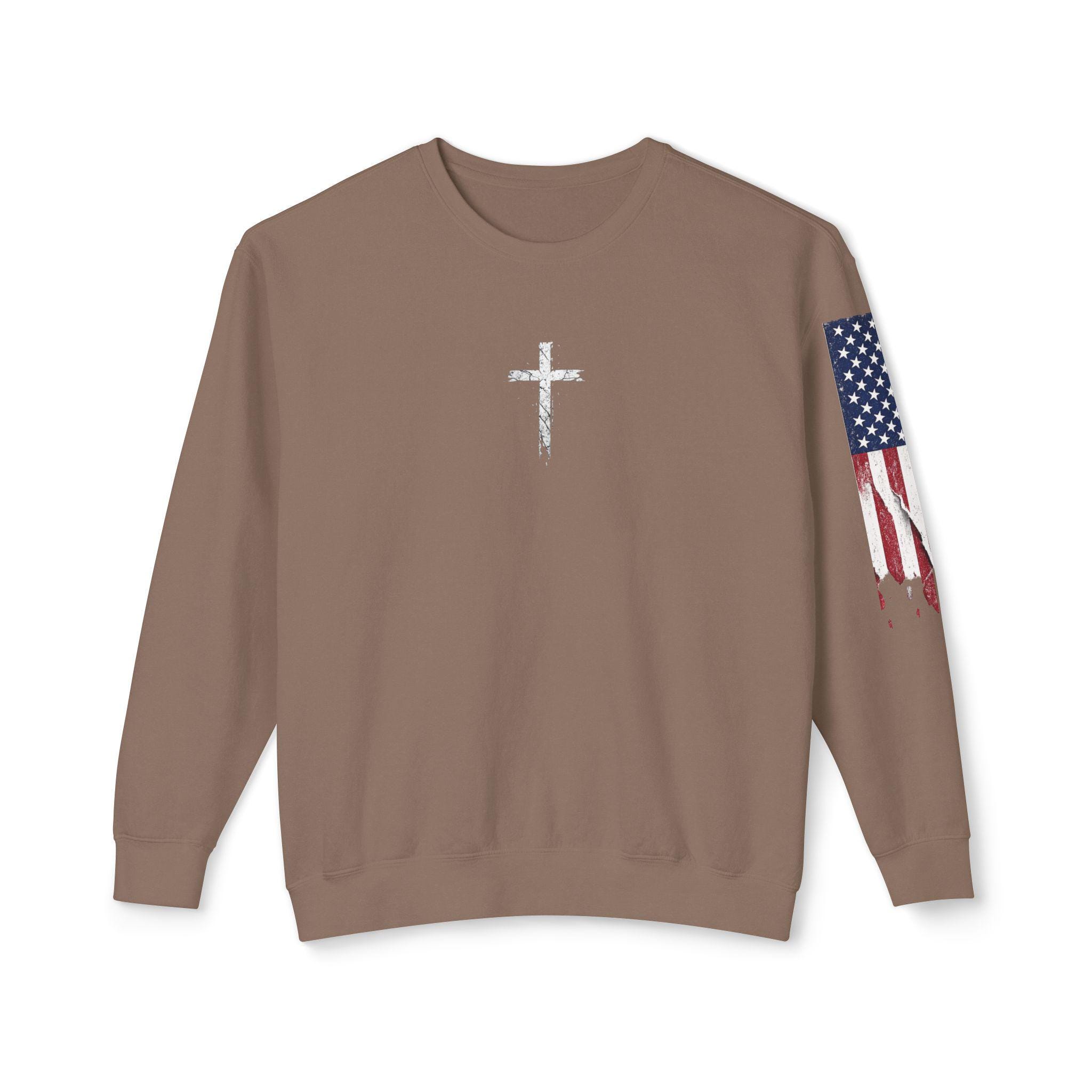 Embrace your faith in style with our light weight Stand Firm cross Comfort Colors sweatshirt! This cozy Christian crewneck features a striking American flag sleeve, making it a perfect blend of comfort and patriotism. Ideal for everyday wear or special gatherings, this sweatshirt serves as a reminder to stand strong in your beliefs. Available in various sizes and colors, it's a must-have addition to your wardrobe. Show your love for faith and country with this unique piece today!