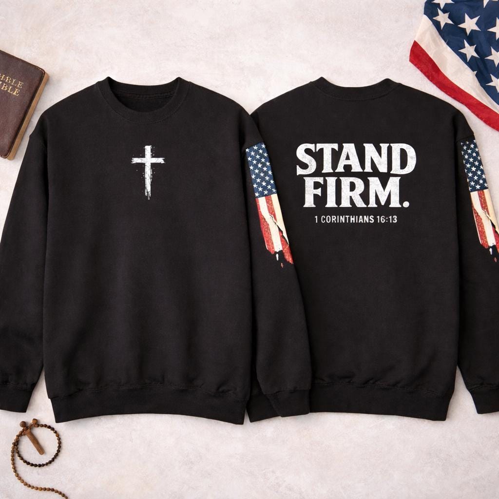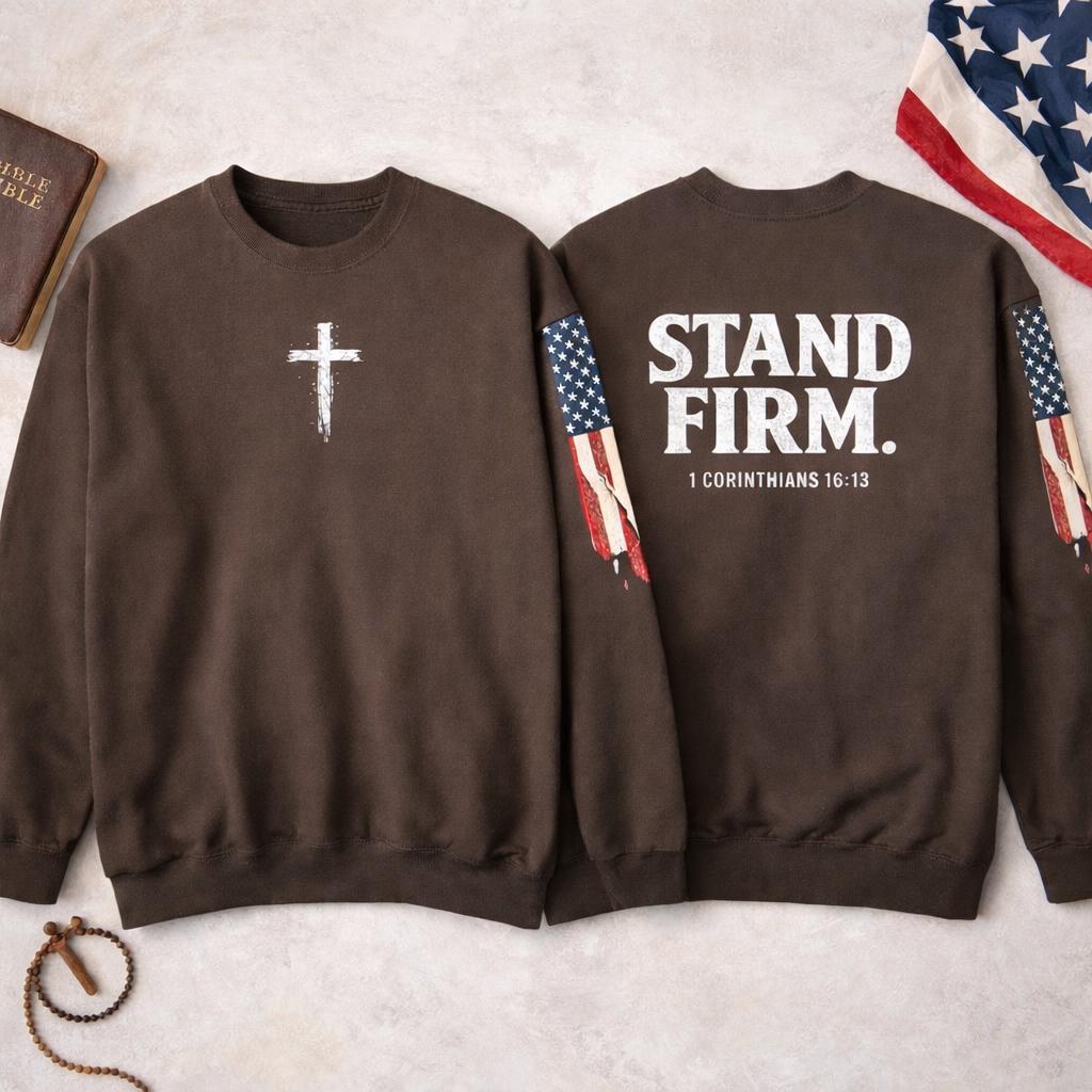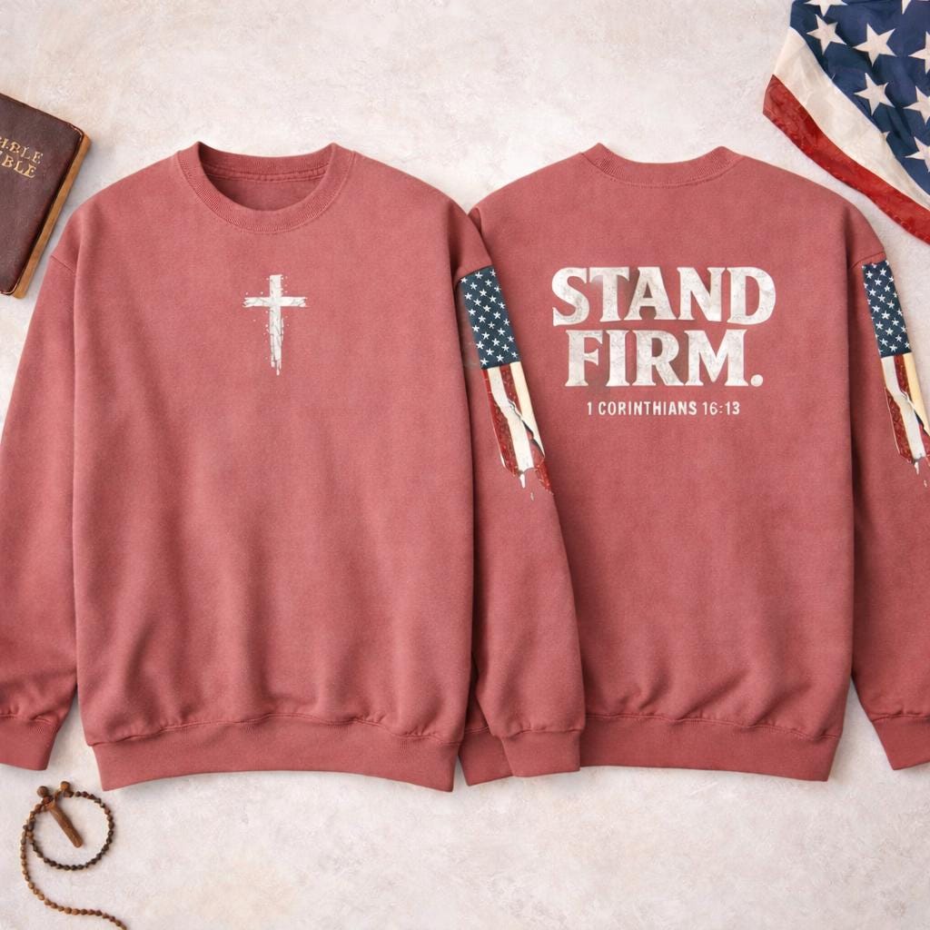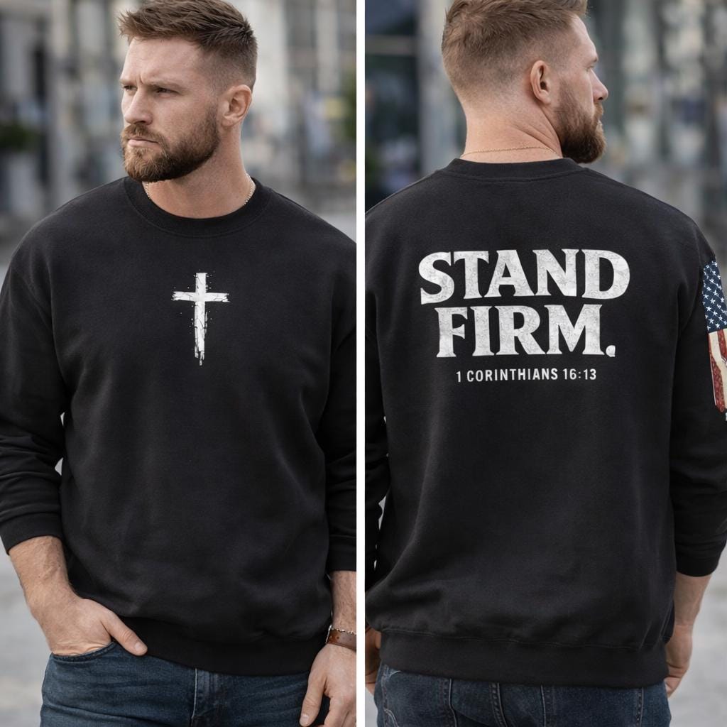Embrace your faith in style with our light weight Stand Firm cross Comfort Colors sweatshirt! This cozy Christian crewneck features a striking American flag sleeve, making it a perfect blend of comfort and patriotism. Ideal for everyday wear or special gatherings, this sweatshirt serves as a reminder to stand strong in your beliefs. Available in various sizes and colors, it's a must-have addition to your wardrobe. Show your love for faith and country with this unique piece today!