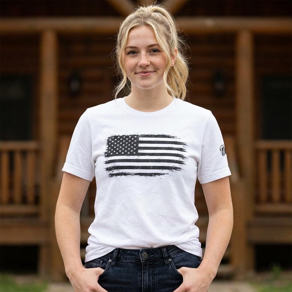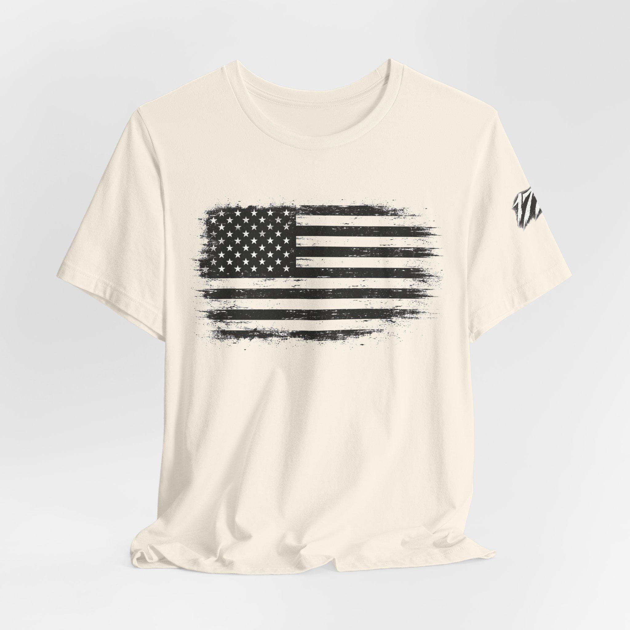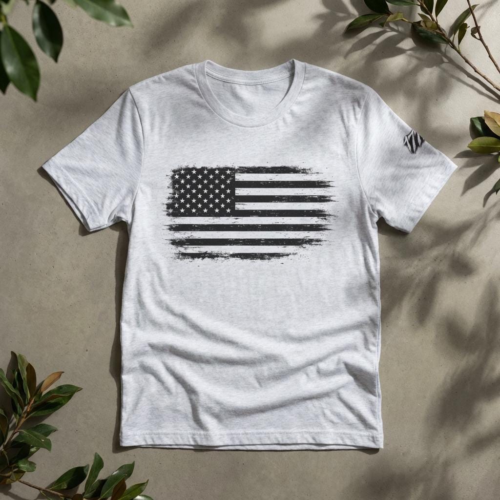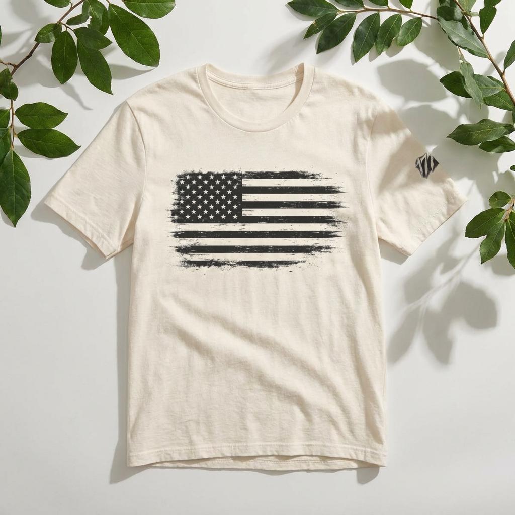 This soft, breathable tee carries a weathered monochrome flag across the chest — understated, rugged, and quietly proud. Lightweight Airlume combed cotton drapes easily for layering or solo wear. The retail fit and crew neckline keep the silhouette neat while the ribbed collar and shoulder tape preserve shape wash after wash. Small sleeve detail adds a subtle signature without overpowering the main design. Wear it on long drives, backyard cookouts, or when you want a low-key statement that reads seasoned and sincere.