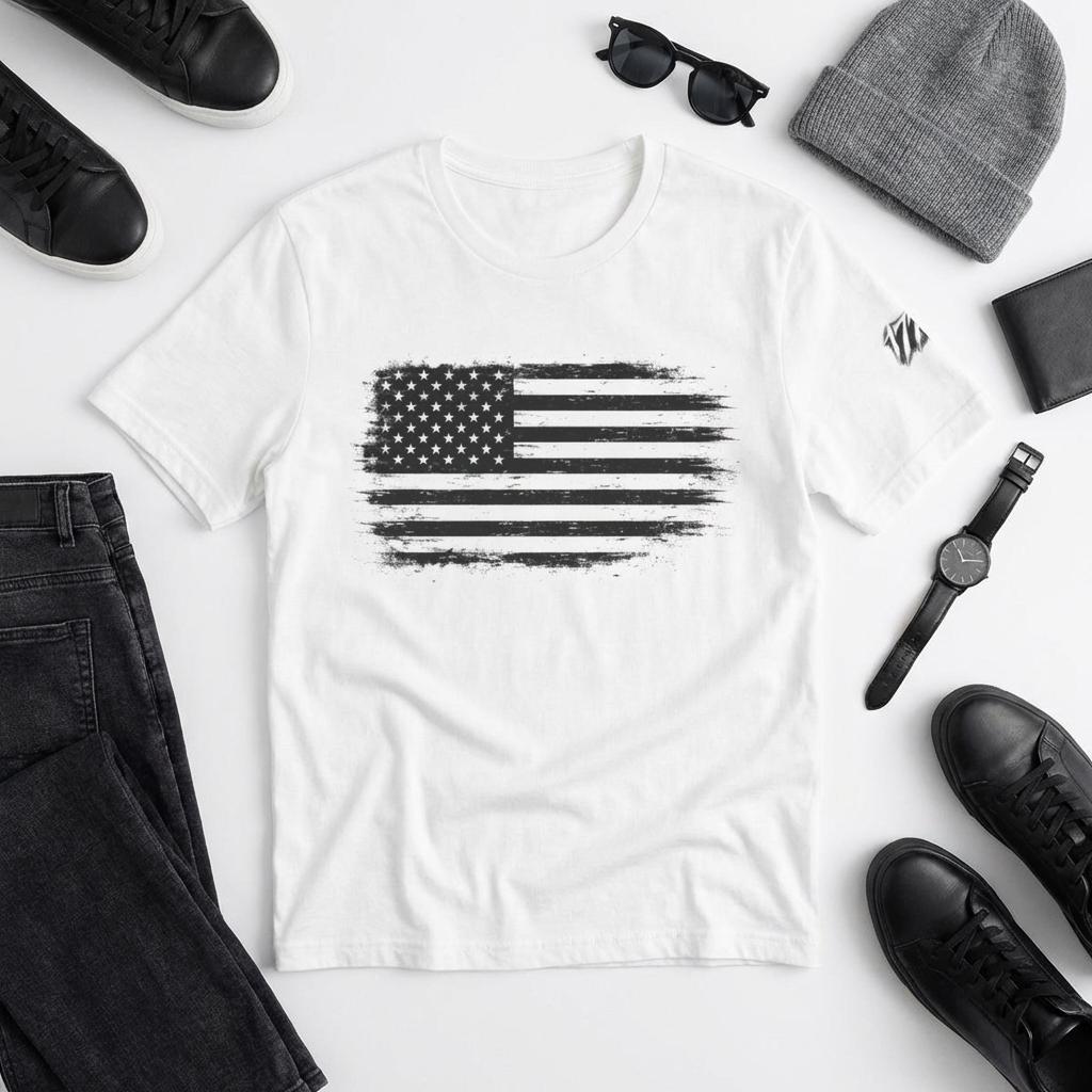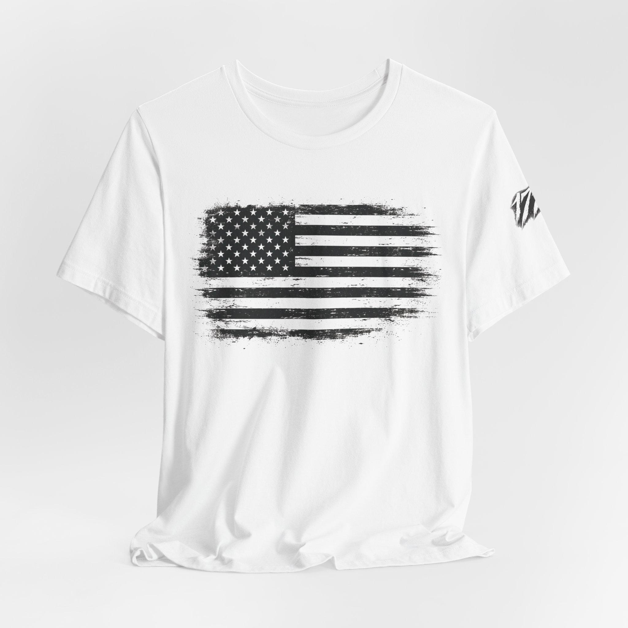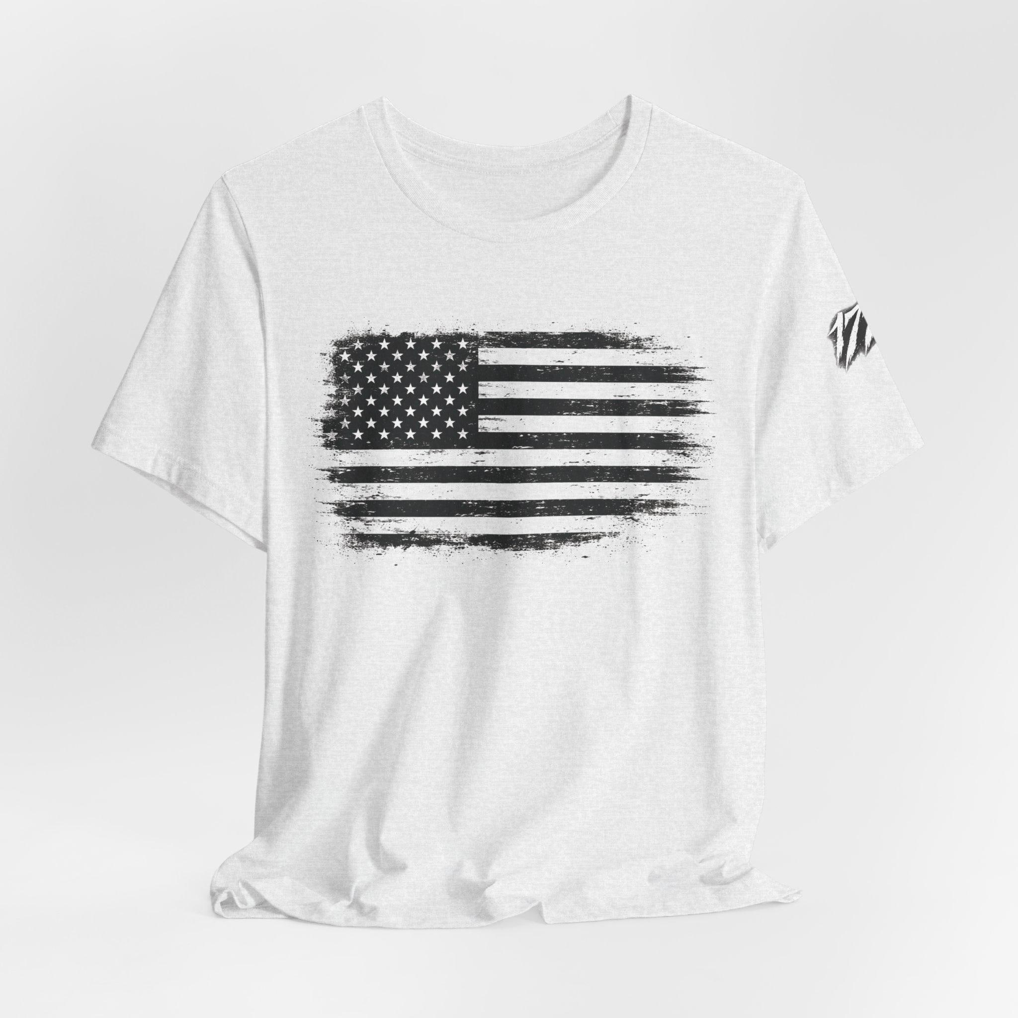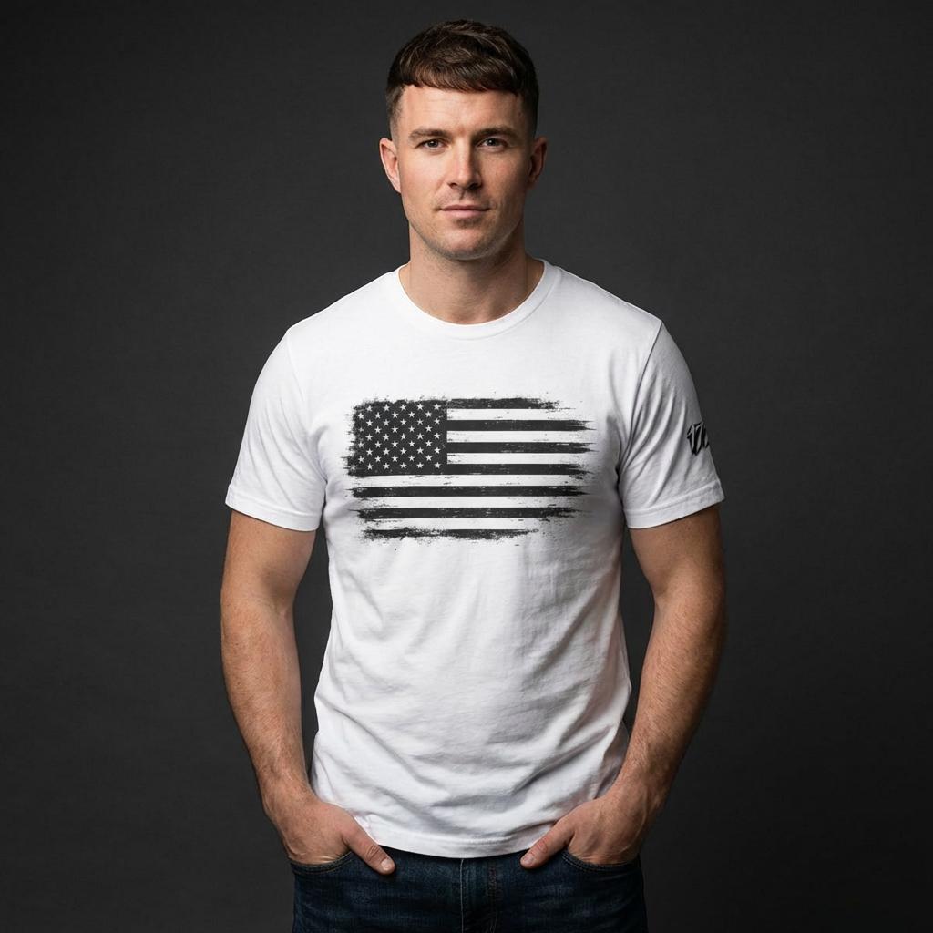 This soft, breathable tee carries a weathered monochrome flag across the chest — understated, rugged, and quietly proud. Lightweight Airlume combed cotton drapes easily for layering or solo wear. The retail fit and crew neckline keep the silhouette neat while the ribbed collar and shoulder tape preserve shape wash after wash. Small sleeve detail adds a subtle signature without overpowering the main design. Wear it on long drives, backyard cookouts, or when you want a low-key statement that reads seasoned and sincere.