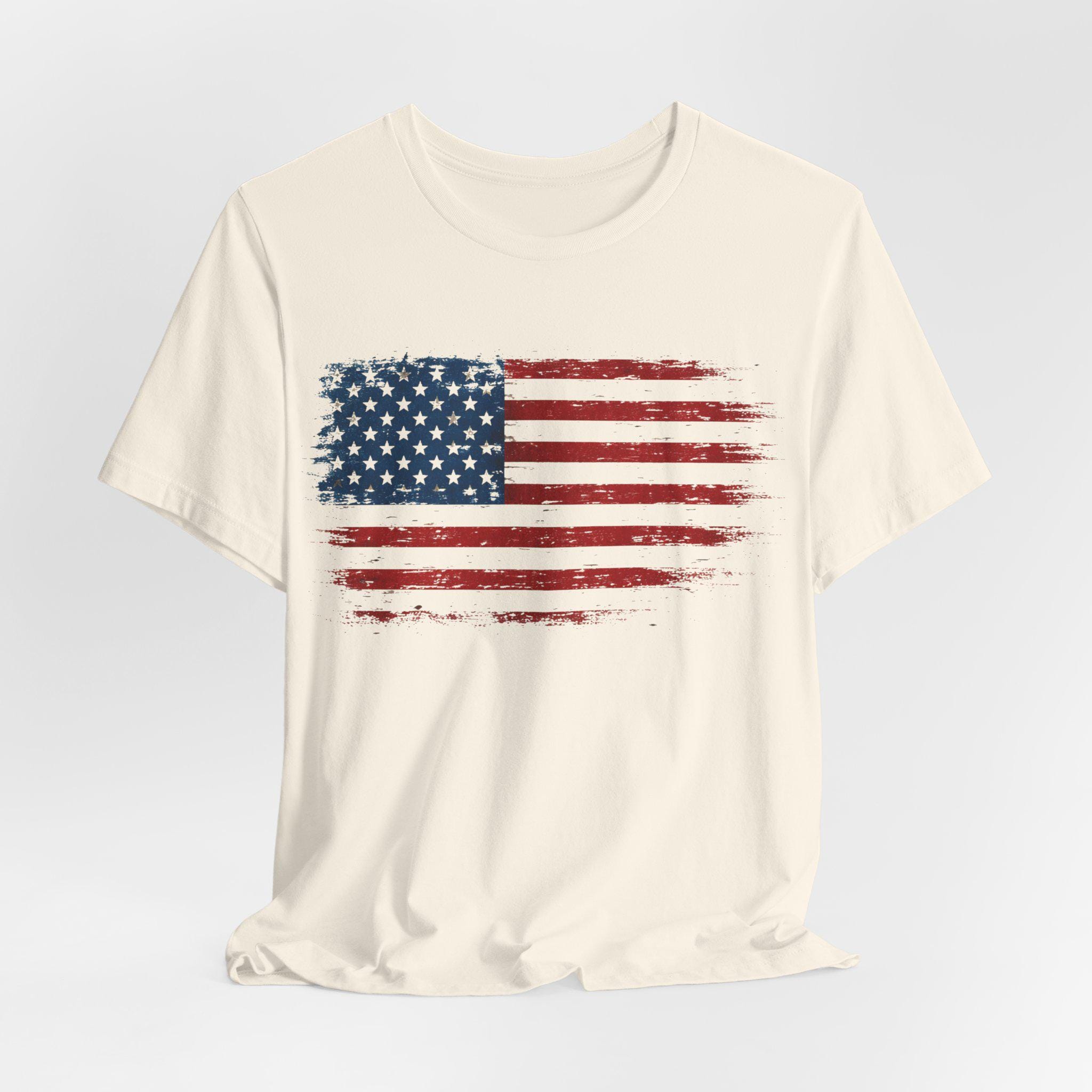 Lightweight, breathable cotton tee that wears like a lived-in favorite. A distressed American flag print sits across the chest in a painterly, weathered style — crisp blues and muted reds that read like sun-faded denim and campfire embers. The retail cut and crew neckline keep the silhouette clean and versatile; side seams and shoulder tape mean it keeps its shape through repeated wear. It’s the kind of shirt you reach for on warm mornings at the lake, backyard barbecues, or low-key parades — comfortable enough for long days, neat enough to pair with a jacket when the evening cools. Ethically-made and soft against the skin, this tee carries a subtle, nostalgic patriotism without shouting.