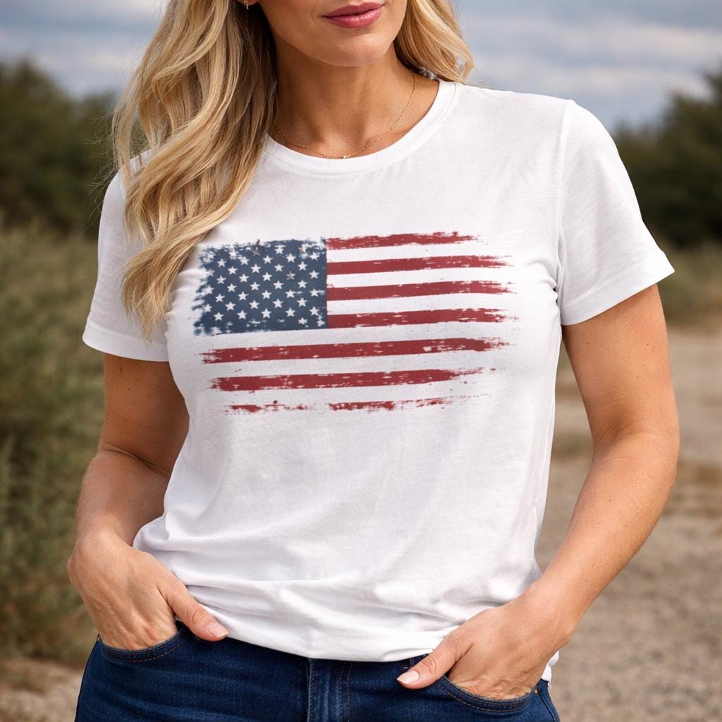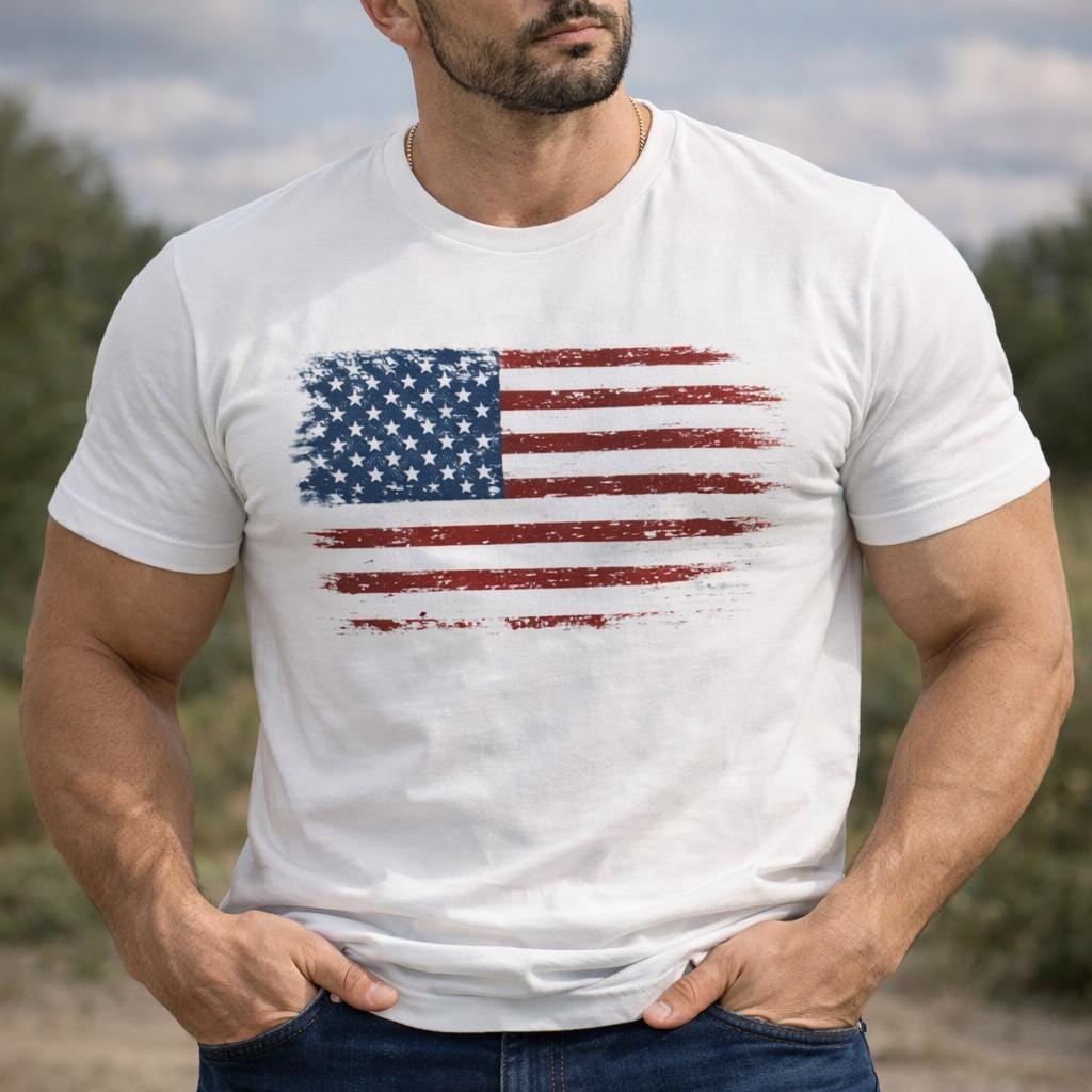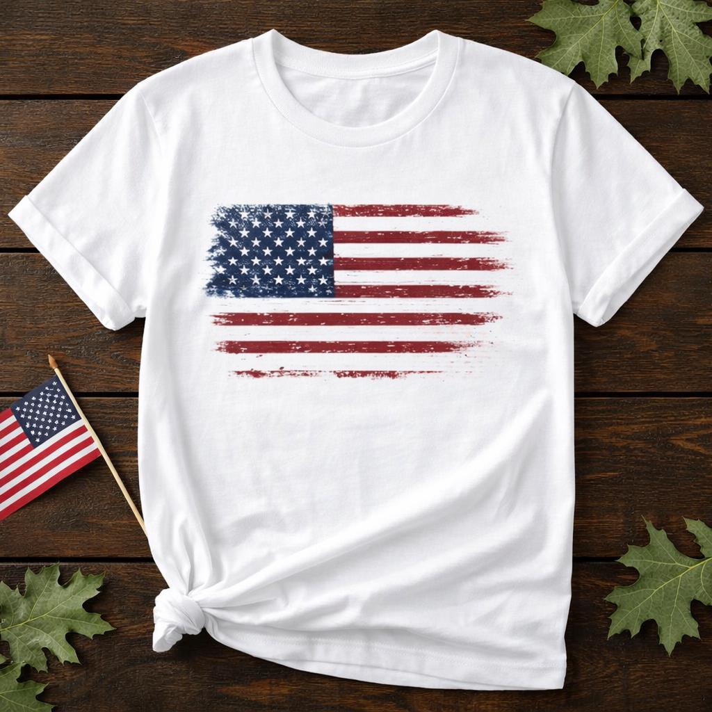- Distressed American flag chest print using crisp DTF/DTG techniques for detailed, vibrant results