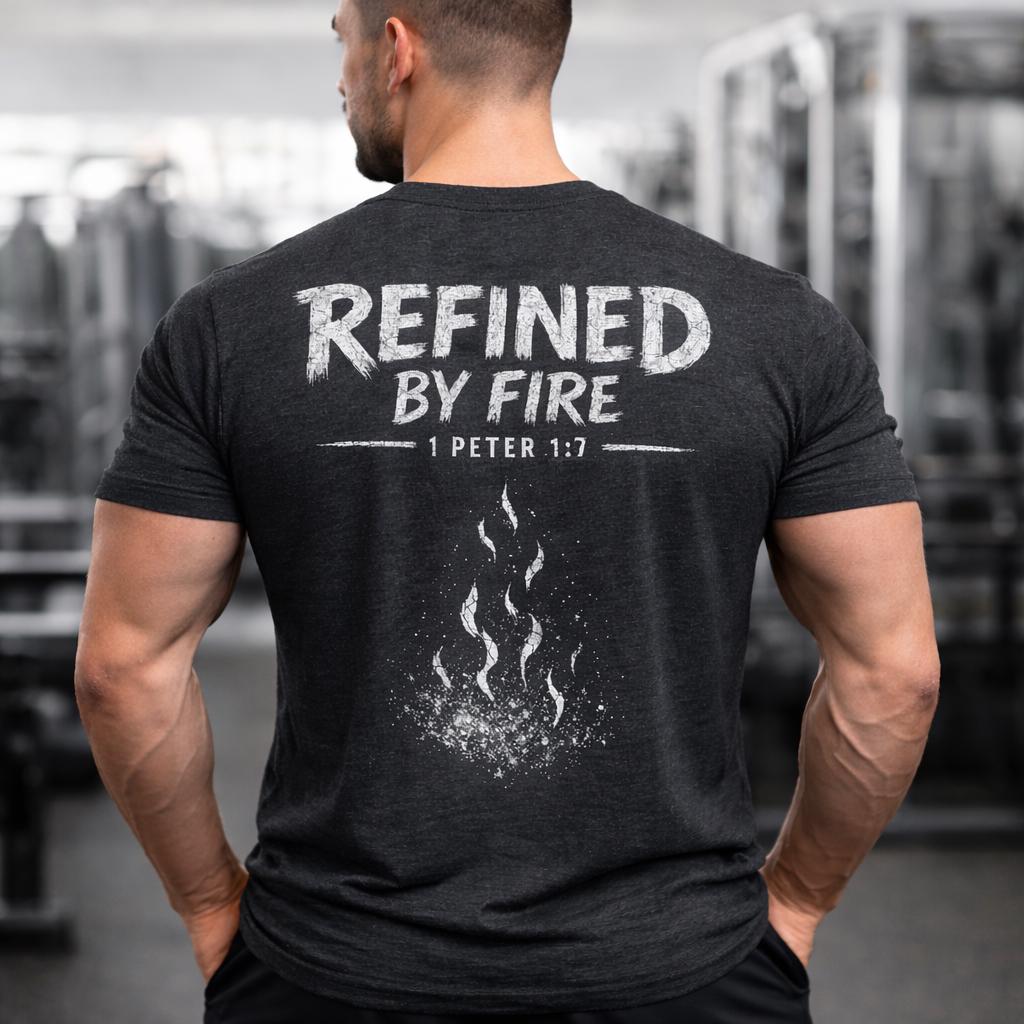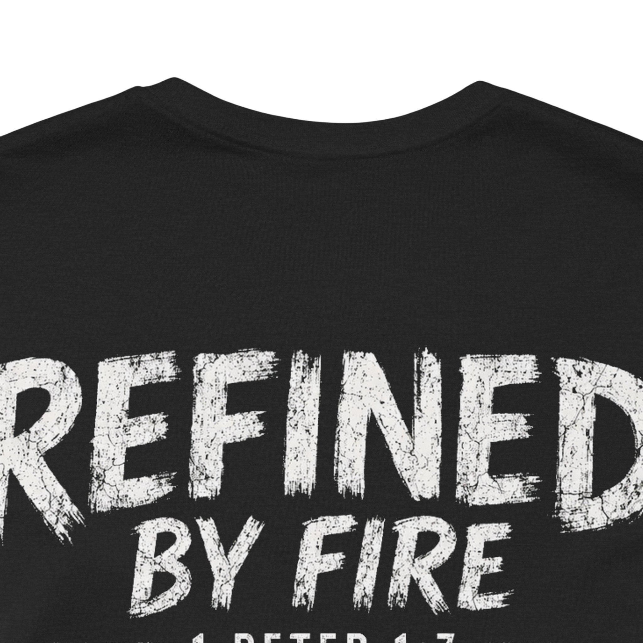 The eye-catching design showcases the powerful message "Refined By Fire" with a subtle flame graphic, symbolizing purification and strength through faith. Perfect for expressing your spiritual journey or as a thoughtful gift for loved ones, this religious tee is a meaningful addition to your faith apparel collection.