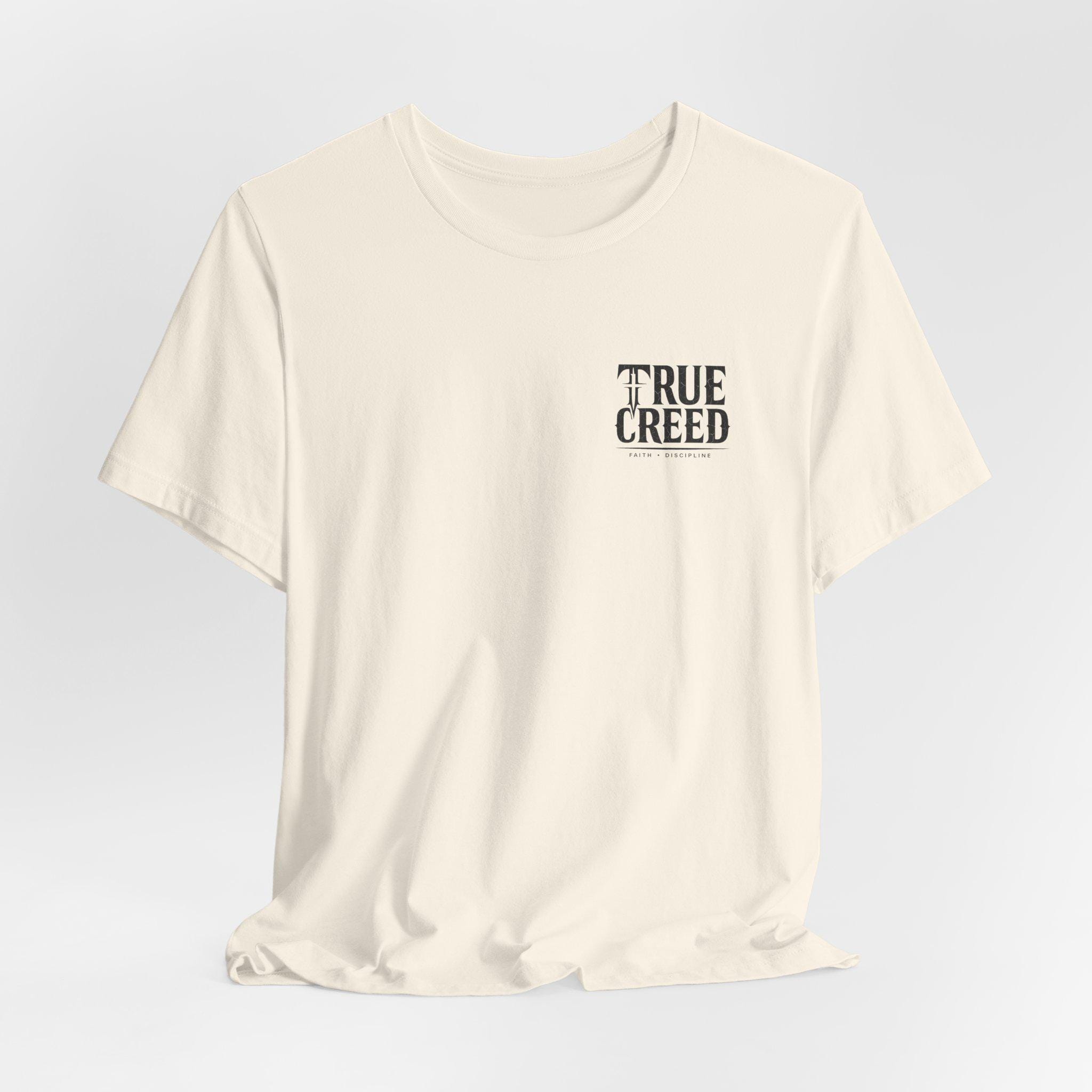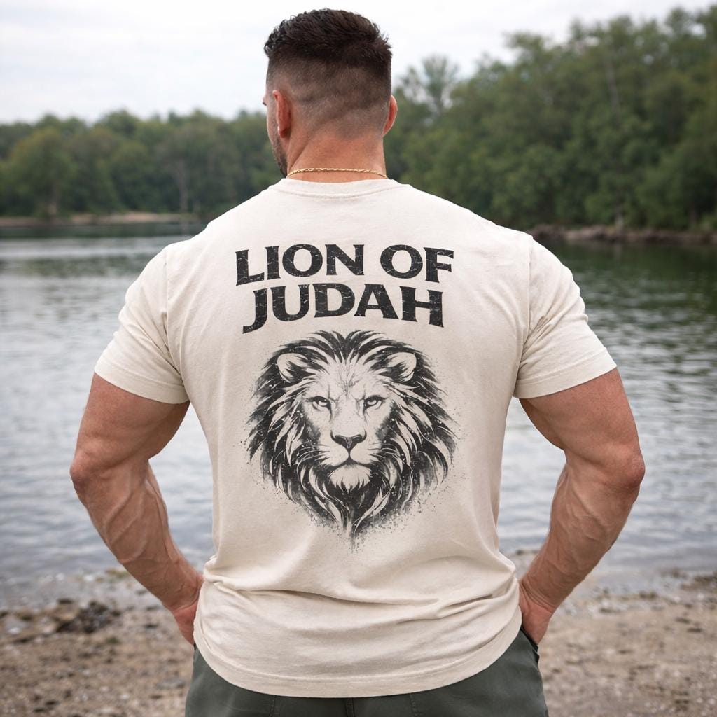 A soft, breathable 100% Airlume combed and ring-spun cotton tee that carries a quiet, faithful message. The front chest shows a small, vintage-inspired “TRUE CREED” mark, while the back presents a detailed charcoal lion illustration with “LION OF JUDAH” and the scripture reference Revelation 5:5. The retail crew cut and side seams keep the shape neat, and the ribbed collar with shoulder tape gives everyday structure. Lightweight and easy to layer, this shirt feels lived-in from the first wear and holds up through regular use. Ethically made blanks and a tear-away label make it comfortable for extended wear, and compliance certifications mean you can wear it with confidence.