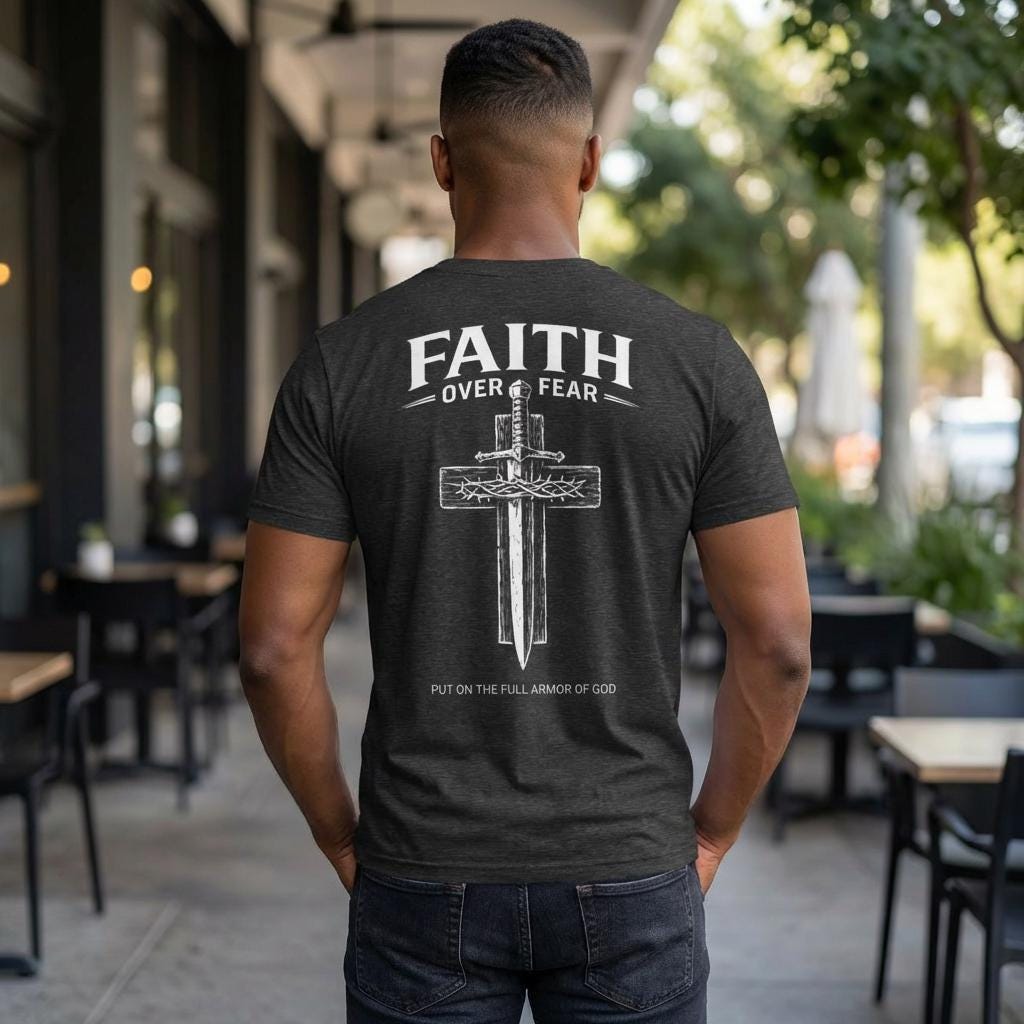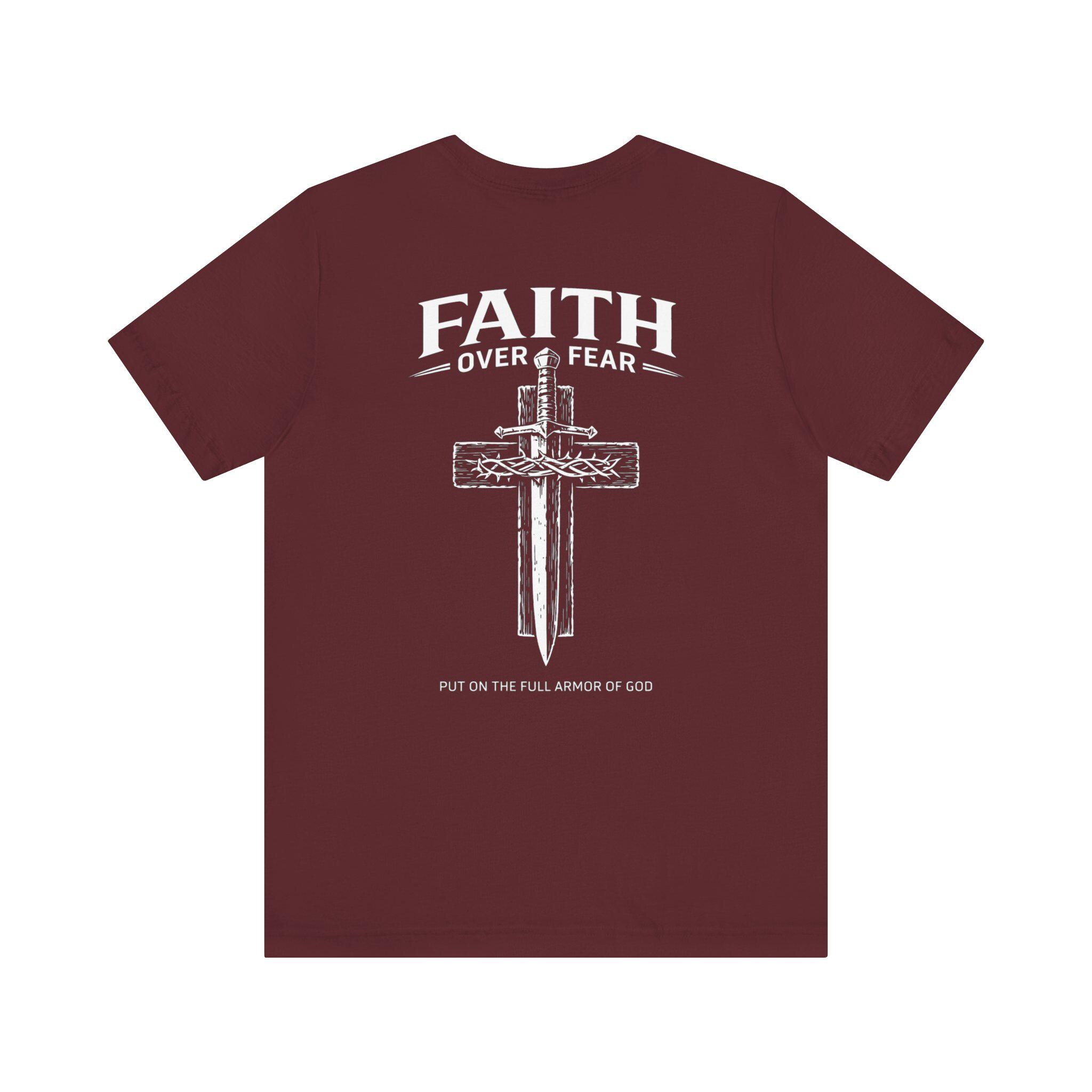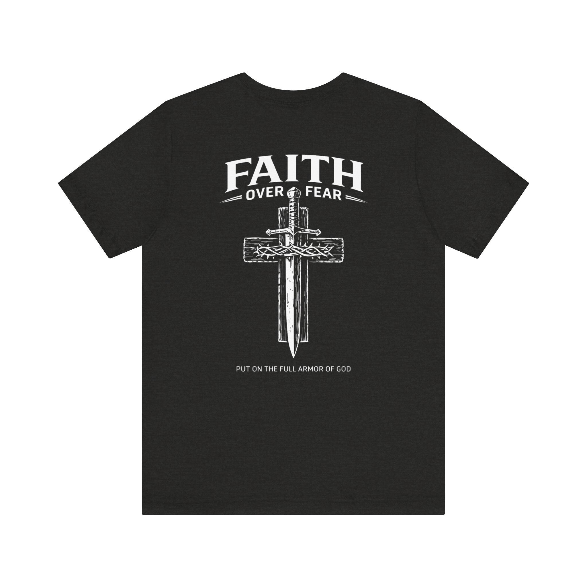 Embrace your beliefs with our Faith Over Fear Cross Dagger Tee! This masculine Christian T-shirt is perfect for those who stand strong in their faith. Made from high-quality materials, it offers comfort and style while sharing a powerful message. Whether you're at church, running errands, or hanging out with friends, this tee is a great way to express your values. Available in various sizes, it's the ideal addition to any faith-inspired wardrobe. Wear your faith proudly!