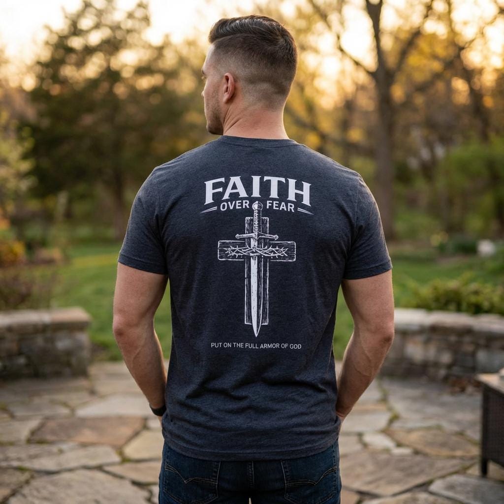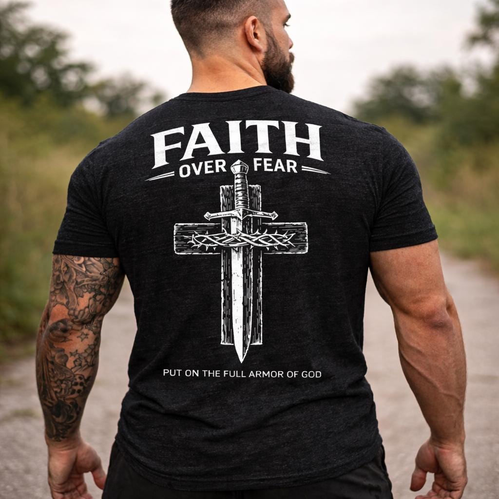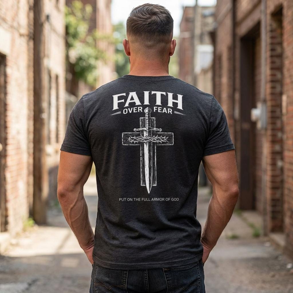 Embrace your beliefs with our Faith Over Fear Cross Dagger Tee! This masculine Christian T-shirt is perfect for those who stand strong in their faith. Made from high-quality materials, it offers comfort and style while sharing a powerful message. Whether you're at church, running errands, or hanging out with friends, this tee is a great way to express your values. Available in various sizes, it's the ideal addition to any faith-inspired wardrobe. Wear your faith proudly!