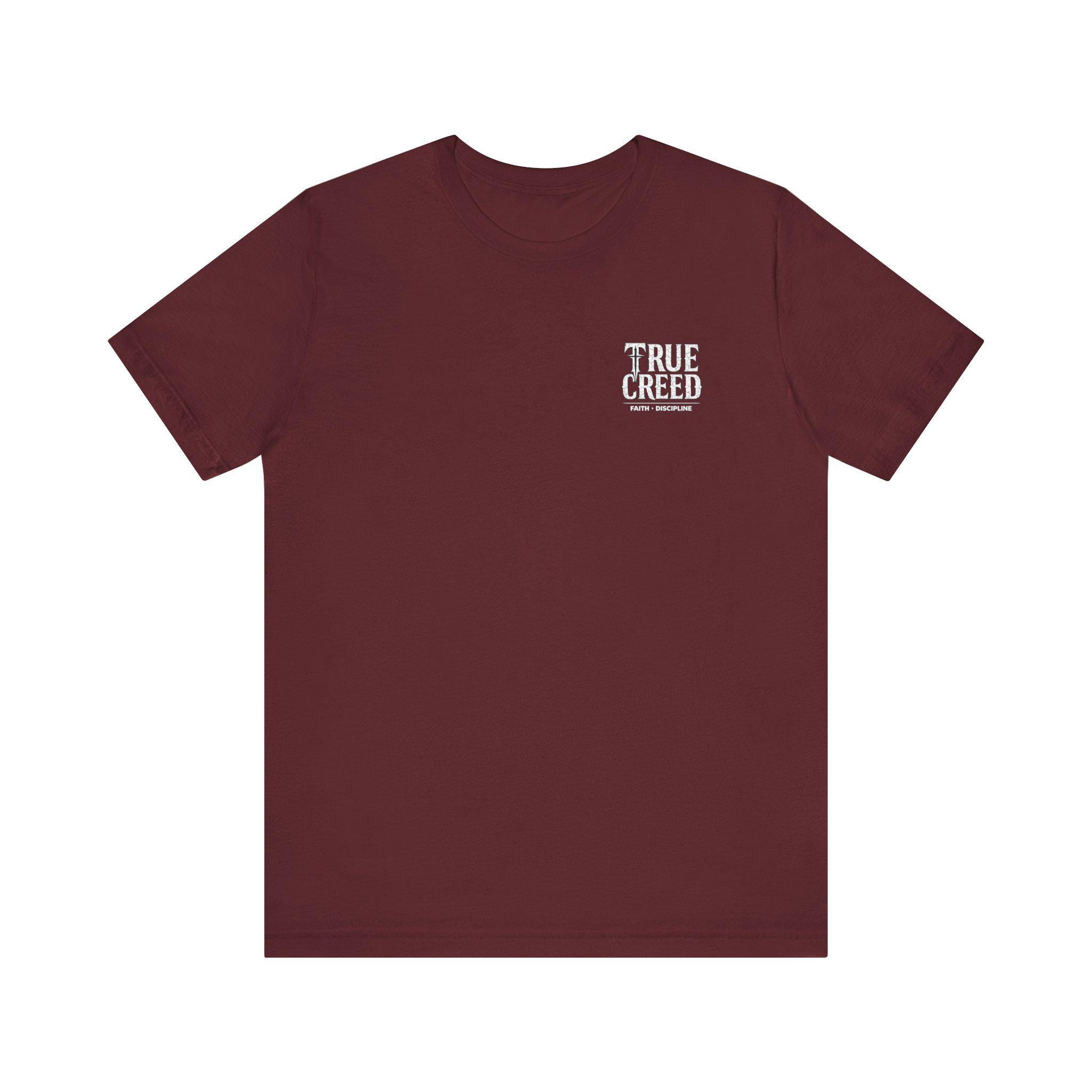 This lightweight crew-neck tee feels like a quiet declaration you can wear. Soft Airlume cotton drapes without cling, while the ribbed collar and side seams keep the silhouette neat after many washes. A small, confident chest print reads “TRUE CREED” while the back shows a bold, monochrome graphic: a sword and cross with the words “FAITH OVER FEAR” and the reminder to put on the full armor of God. It settles easily into everyday life — layered under a jacket, worn to a weekend gathering, or chosen for a morning of service — and carries a calm, steady message rather than shouting for attention. Sustainably made and REACH certified, the shirt is finished with a tear-away label for comfort and shoulder tape for durability, so the statement stays comfortable and true for years to come.