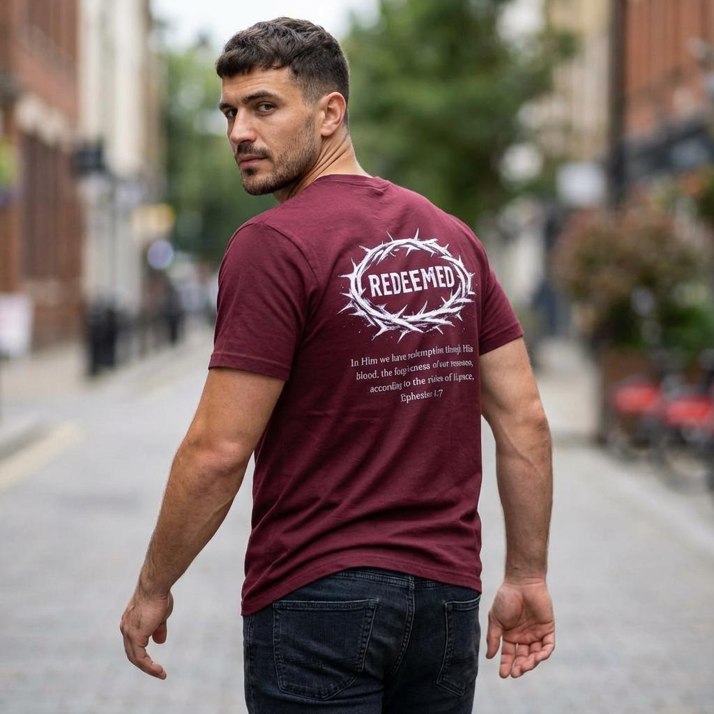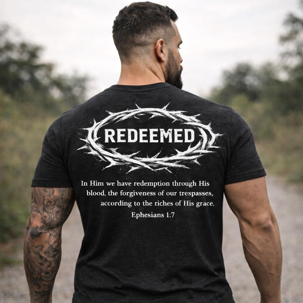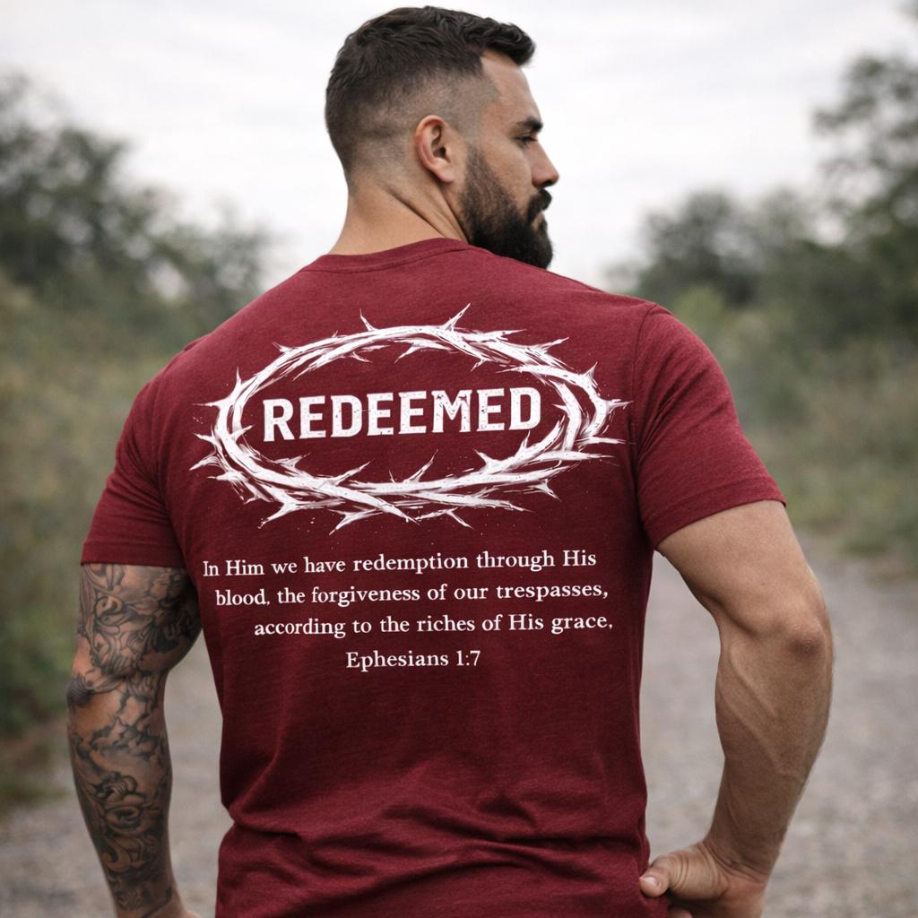 This lightweight cotton tee carries a quiet, steadfast message — wear it and move through your day anchored in a story of redemption. The front keeps the statement subtle with a small chest mark, while the back opens into a bold, devotional design: a crown of thorns encircling the word “REDEEMED,” with a short scripture excerpt beneath. Soft, breathable Airlume combed cotton feels lived-in from the first wear. The retail cut and crew neckline keep the silhouette clean and easy to layer under jackets or over a long-sleeve on cooler evenings. Thoughtful details like side seams, a ribbed knit collar, shoulder twill tape and a tear-away label add comfort and lasting shape. Ethically produced and REACH certified, this shirt fits into everyday life for someone who wants clothing that speaks to faith without shouting it.
