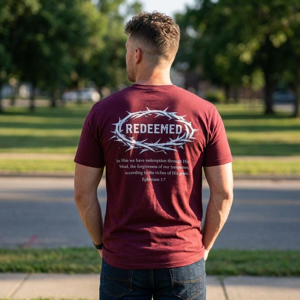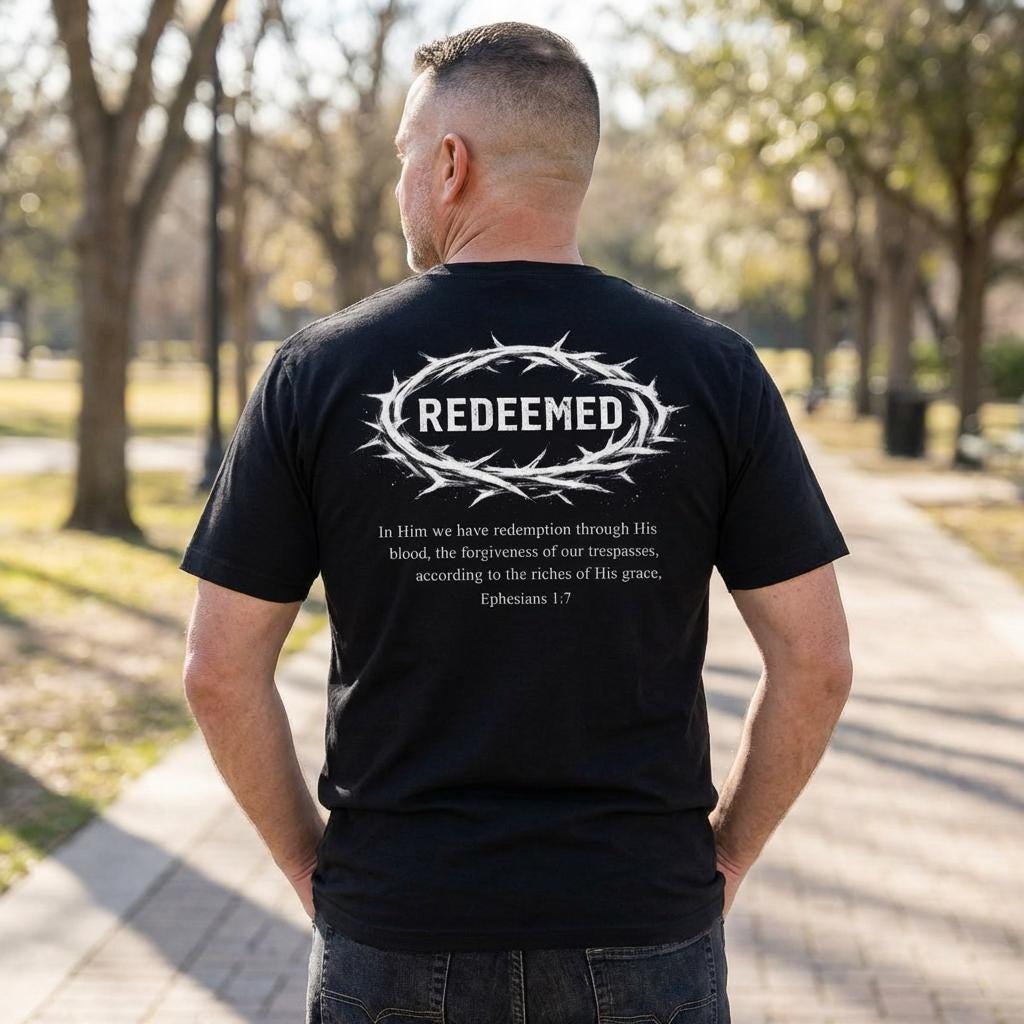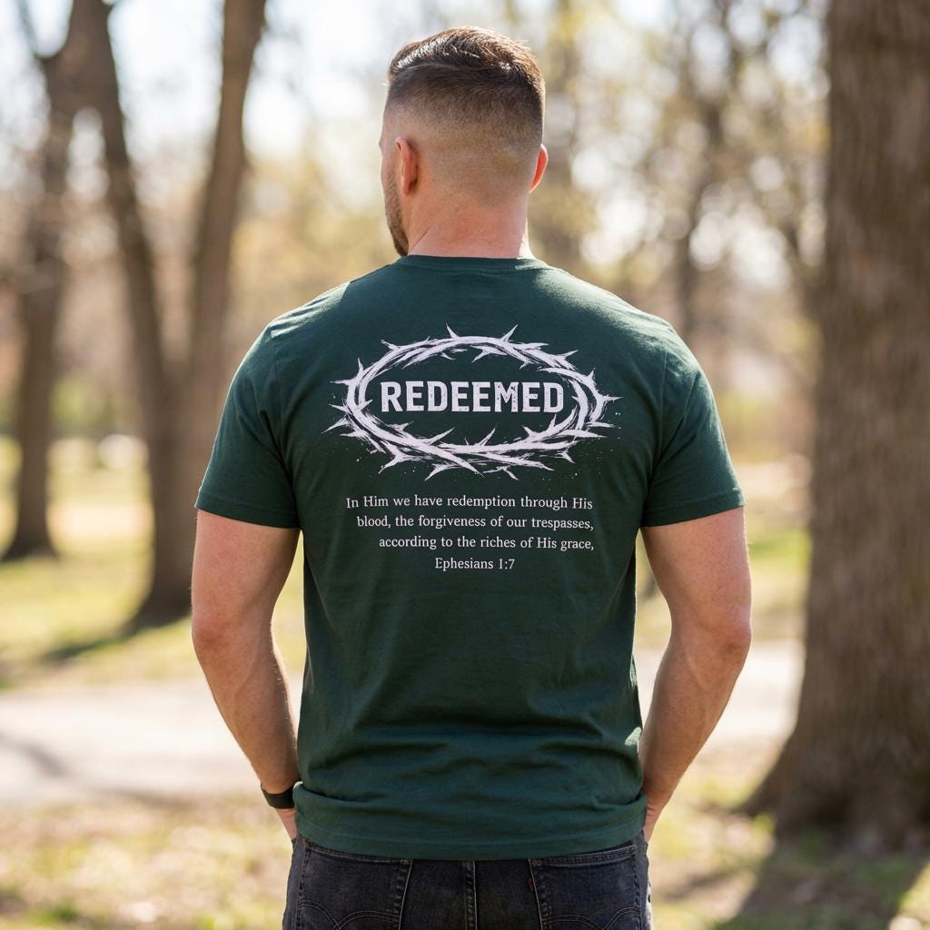 This lightweight cotton tee carries a quiet, steadfast message — wear it and move through your day anchored in a story of redemption. The front keeps the statement subtle with a small chest mark, while the back opens into a bold, devotional design: a crown of thorns encircling the word “REDEEMED,” with a short scripture excerpt beneath. Soft, breathable Airlume combed cotton feels lived-in from the first wear. The retail cut and crew neckline keep the silhouette clean and easy to layer under jackets or over a long-sleeve on cooler evenings. Thoughtful details like side seams, a ribbed knit collar, shoulder twill tape and a tear-away label add comfort and lasting shape. Ethically produced and REACH certified, this shirt fits into everyday life for someone who wants clothing that speaks to faith without shouting it.