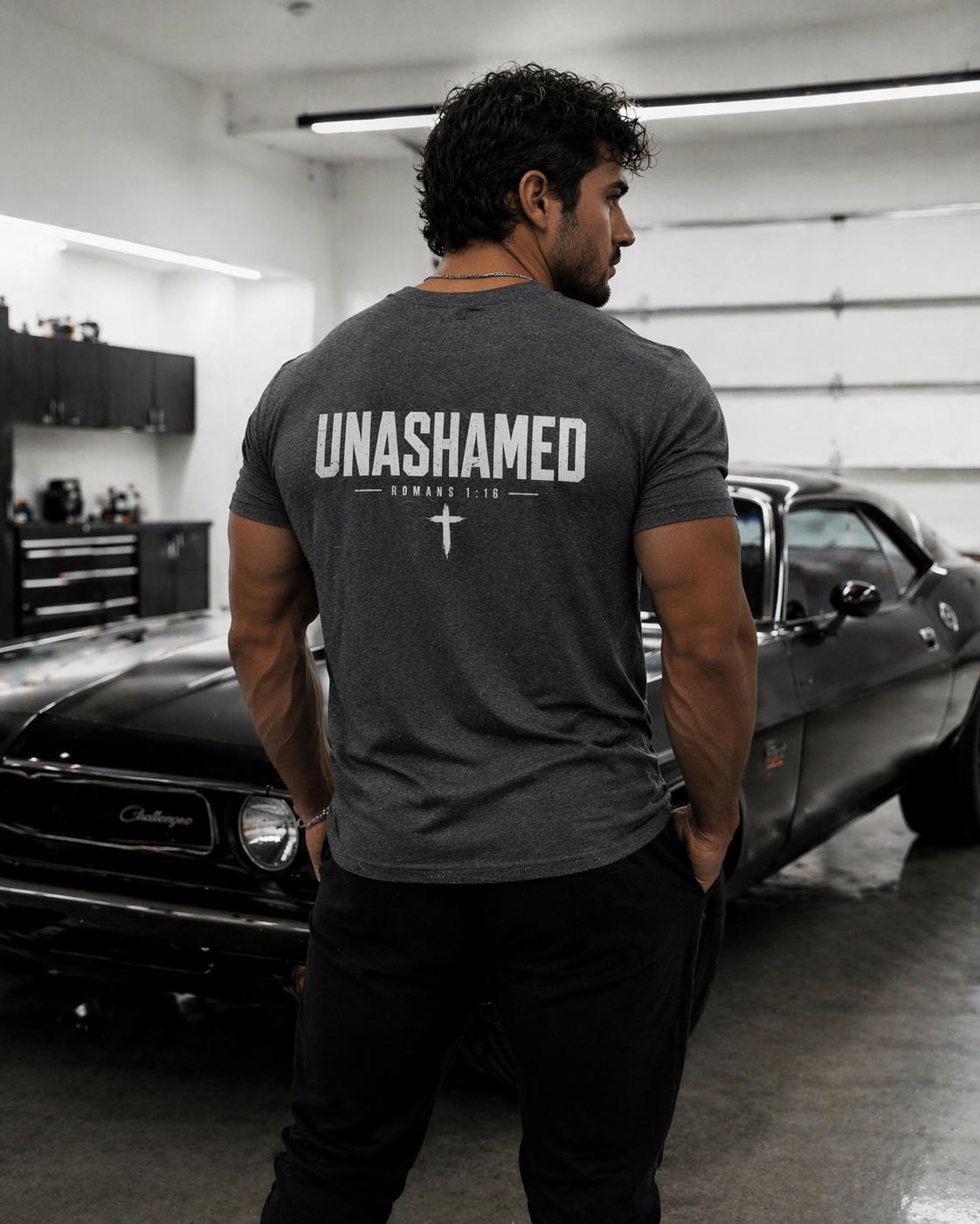 A heavyweight, garment-dyed tee that wears in like a favorite testimony. The front carries a small, confident chest mark while the back announces UNASHAMED in bold, weathered type with a simple cross beneath — clean, direct, and quietly defiant. The soft, lived-in color and relaxed fit make it a shirt you reach for when you want to show faith without fuss. Wear it to church gatherings, volunteer days, outreach events, or when you want your everyday look to speak with conviction.