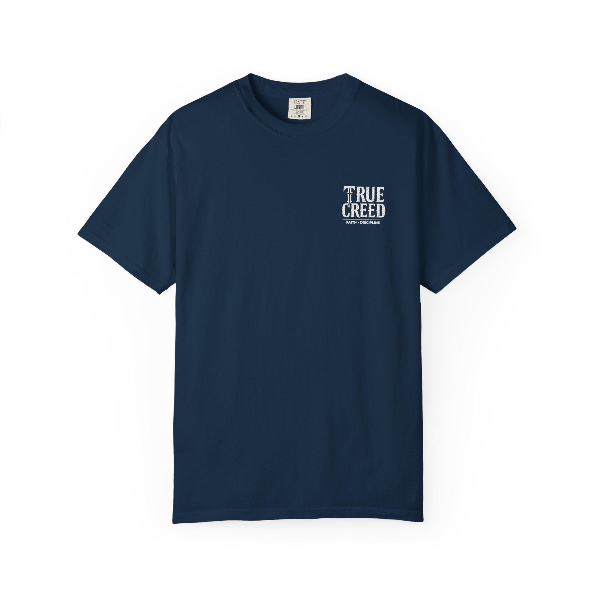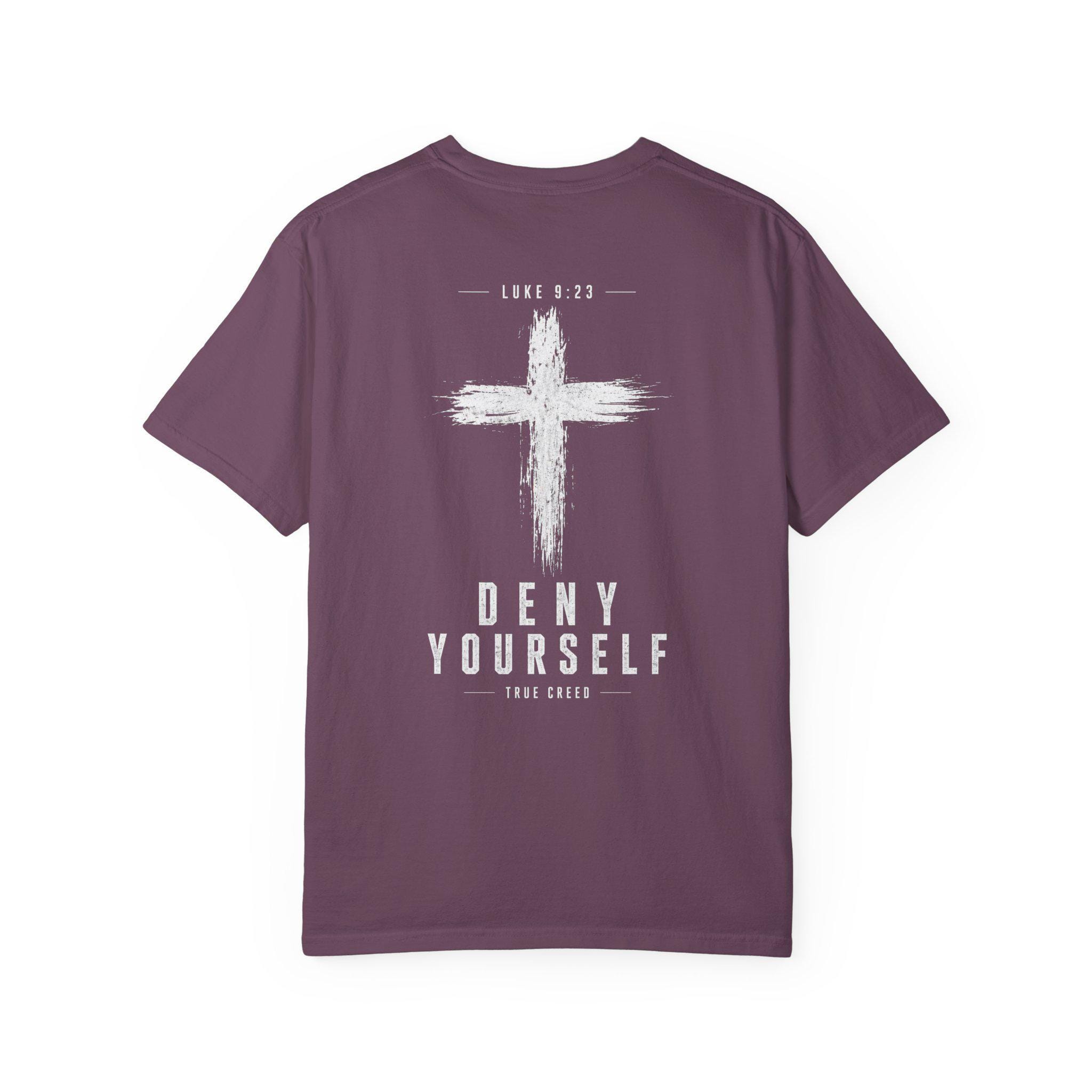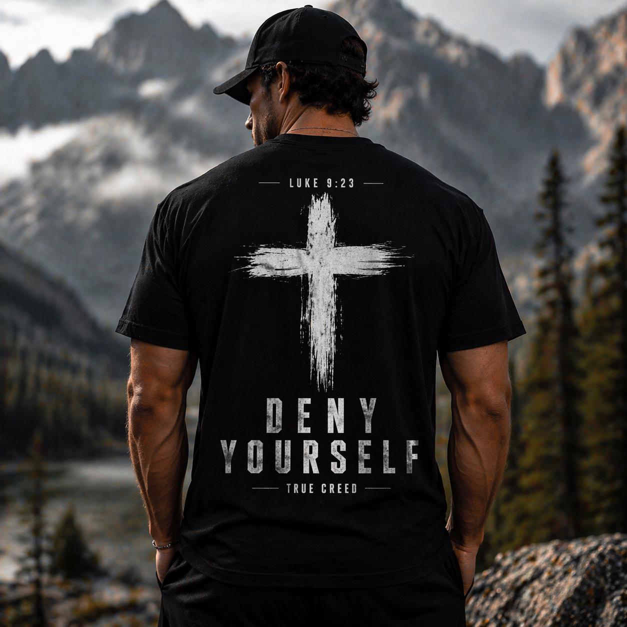 Designed with a relaxed fit and eye-catching graphic of a prominent cross, this shirt features the inspiring words "Deny Yourself" and "True Creed," making it a thoughtful gift for friends and family who want to express their faith confidently. Whether you're dressing up or keeping it casual, this versatile tee is an excellent addition to your spiritual wardrobe.
