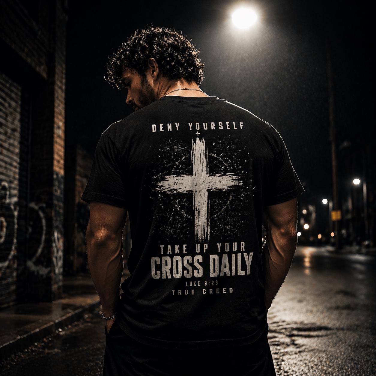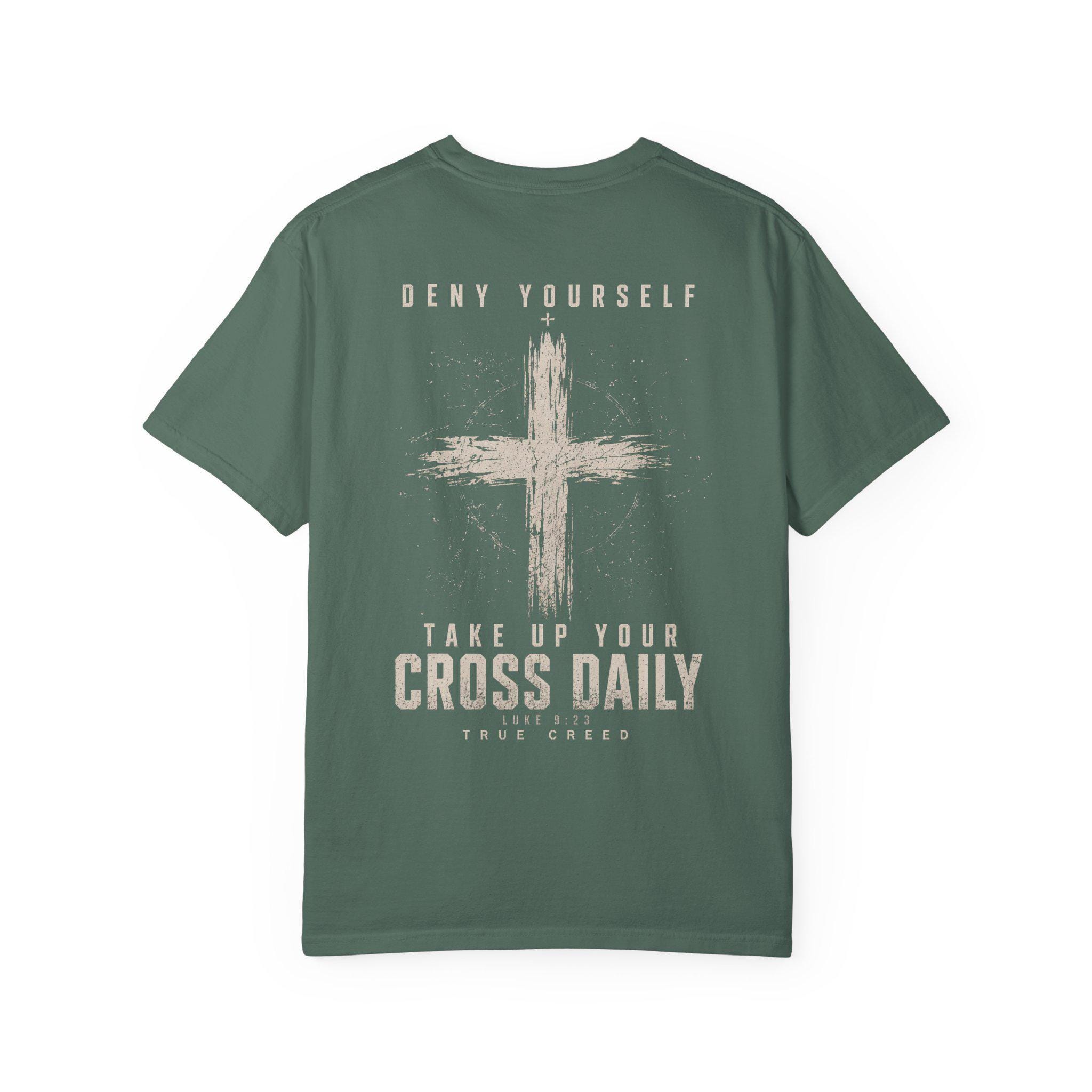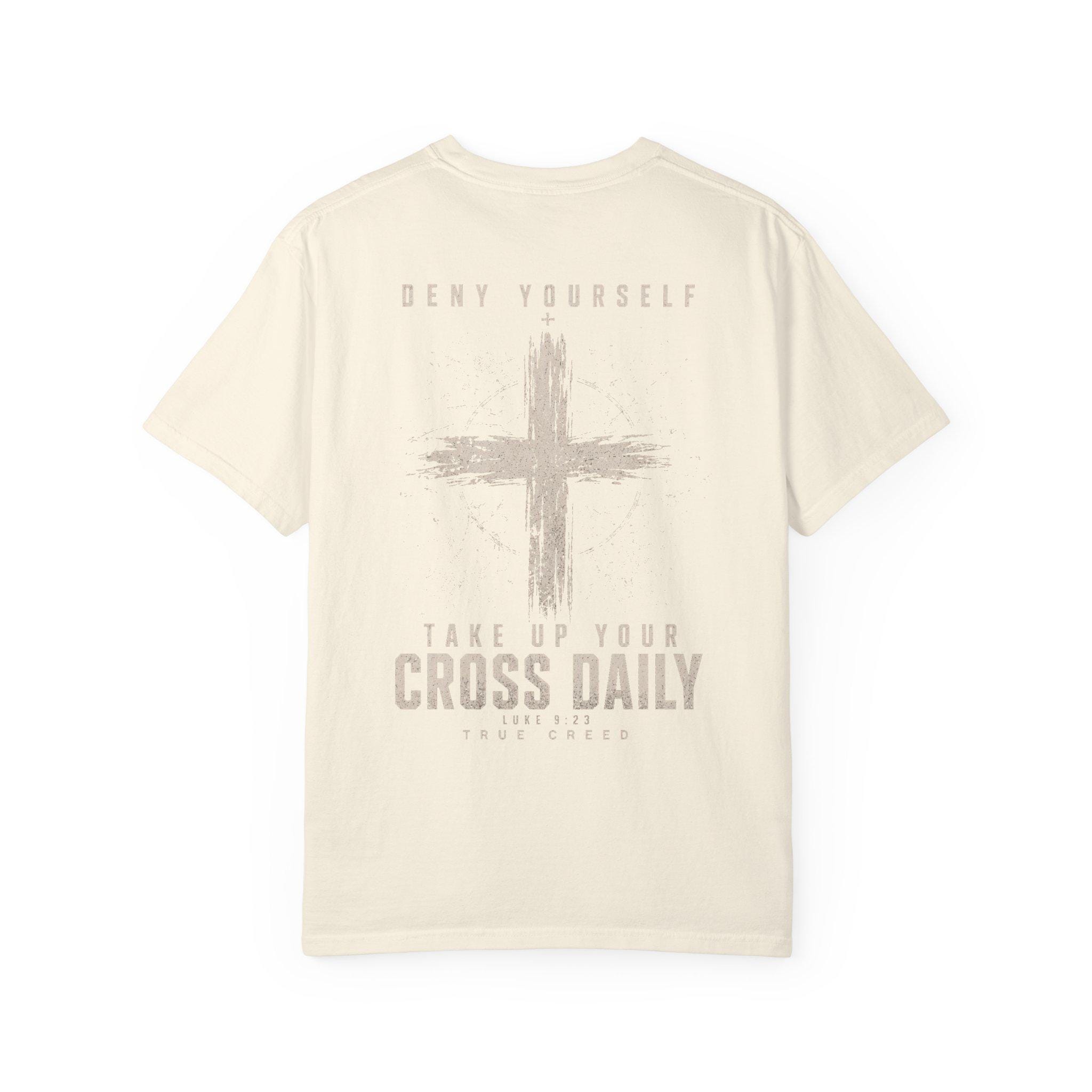 Featuring a subtle yet powerful design, the front of the shirt displays a small chest print that reads “TRUE CREED,” while the back showcases a weathered cross accompanied by the phrase “Deny yourself — take up your cross daily,” inspired by Luke 9 23. The vintage tones and distressed artwork lend a modern, religious art aesthetic that resonates with believers seeking a quiet but impactful statement of faith.