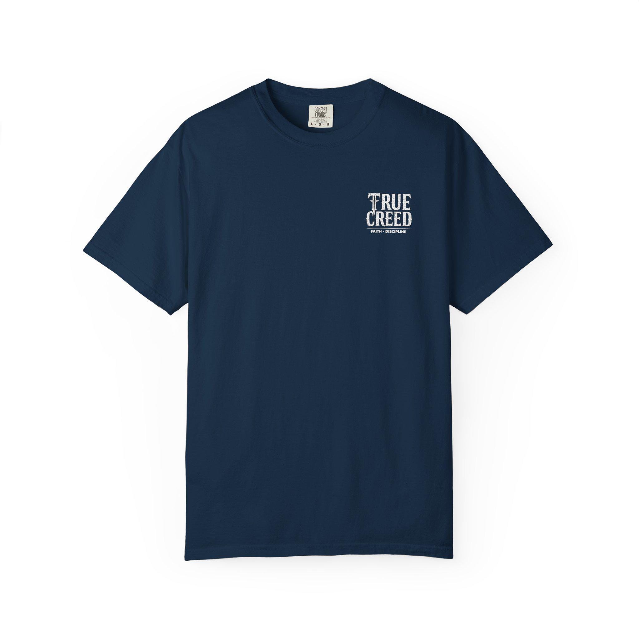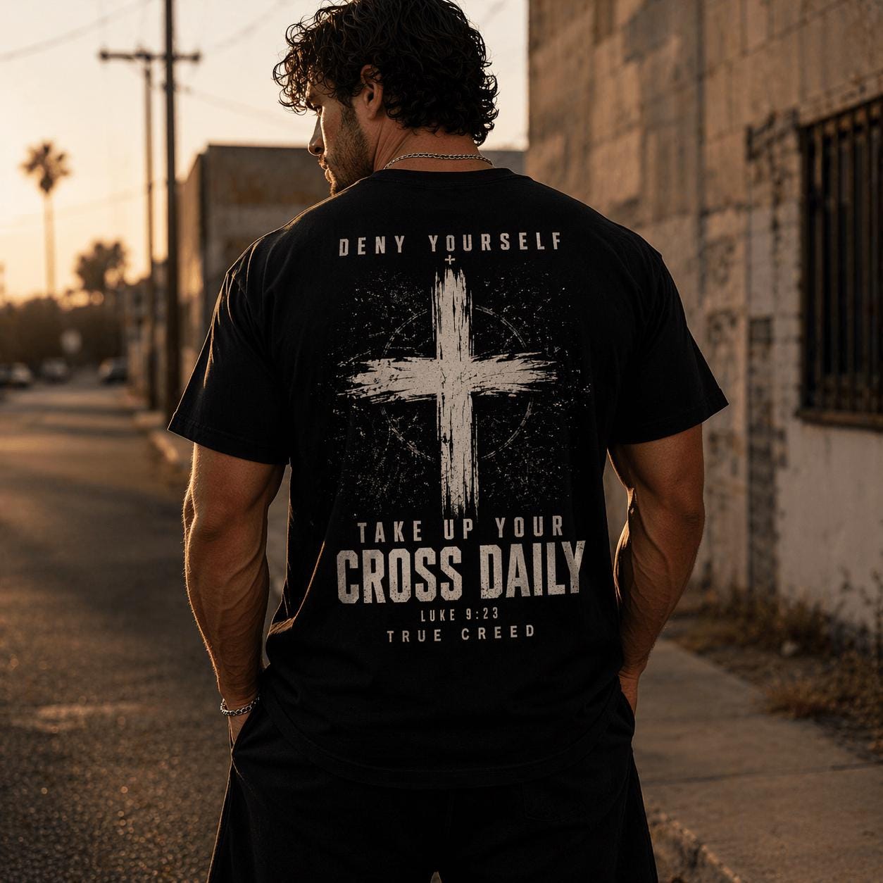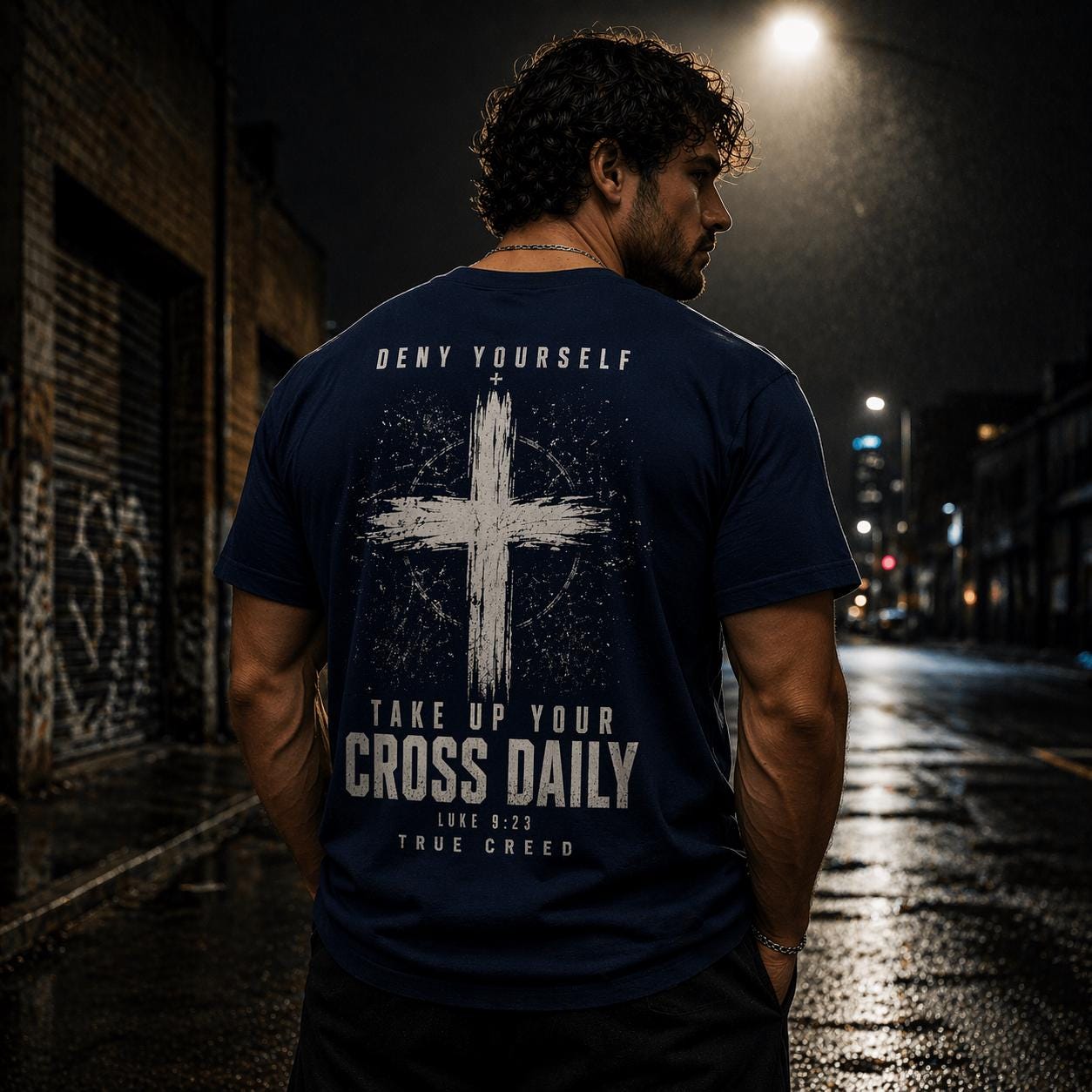 Featuring a subtle yet powerful design, the front of the shirt displays a small chest print that reads “TRUE CREED,” while the back showcases a weathered cross accompanied by the phrase “Deny yourself — take up your cross daily,” inspired by Luke 9 23. The vintage tones and distressed artwork lend a modern, religious art aesthetic that resonates with believers seeking a quiet but impactful statement of faith.