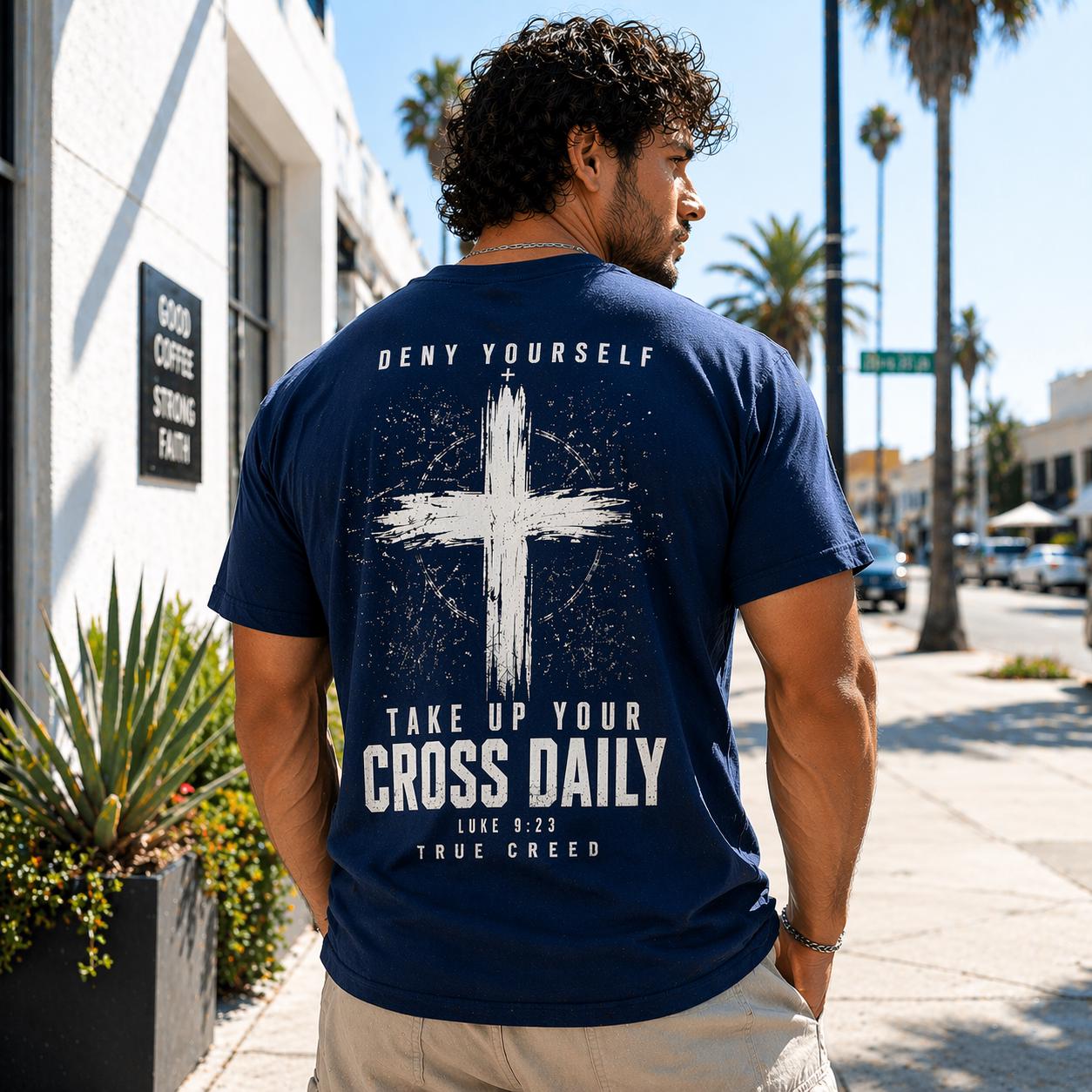 Wear this modern religion-inspired shirt to silently share your convictions, or gift it to someone special to inspire their faith journey. Embrace your spiritual walk with a stylish, understated reminder to take up your cross daily.