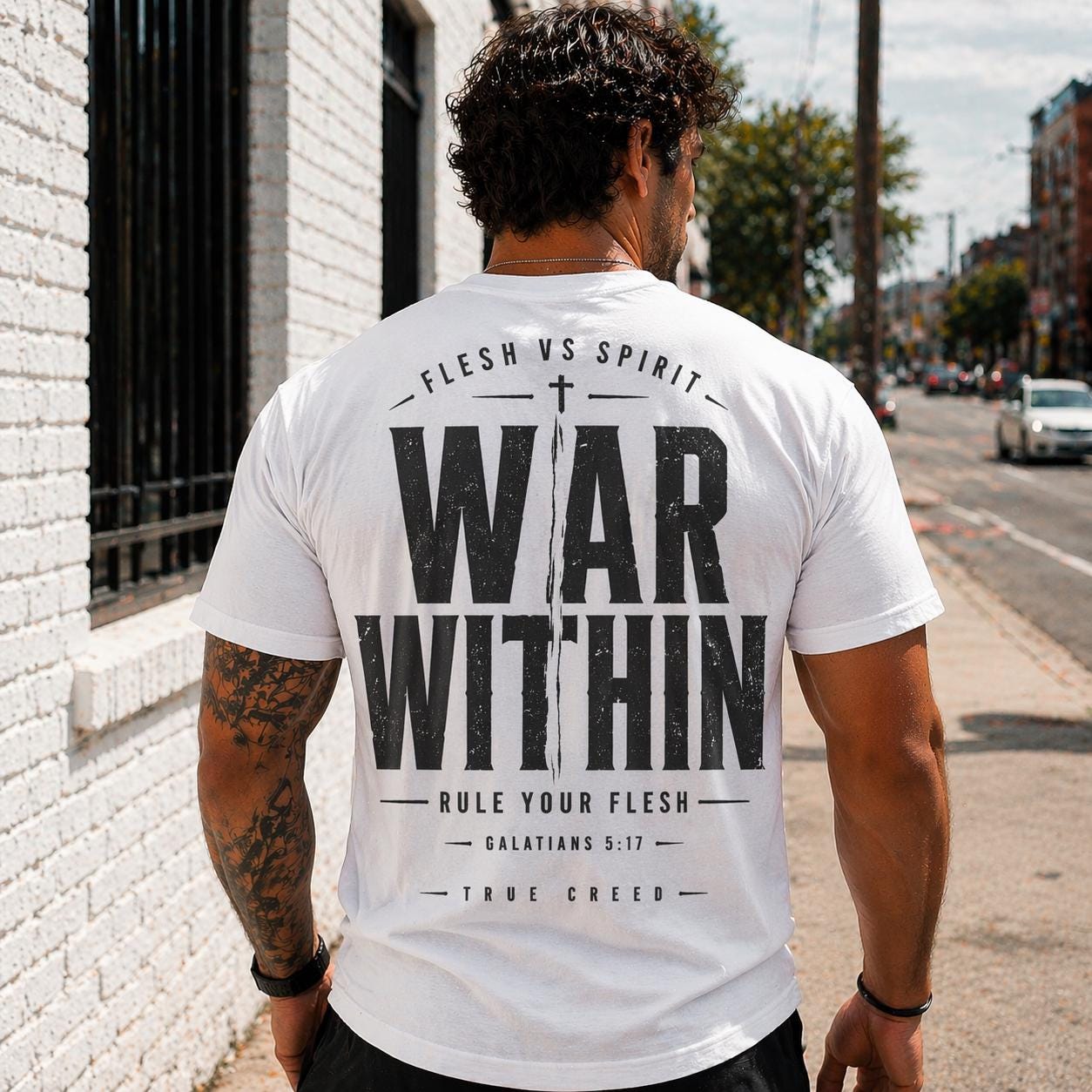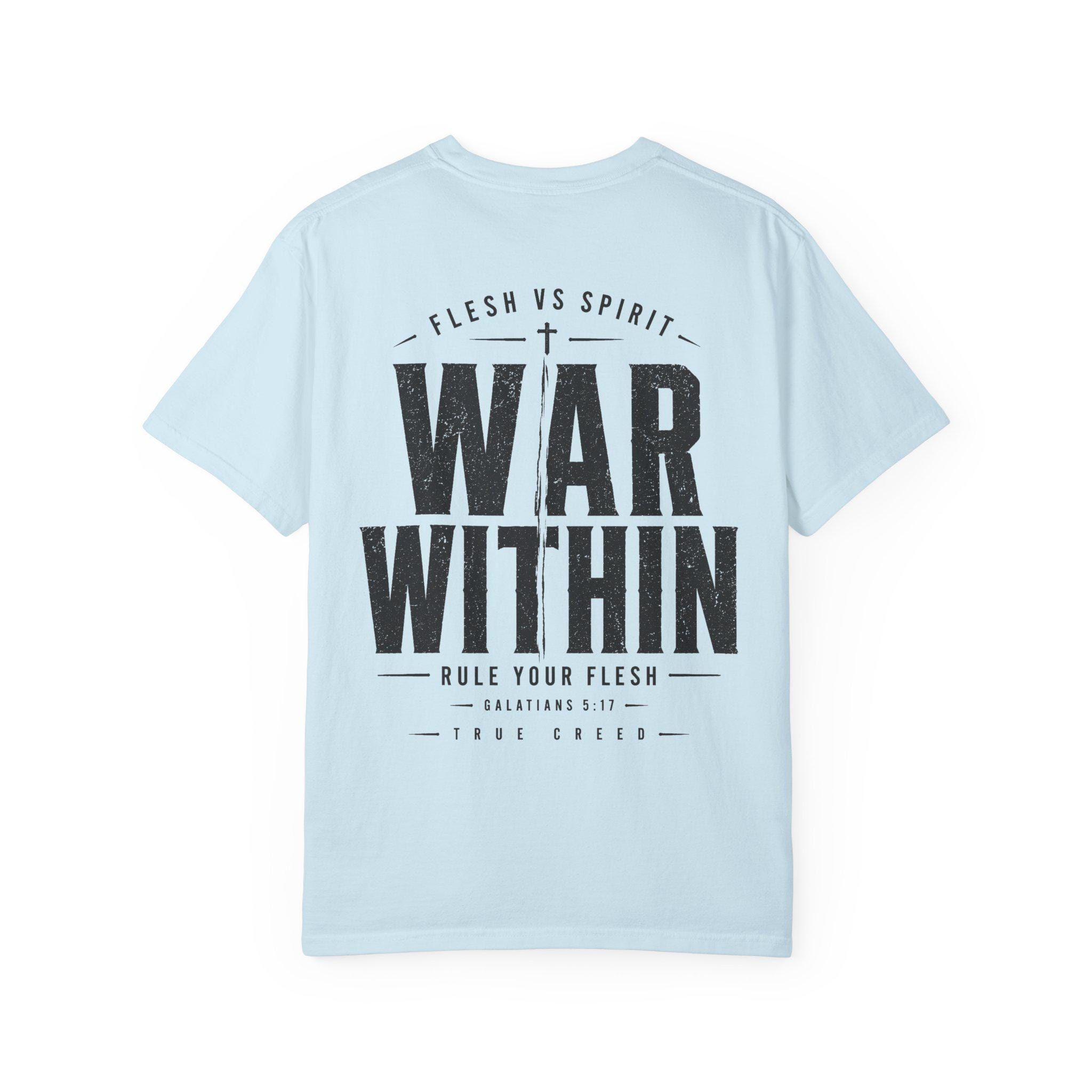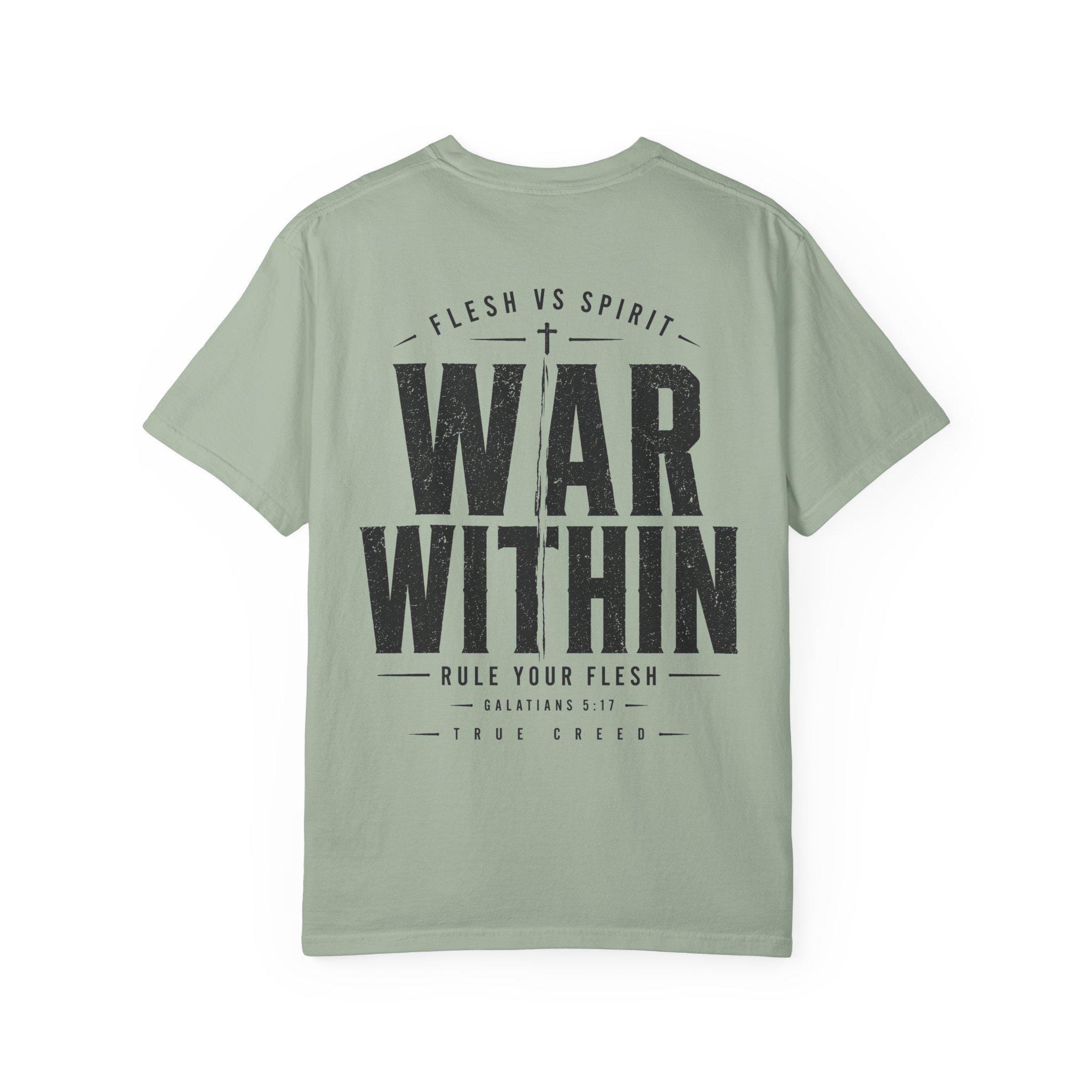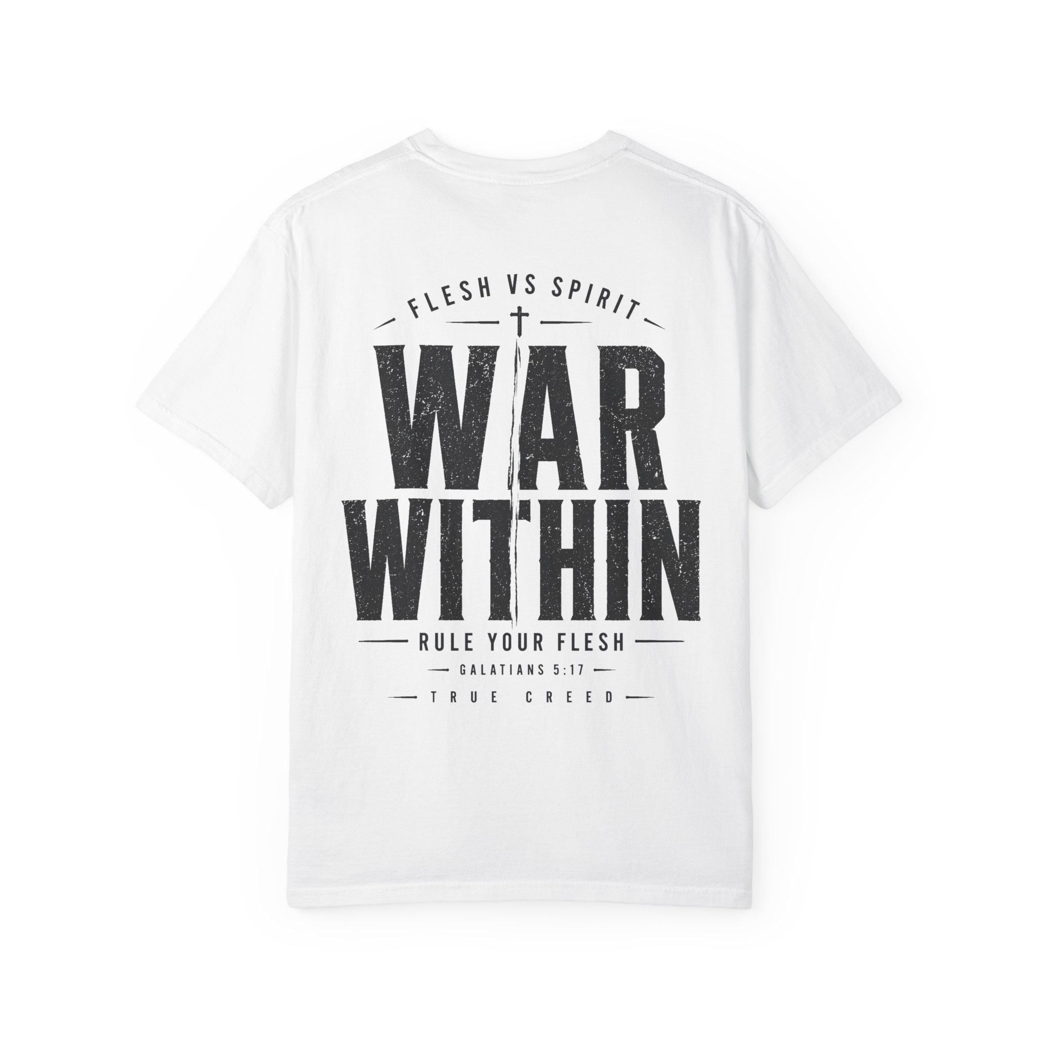 A heavyweight, garment-dyed tee built for quiet conviction. This relaxed-fit shirt carries a minimalist chest emblem and a bold, distressed back print that reads “WAR WITHIN” framed by small scripture cues — a design that speaks to inner struggle and spiritual resolve. The soft, lived-in hand of the garment-dyed cotton and the roomy cut make it comfortable for long days of work, worship, or reflection. Wear it under a jacket or loose with jeans; it sits naturally in wardrobes of people who favor honest, meaningful statements over trends.