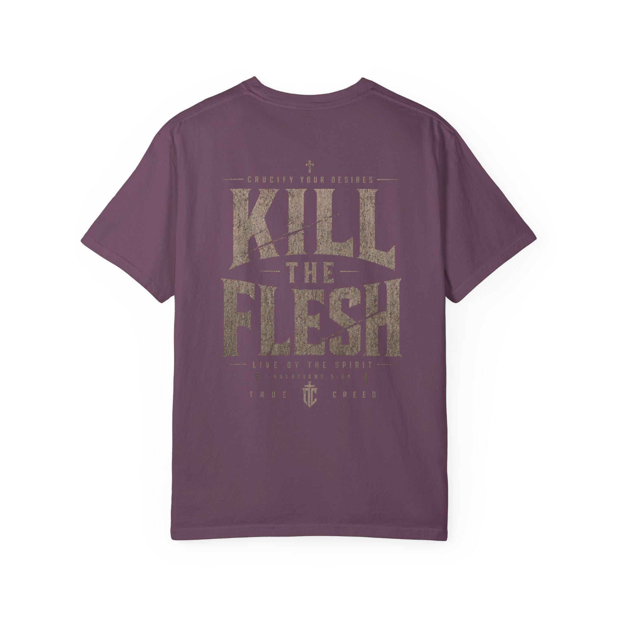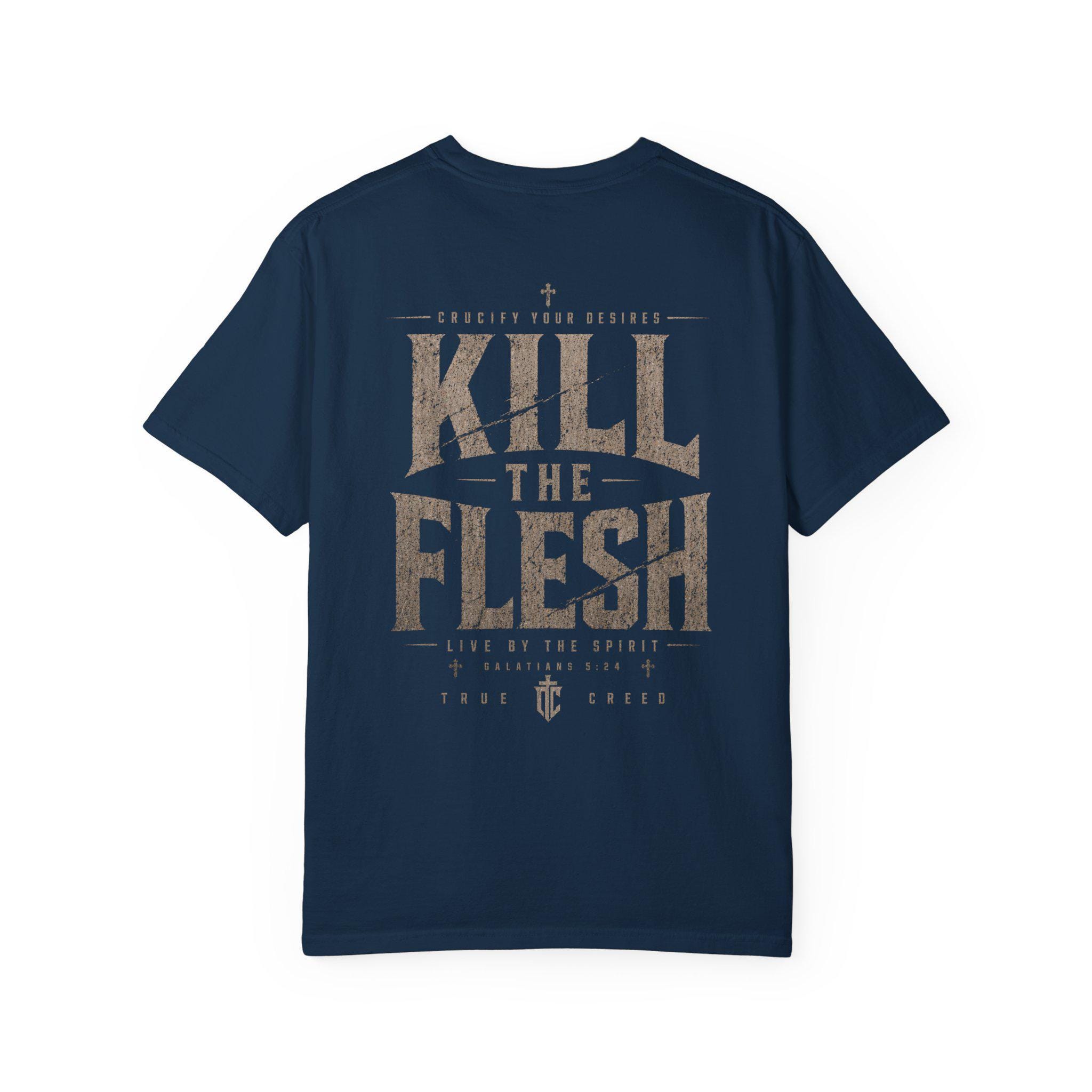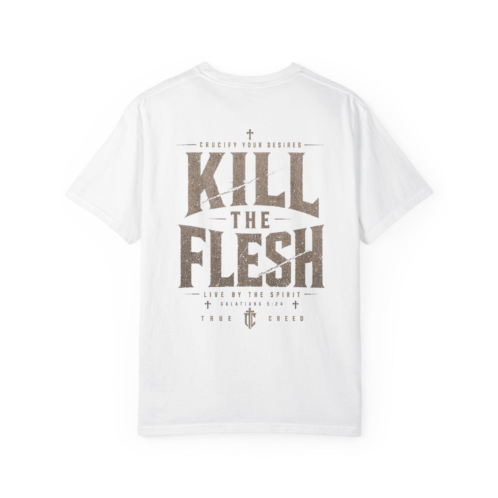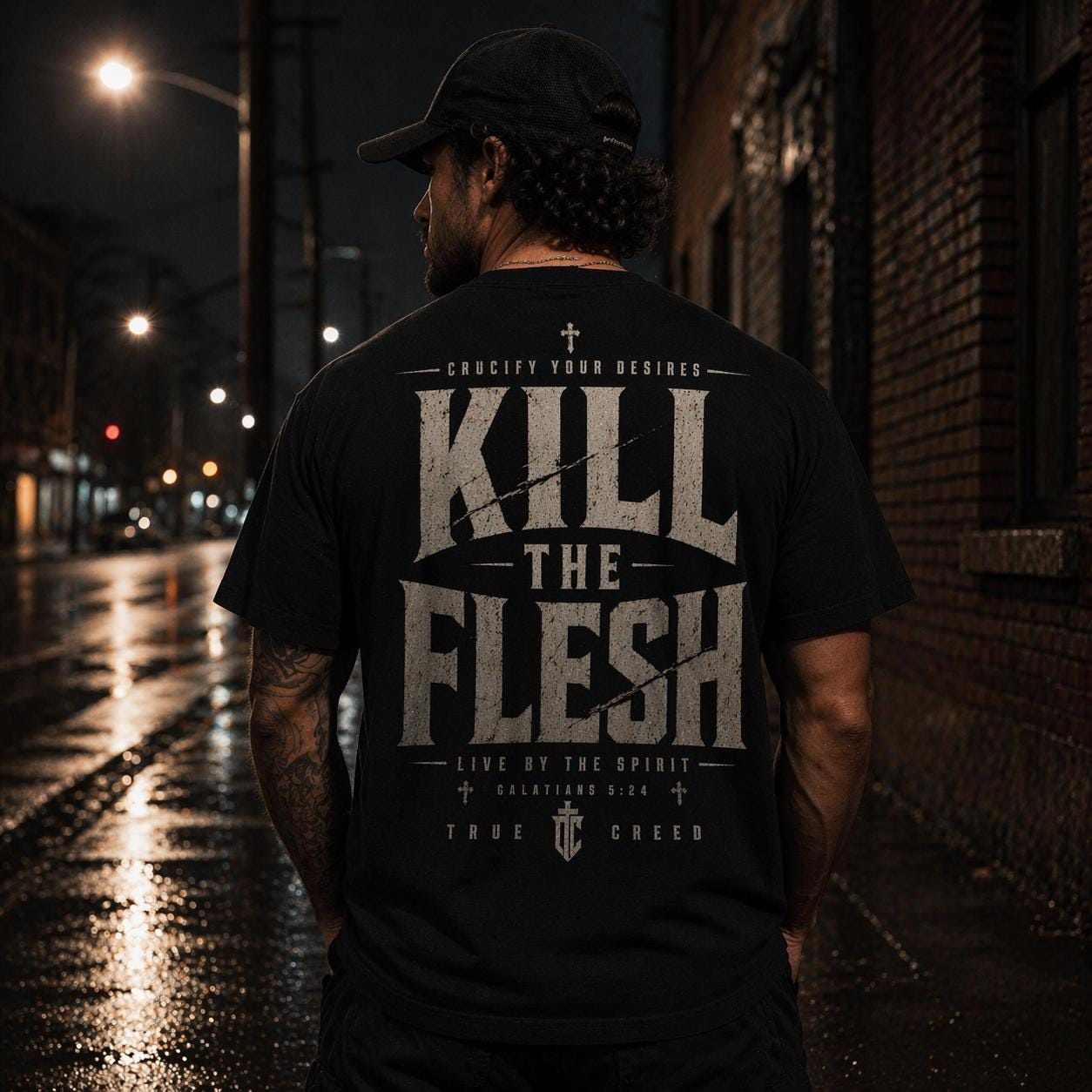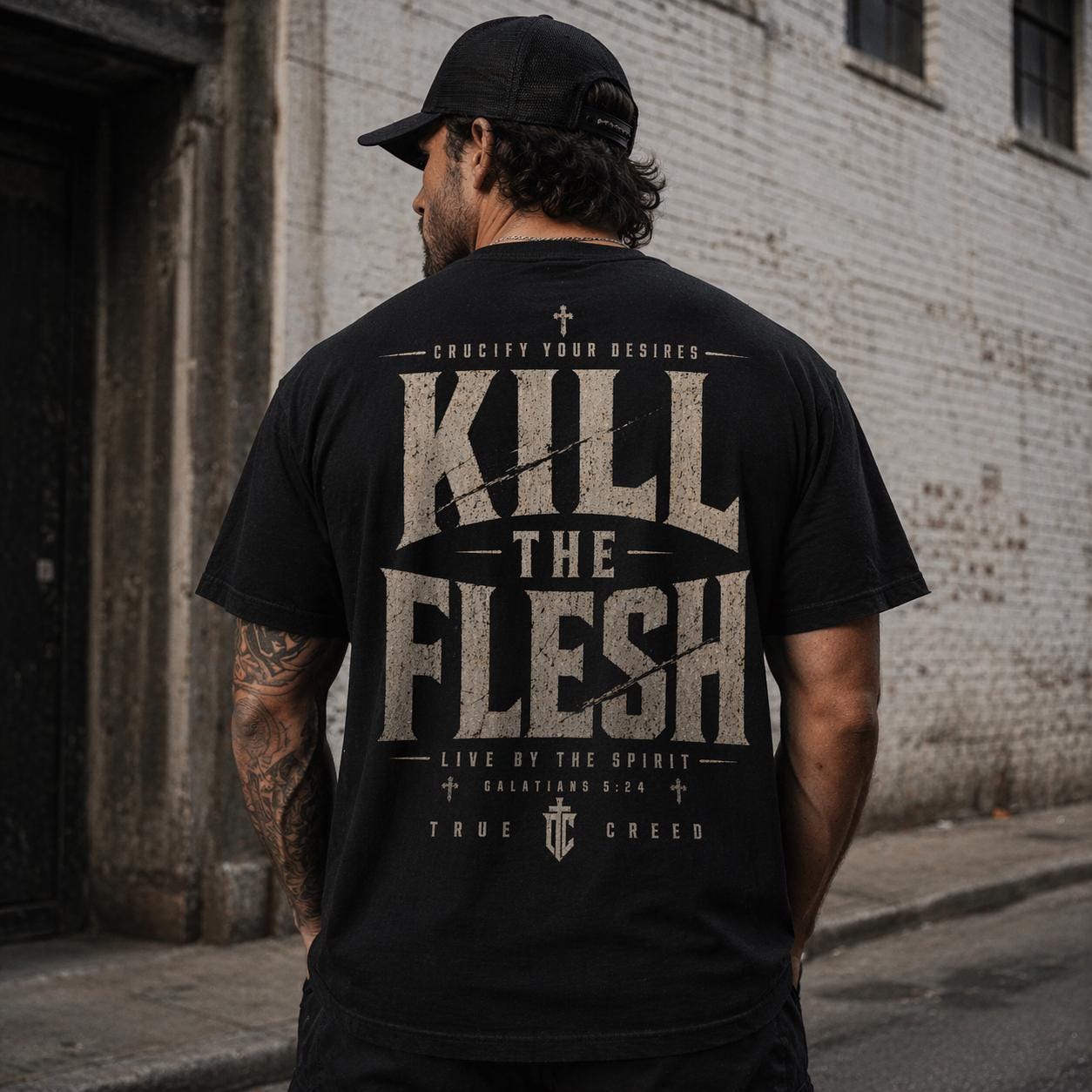 The back of the shirt features a striking, distressed lettering that reads "KILL THE FLESH," surrounded by minimalist crosses and lines—an inspiring and contemplative message rooted in Christian faith. A subtle, matching emblem over the heart adds a touch of understated detail, making this tee versatile for layered styling or standalone wear.
