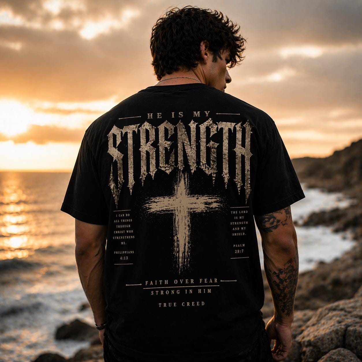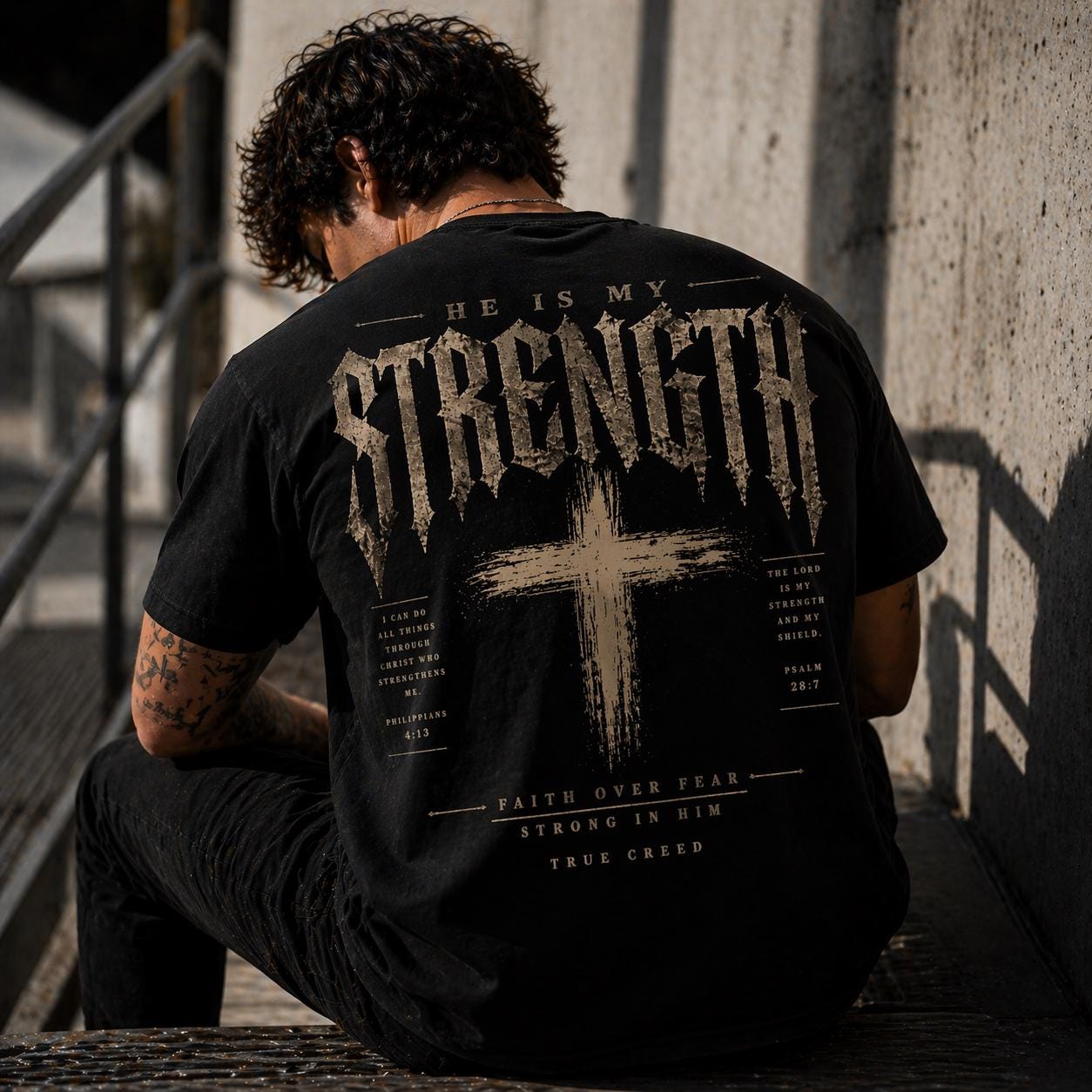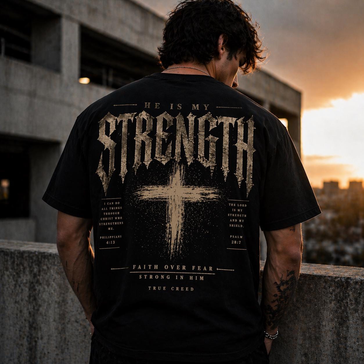 This bold Christian tee features distressed, headline-style lettering spelling out "STRENGTH" across the back, complemented by a textured cross beneath and subtle scripture lines flanking the graphic. The small matching chest emblem keeps the front simple and versatile, making it a perfect addition to your spiritual wardrobe or a meaningful gift for someone special.
