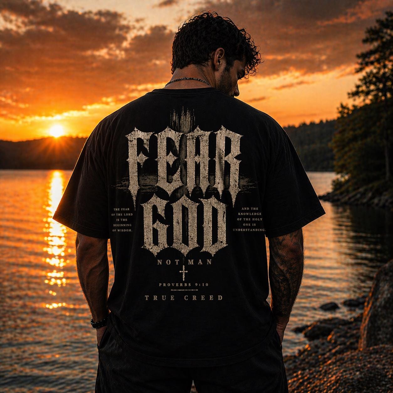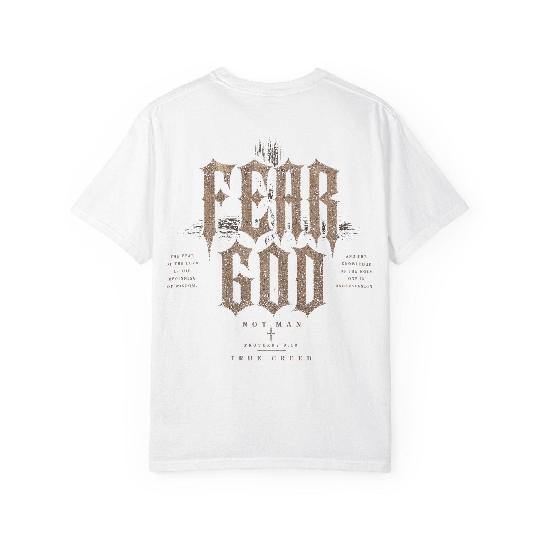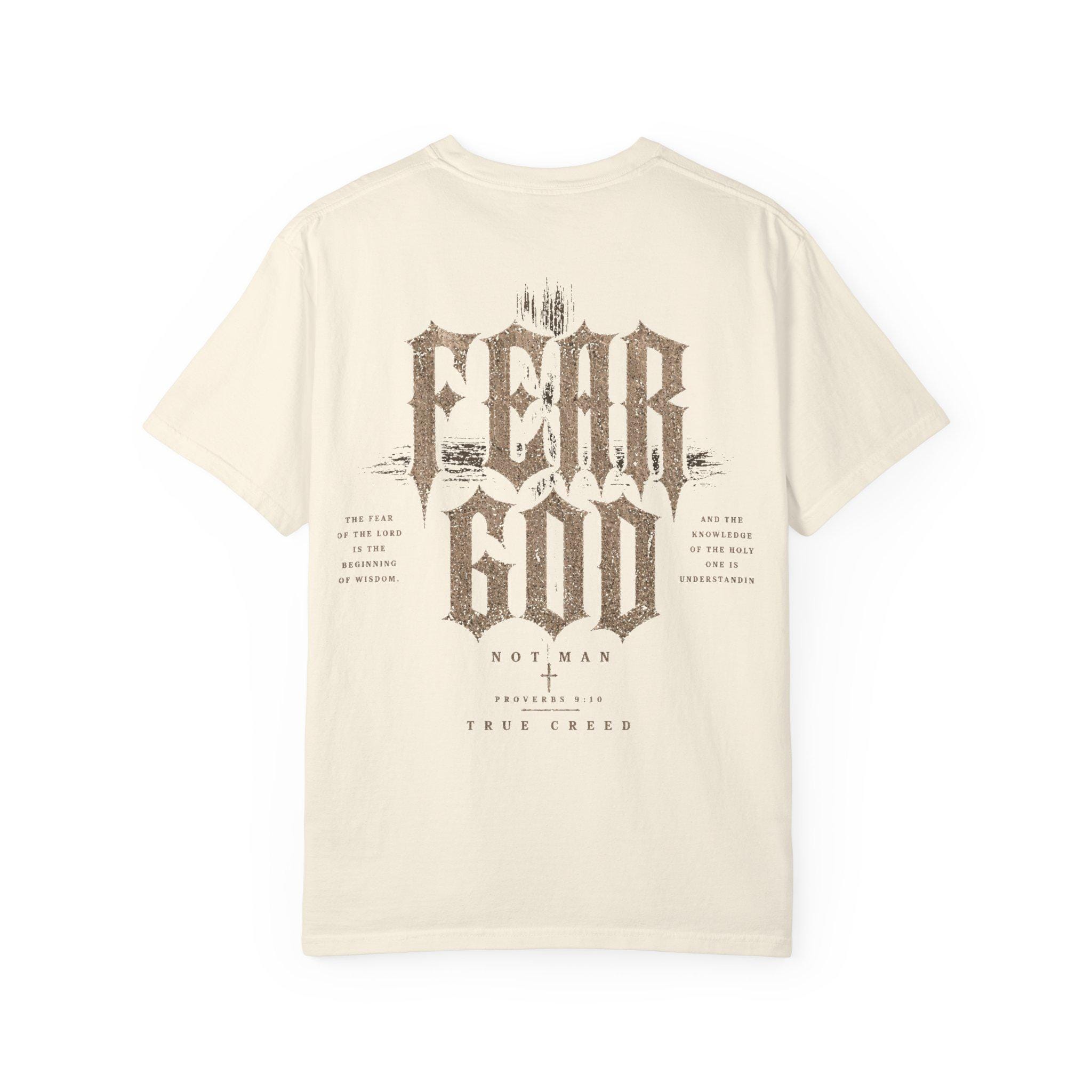 A heavyweight, garment-dyed tee that feels like it’s already lived a hundred meaningful days. The soft, muted dye and relaxed cut create a worn-in silhouette that settles naturally on the shoulders. A small, rugged emblem on the chest pairs with a bold, distressed graphic across the back that reads “FEAR GOD” in vintage-inspired typography, layered with subtle texture and symbolic motifs. This shirt carries a quiet, reverent edge — made to be worn to late-night bonfires, church youth nights, or when you want your faith expressed with grit rather than gloss. The thick, ring-spun cotton and reinforced seams give it real staying power; the sewn-in label and tubular knit keep the look clean and timeless. If they’re into faith-forward streetwear with a lived-in feel, this tee becomes part of the rotation fast.